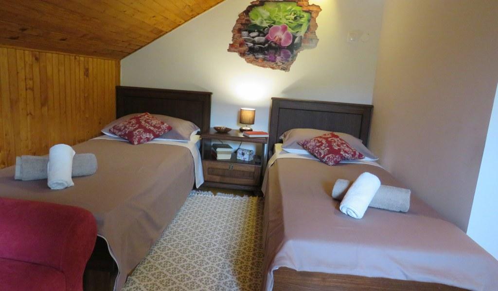 Počitniška hiša popolnoma opremljena in opremljena, ki se nahaja na pobočju gore Kalnik v mirnem okolju. Na dvorišču je žar in terasa obdana z vinogradi s pogledom na dolino. Na dvorišču je tudi otroško igrišče in brezplačno parkirišče. V pritličju je kuhinja, jedilnica z dnevno sobo s kaminom in TV, kopalnica s tušem (sušilec za lase), predsoba in balkon s pogledom na dvorišče in okoliške pokrajine. Podstrešje ima dve spalnici (TV) s pogledom na goro in staro mesto (utrdba) ter dolino. Balkoni so opremljeni s sedeži. V kleti je degustacija vina in žganja, ki jih je pripravil gostitelj. V prenočišču je na voljo brezplačen WiFi. Hišni ljubljenčki so dovoljeni in brezplačno. Nepremičnina se nahaja 5 minut hoje do središča vasi (trgovine, kavarne, cerkve, zdravstveni domovi ....) in 15 do 20 minut hoje do starega mesta, planinske koče (restavracija) in pohodniških poti, sprehodov v naravi, plezanja po skalah itd.