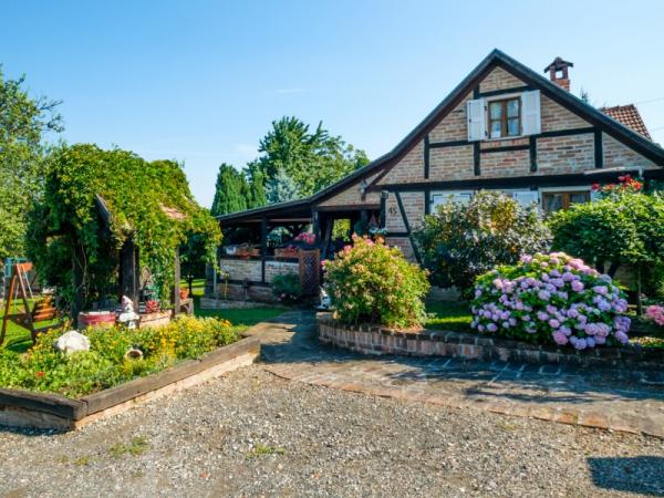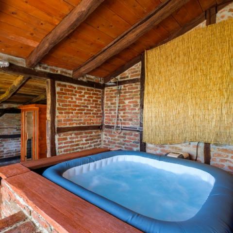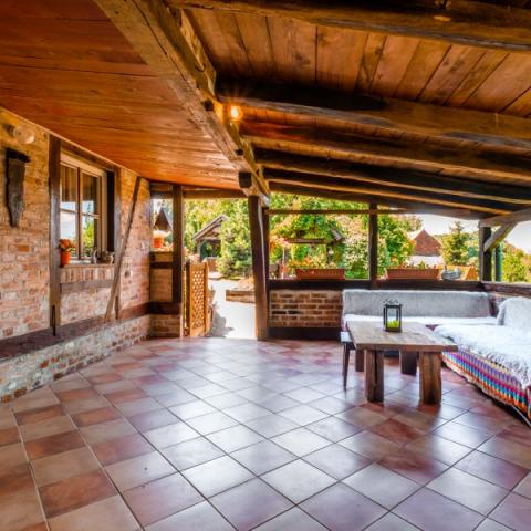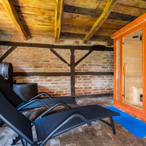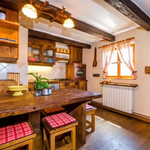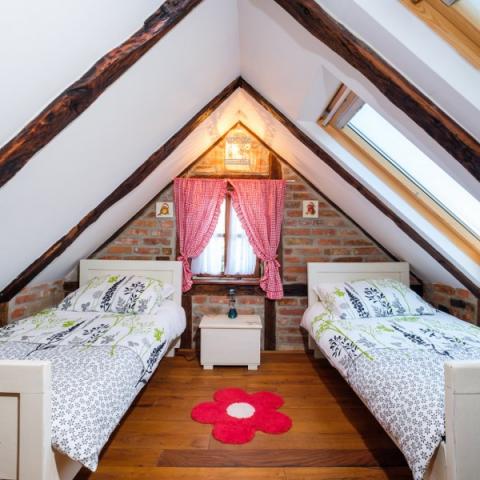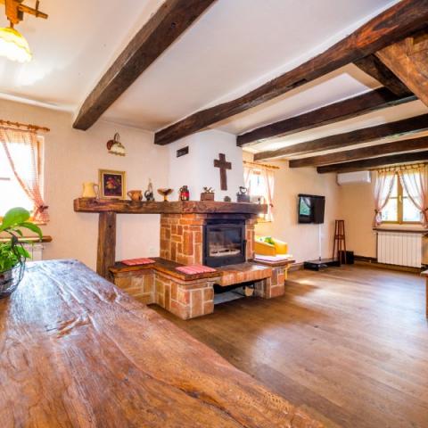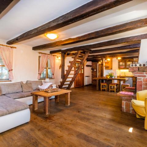 Hiša je zgrajena iz hrastovih in rdečih opek, obnovljena z veliko ljubezni in je zdaj odlična kombinacija tradicije in udobja. Na podstrešju je odprt prostor z zakonsko posteljo in soba z dvema manjšima posteljama. Vidni tramovi in opeke dajejo poseben čar. Prostorno pritličje obsega kuhinjo, dnevno sobo, 1 spalnico in skupno kopalnico. V središču bivanja je velik kamin, pred katerim je kotna postelja, ki lahko služi kot 2 dodatna ležišča. Tukaj je TV in projektor. Majhna, ročno izdelana kuhinja vsebuje vse, kar potrebujete: kuhalna plošča, posoda, pomivalni stroj, kuhalnik in jedilni pribor, sklede in lonci. Nekateri oskrbe, kot so sol, poper, moka, riž, olje ... vas vedno pozdravljajo. Za spalnico je zakonska postelja in skupna kopalnica s tuš kabino, pralnim strojem in sušilcem. Povezana s hišo je prostorna terasa z veliko mizo, klopi in žar na žaru. Prostrani vrt, gugalnice, mali sadovnjak so le nekatere zunanje vsebine.