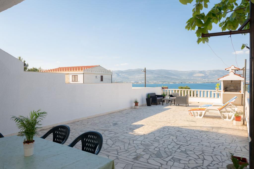 Kamnita hiša pritličje in tri nadstropja z veliko teraso in kaminom 70m od morja. Prvo in drugo nadstropje ali prvo in drugo stanovanje se oddajajo. Oba apartmaja sta enakovredno opremljena in vključujeta spalnico, dnevno sobo z raztegljivim kavčem, kuhinjo z vsem, kar je potrebno za pripravo hrane, vključno z mikrovalovno pečico, kopalnico in balkon s čudovitim pogledom na morje. Na zahtevo je na voljo dodatno ležišče in prenosna otroška posteljica. Neomejen internet, pametna satelitska TV. Klimatska naprava brez doplačila.