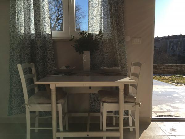 Apartma Dulcis Domus se nahaja v vasi Bale med Rovinjem in Puljom. Miren kraj do Rovinja 13 kilometrov, Pula 15 km. Na obali morja, ki je oddaljena 6,6 km, sta dva sodobno urejena kampa s plažami. Za goste hotela Dulcis Domus je vhod v kamp je brezplačen. Apartma ima 35 m2, teraso z vrtno garnituro, ločen vhod in brezplačno parkirišče neposredno ob apartmaju na javnem parkirišču. Apartma je moderno opremljen, ima satelitsko televizijo in brezplačen WiFi. Za vse dodatne storitve in informacije so gostitelji vedno na voljo za pomoč. Apartma se nahaja v pritličju in ima pogled na staro mesto Bale.
