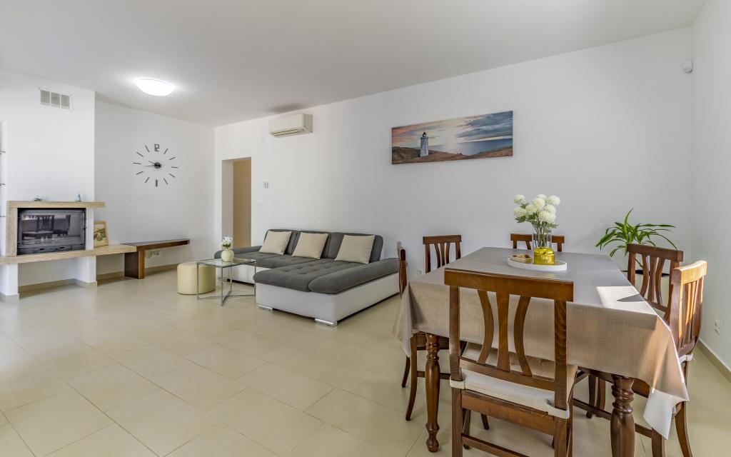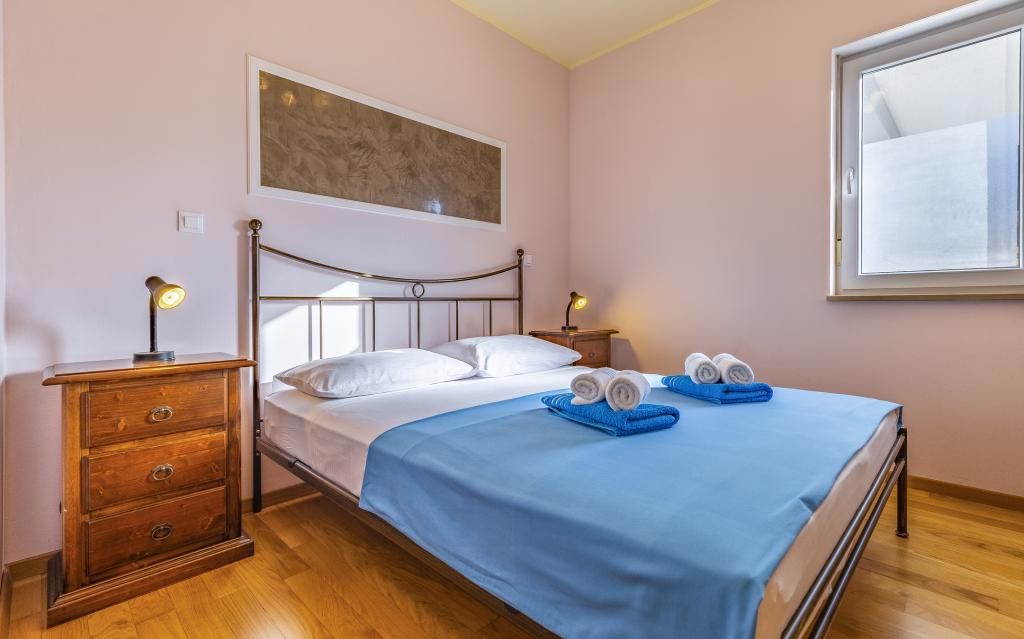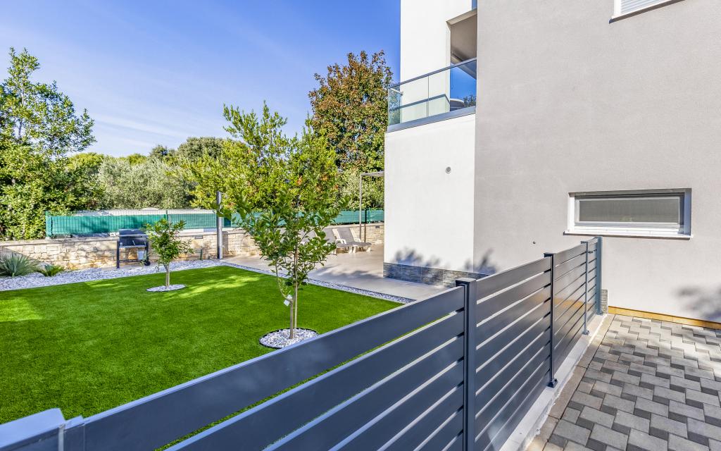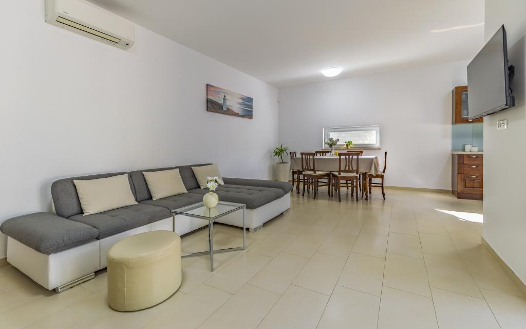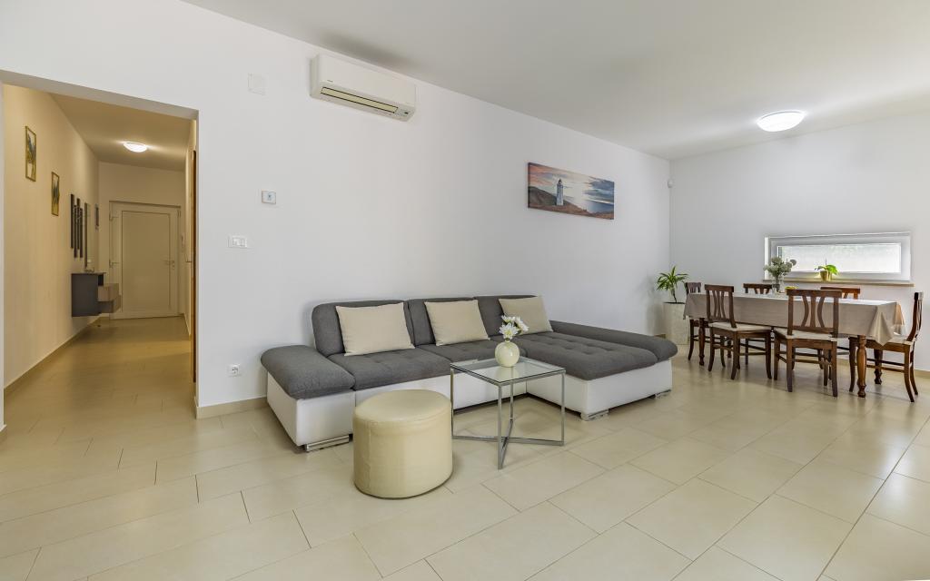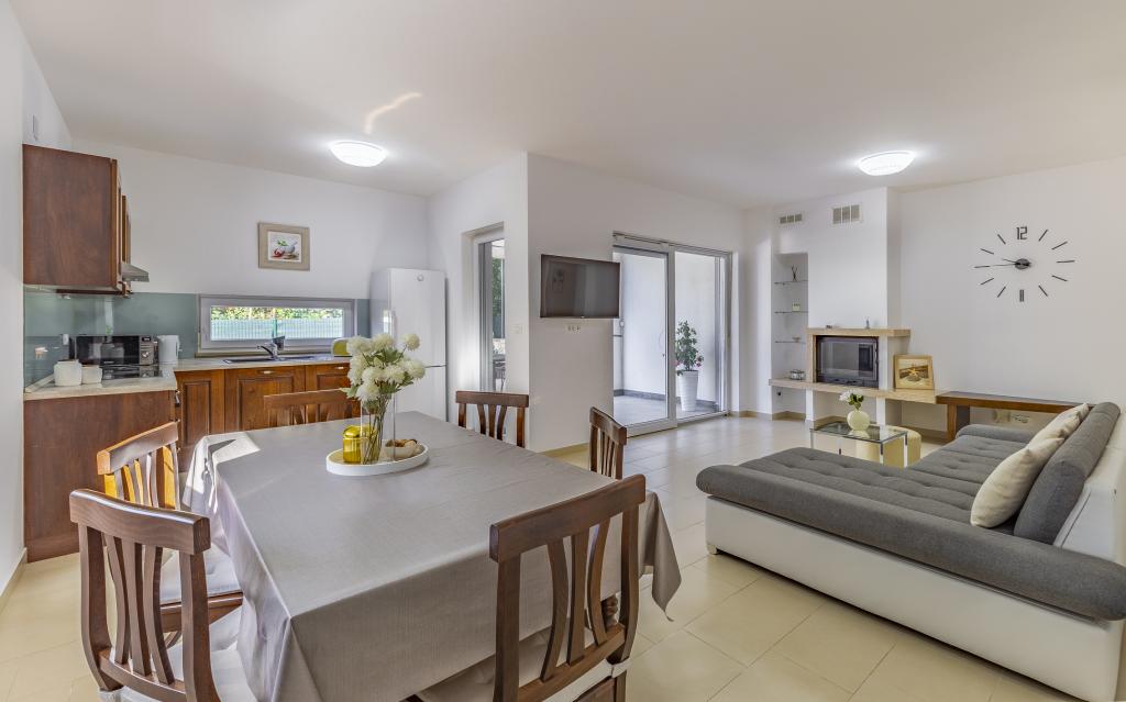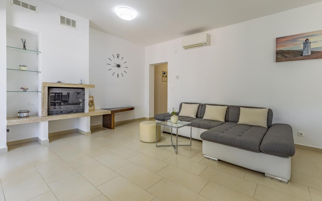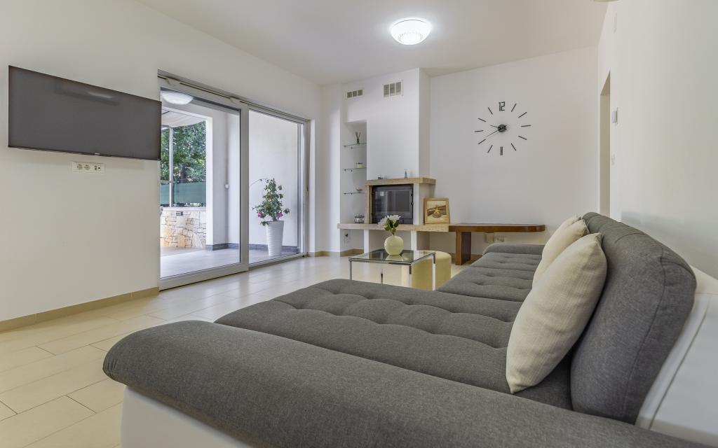 Popolnoma in nadstandardno opremljeno stanovanje (80 m2) na odlični lokaciji v mirnem delu Banjola, le 5 minut (300 m) hoje do najlepših plaž v okolici. Stanovanje se nahaja v pritličju stanovanjske stavbe s samo tremi stanovanji. Stanovanje ima zasebni vrt (100 m2) s teraso, mizo, ležalniki, zunanjim tušem in žarom, ki omogoča prijetno druženje z veliko zasebnosti in je še posebej primerno za družine z otroki. Ob stavbi je zasebno parkirišče z neposrednim dostopom do vrta in terase. Vrt je bil leta 2024 popolnoma prenovljen. Celotna stavba je zaščitena z varnostno ograjo (dostop s kartico). Stanovanje ima 2 spalnici z zakonsko posteljo, 2 kopalnici z WC-jem in tušem, prostorno dnevno sobo z raztegljivim kavčem, jedilnico in kuhinjo. Stanovanje je klimatizirano in pozimi ogrevano (talno ogrevanje) ter ima notranji kamin, zato je primerno tudi za bivanje v hladnejših jesensko-zimskih mesecih. V neposredni bližini apartmaja se nahajajo številni bari in restavracije ter urejene trgovine.