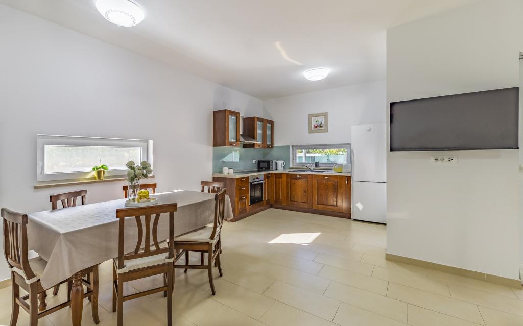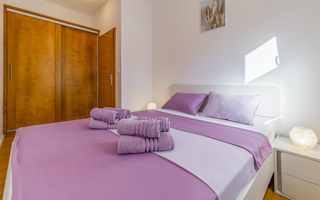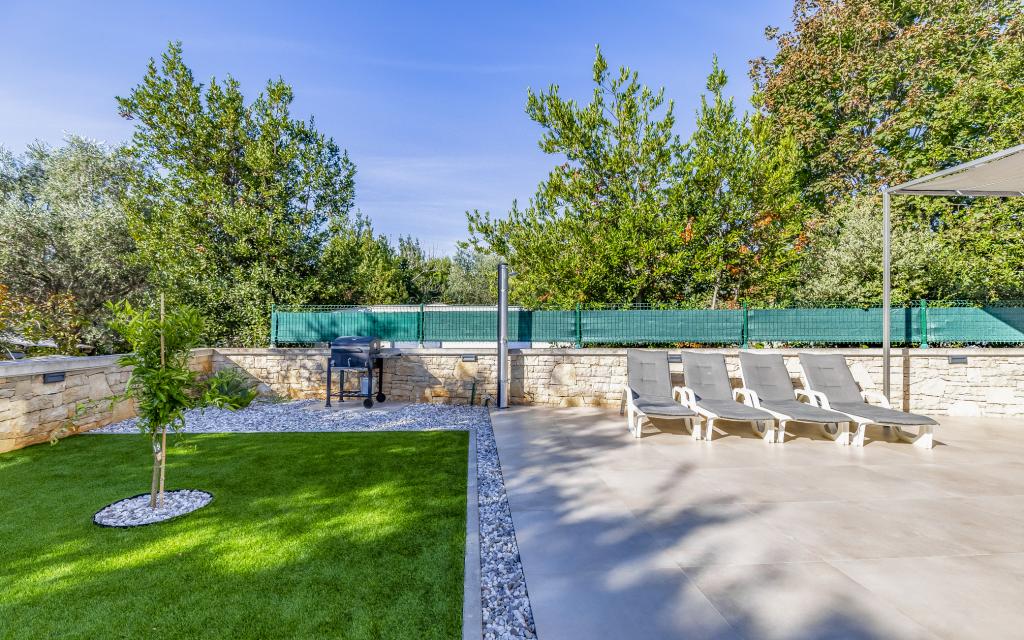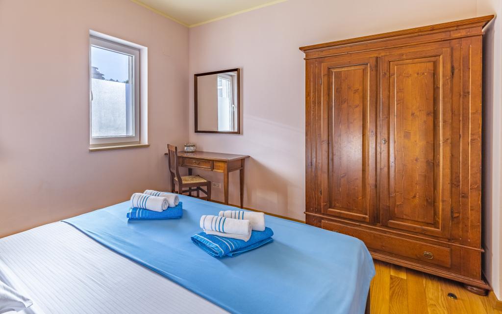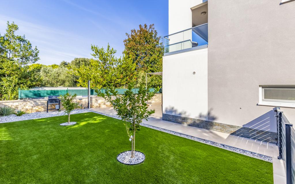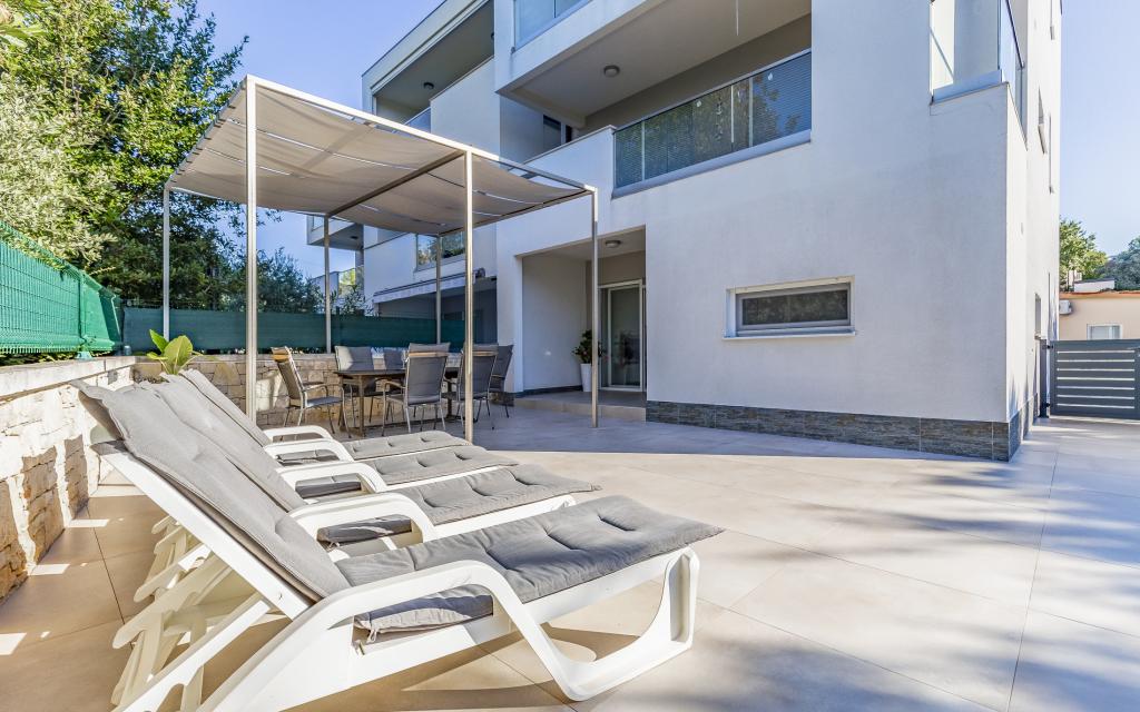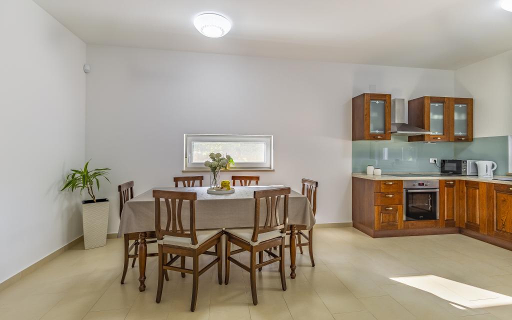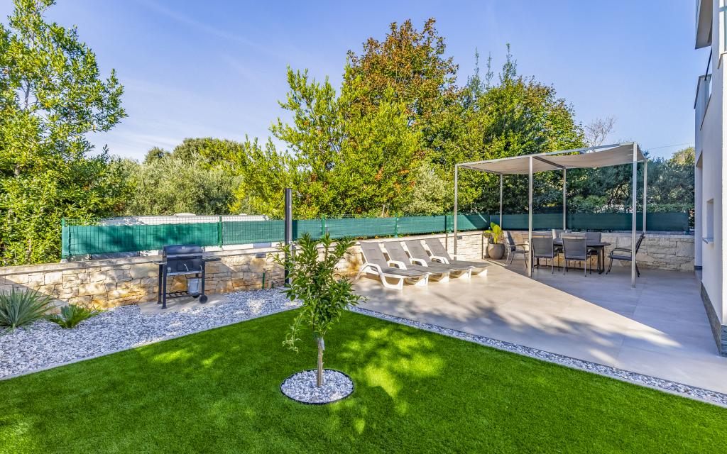 Popolnoma in nadstandardno opremljeno stanovanje (80 m2) na odlični lokaciji v mirnem delu Banjola, le 5 minut (300 m) hoje do najlepših plaž v okolici. Stanovanje se nahaja v pritličju stanovanjske stavbe s samo tremi stanovanji. Stanovanje ima zasebni vrt (100 m2) s teraso, mizo, ležalniki, zunanjim tušem in žarom, ki omogoča prijetno druženje z veliko zasebnosti in je še posebej primerno za družine z otroki. Ob stavbi je zasebno parkirišče z neposrednim dostopom do vrta in terase. Vrt je bil leta 2024 popolnoma prenovljen. Celotna stavba je zaščitena z varnostno ograjo (dostop s kartico). Stanovanje ima 2 spalnici z zakonsko posteljo, 2 kopalnici z WC-jem in tušem, prostorno dnevno sobo z raztegljivim kavčem, jedilnico in kuhinjo. Stanovanje je klimatizirano in pozimi ogrevano (talno ogrevanje) ter ima notranji kamin, zato je primerno tudi za bivanje v hladnejših jesensko-zimskih mesecih. V neposredni bližini apartmaja se nahajajo številni bari in restavracije ter urejene trgovine.