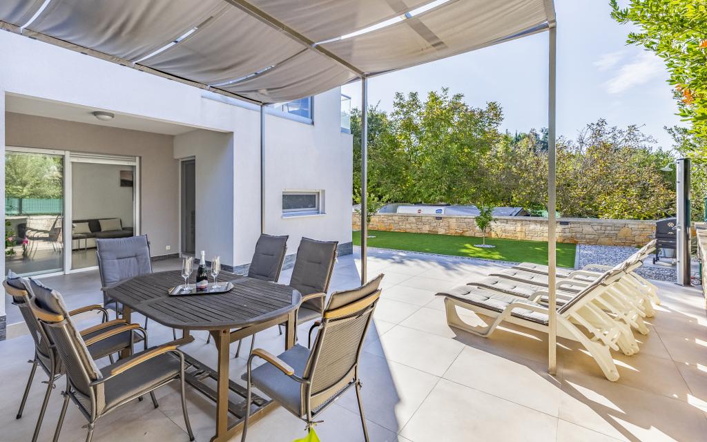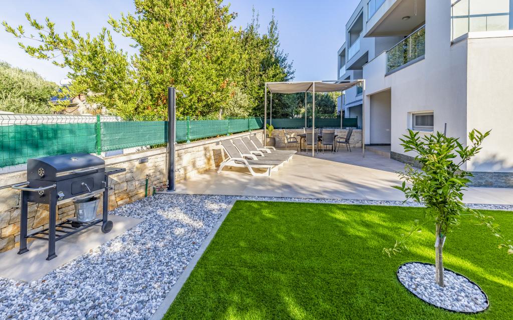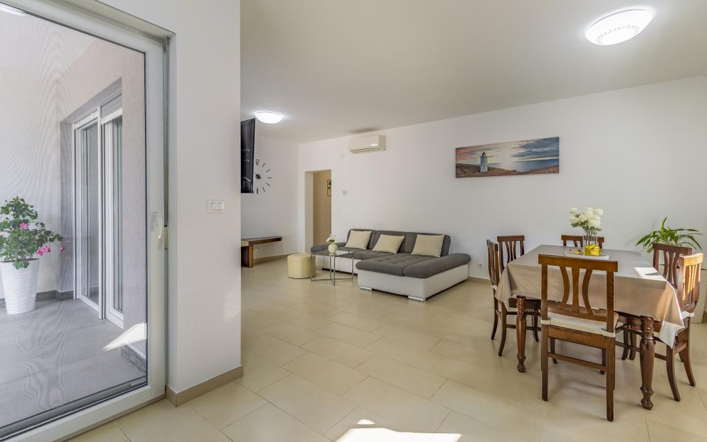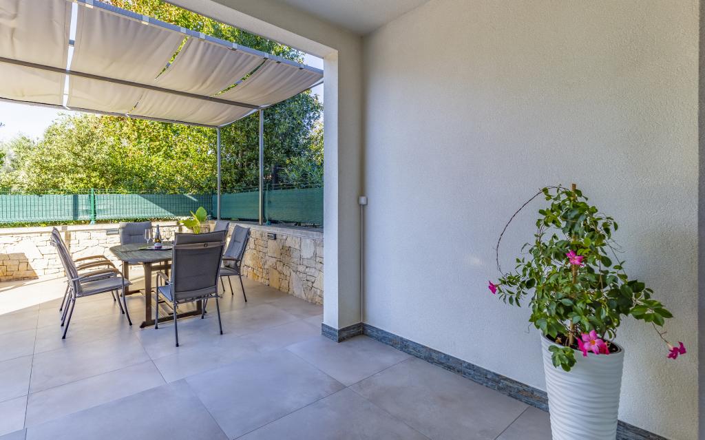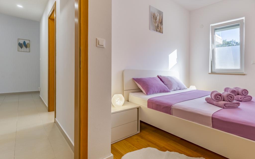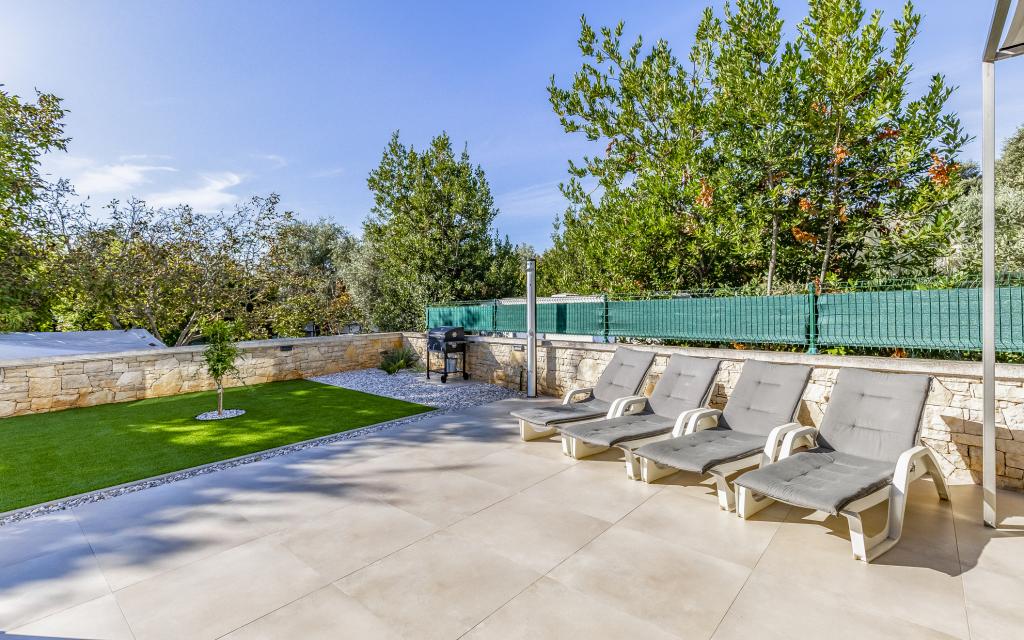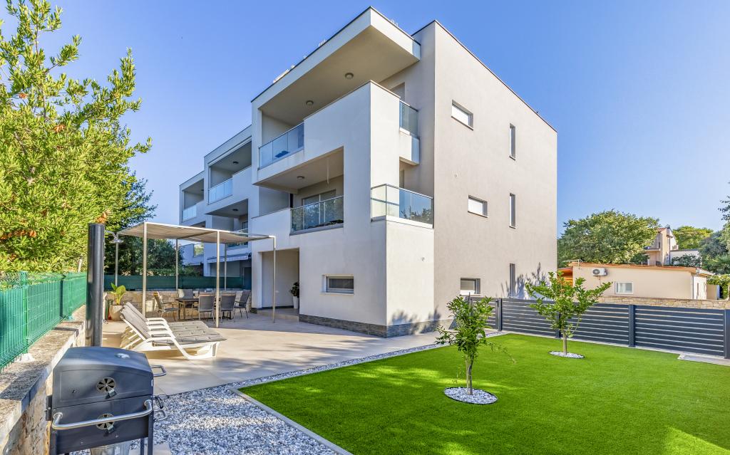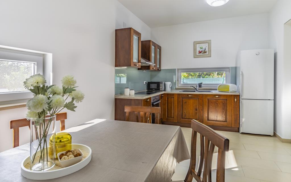 Popolnoma in nadstandardno opremljeno stanovanje (80 m2) na odlični lokaciji v mirnem delu Banjola, le 5 minut (300 m) hoje do najlepših plaž v okolici. Stanovanje se nahaja v pritličju stanovanjske stavbe s samo tremi stanovanji. Stanovanje ima zasebni vrt (100 m2) s teraso, mizo, ležalniki, zunanjim tušem in žarom, ki omogoča prijetno druženje z veliko zasebnosti in je še posebej primerno za družine z otroki. Ob stavbi je zasebno parkirišče z neposrednim dostopom do vrta in terase. Vrt je bil leta 2024 popolnoma prenovljen. Celotna stavba je zaščitena z varnostno ograjo (dostop s kartico). Stanovanje ima 2 spalnici z zakonsko posteljo, 2 kopalnici z WC-jem in tušem, prostorno dnevno sobo z raztegljivim kavčem, jedilnico in kuhinjo. Stanovanje je klimatizirano in pozimi ogrevano (talno ogrevanje) ter ima notranji kamin, zato je primerno tudi za bivanje v hladnejših jesensko-zimskih mesecih. V neposredni bližini apartmaja se nahajajo številni bari in restavracije ter urejene trgovine.