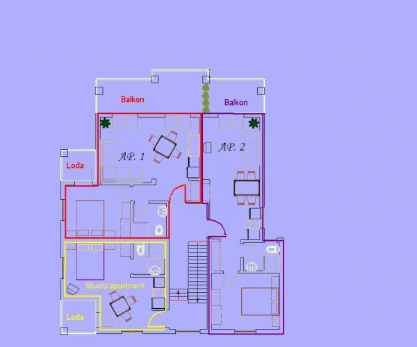 Apartmaji s pogledom na morje, plače, in otoke, se nahaja v prvem nadstropju hiše, ki se nahaja na mirni lokaciji v Baški Vodi na hribčku imenuje Gradina 20 m nadmorske višine, 30 m od morja, 2 -3 min od najlepše plaže in 5 minut od centra Baške Vode. Privatno parkirišče pred hišo.