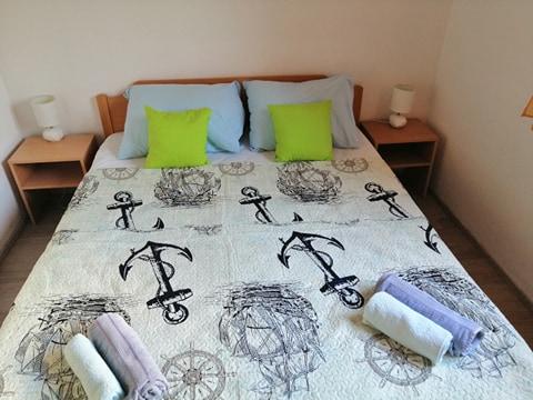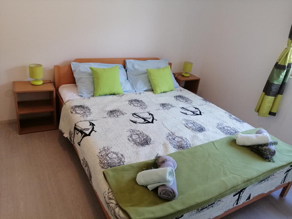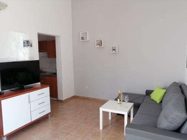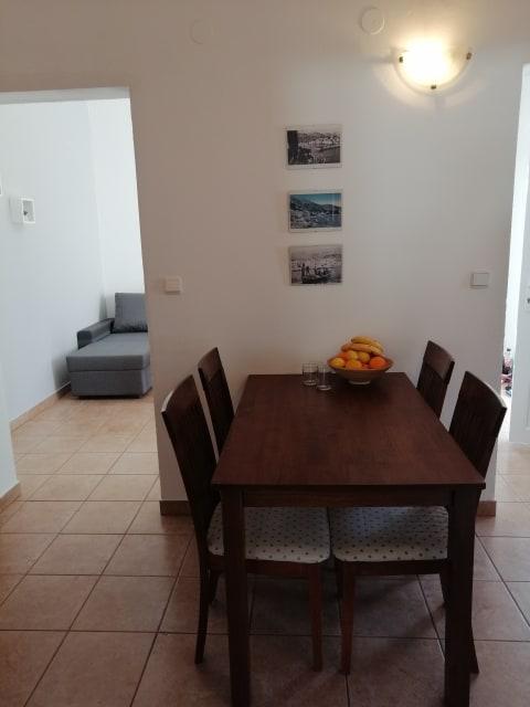 Odlična lokacija. Zelo prostorno stanovanje. Zelo dobro razmerje med ceno in kakovostjo. 70 eur / dan za 4 osebe med 5. 11. 11. 2021. Opremljena kuhinja. Čiste in dovolj brisač. Stanovanje je v 1. nadstropju z ločenim vhodom, prostorno teraso. Oddaljenost od morja je približno 5-7 minut peš. Parkirišče je vključeno v ceno (to je velika prednost, saj je cena na tem območju nekje med 5-10 evri na dan)
