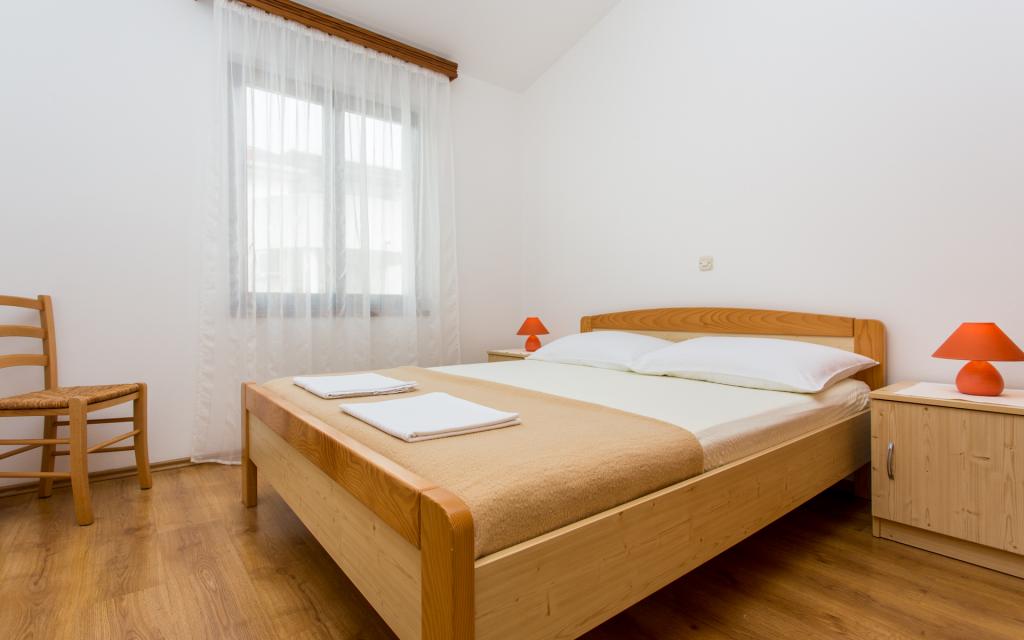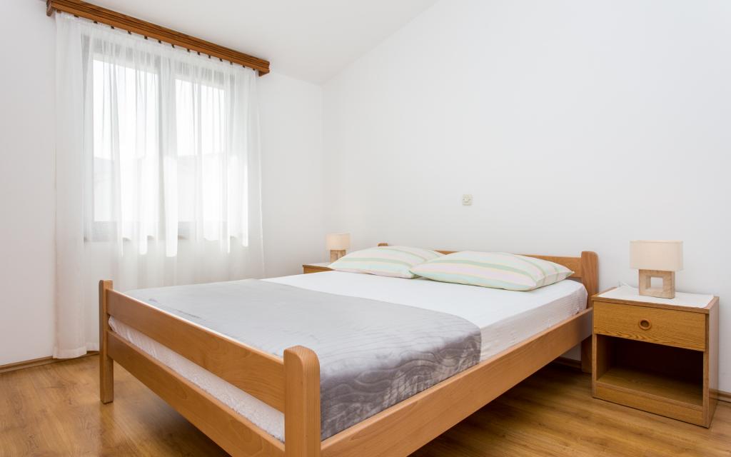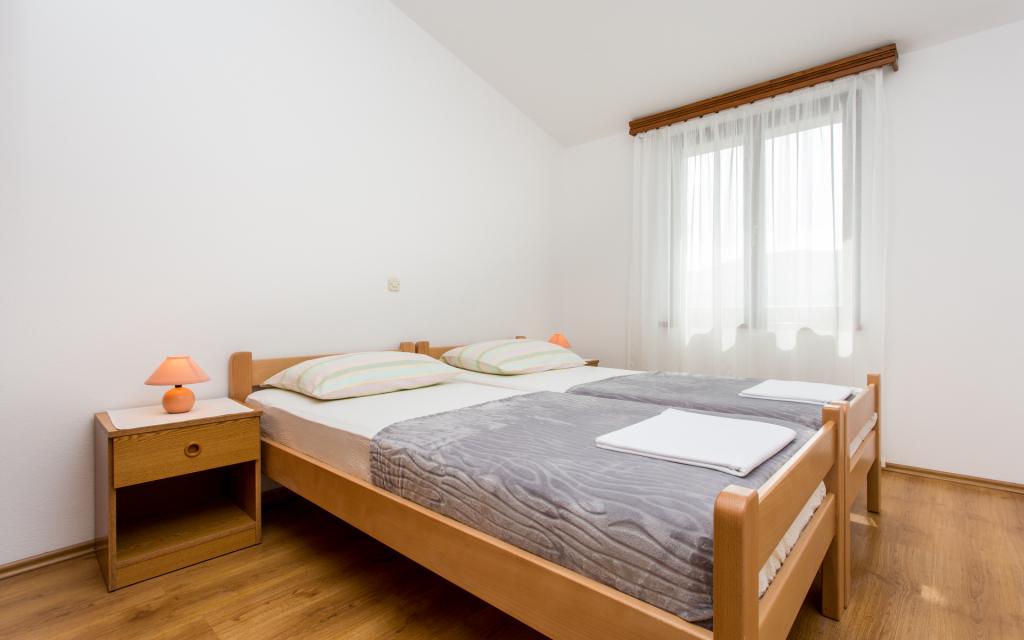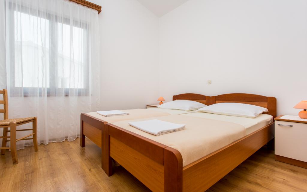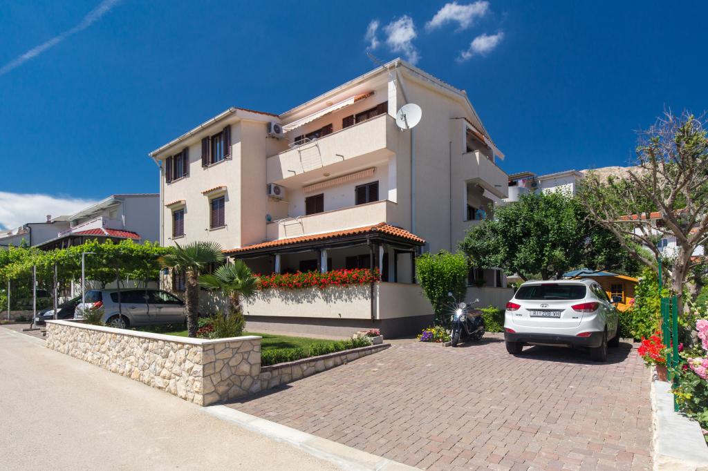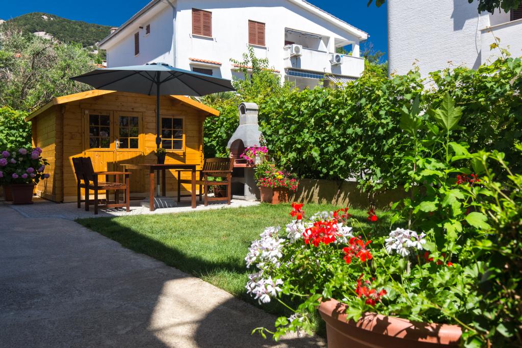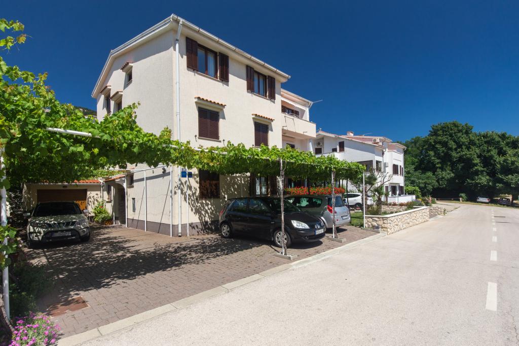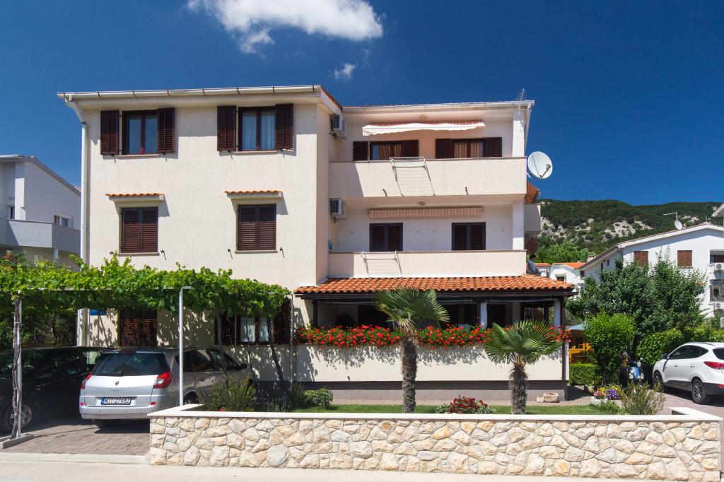 Naša hiša ima pritličje in dve nadstropji, v prvem in drugem nadstropju so apartmaji. Vsak apartma je sestavljen iz 2 spalnic, dnevne sobe s satelitsko televizijo, kuhinje z jedilnim kotom, kopalnice s kadjo s tušem, balkona z zunanjim pohištvom. Na dvorišču imamo lep vrt, ki ga radi pospravimo. Imamo lepo teraso z žarom, ki je idealna za druženje zvečer. Vsem gostom je na voljo terasa z žarom. Na dvorišču ponujamo tudi parkirišče za avtomobile. Že vrsto let najamemo stanovanja. Prizadevamo si, da bi gostom zagotovili udobno bivanje v naši hiši. Vedno smo pripravljeni pomagati. Trudimo se, da so stanovanja zelo urejena in vedno skušamo kaj izboljšati. Naša hiša se nahaja v osrednjem delu Baške, idealna za počitnice. V naši soseski je mirno in prometa ni veliko. Je stran od hrupa in spet je le 10 minut hoje do plaže, prva trgovina, pekarna, banka. .