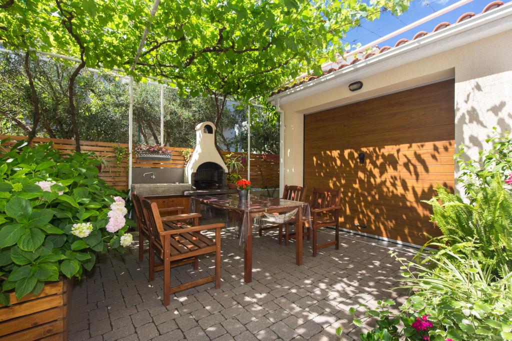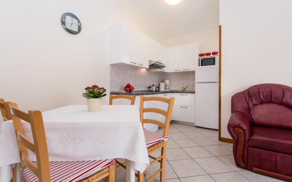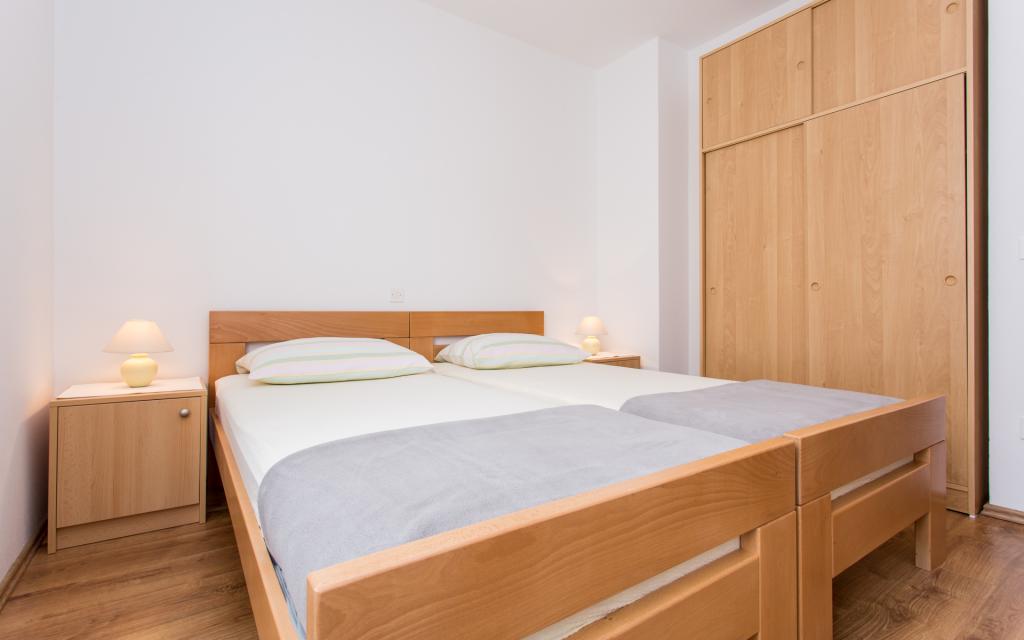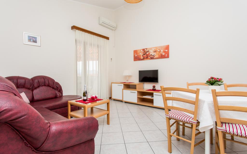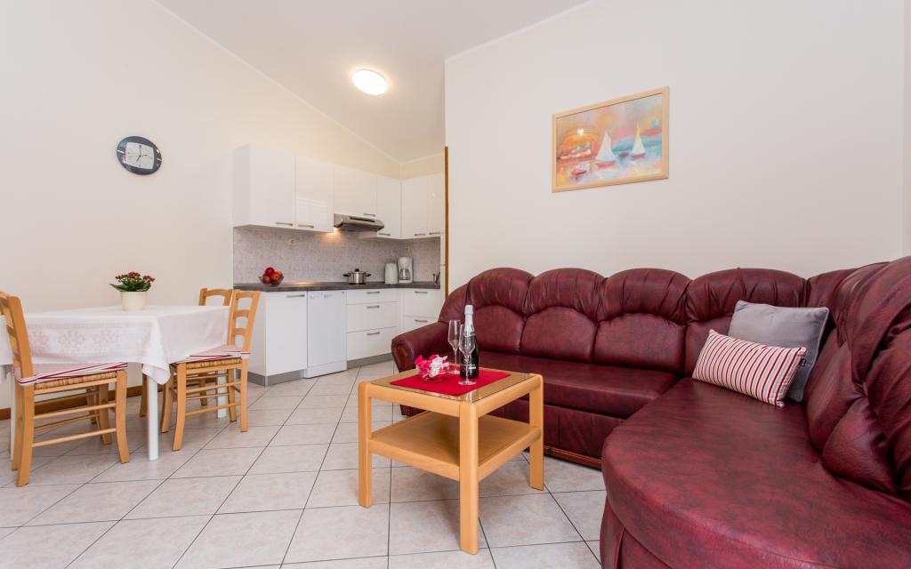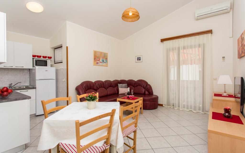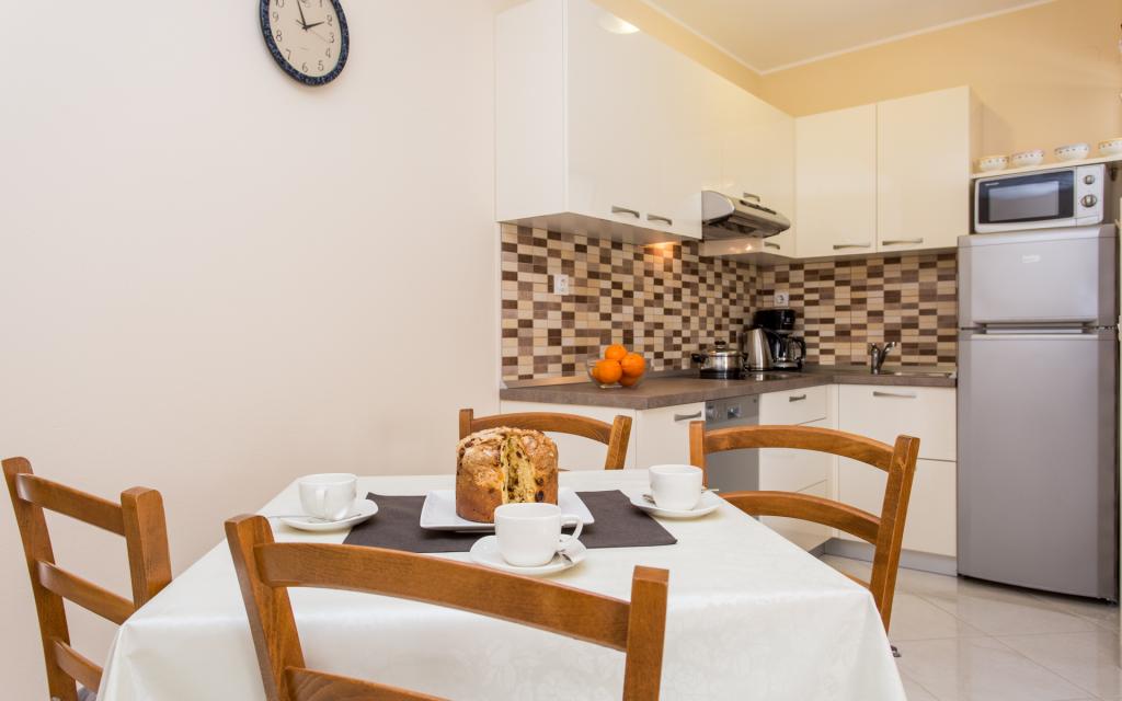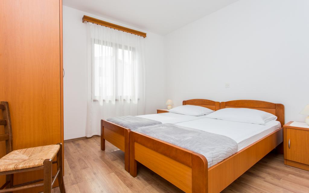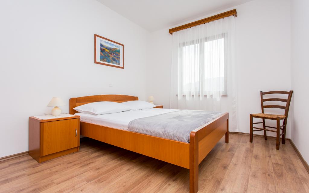 Naša hiša ima pritličje in dve nadstropji, v prvem in drugem nadstropju so apartmaji. Vsak apartma je sestavljen iz 2 spalnic, dnevne sobe s satelitsko televizijo, kuhinje z jedilnim kotom, kopalnice s kadjo s tušem, balkona z zunanjim pohištvom. Na dvorišču imamo lep vrt, ki ga radi pospravimo. Imamo lepo teraso z žarom, ki je idealna za druženje zvečer. Vsem gostom je na voljo terasa z žarom. Na dvorišču ponujamo tudi parkirišče za avtomobile. Že vrsto let najamemo stanovanja. Prizadevamo si, da bi gostom zagotovili udobno bivanje v naši hiši. Vedno smo pripravljeni pomagati. Trudimo se, da so stanovanja zelo urejena in vedno skušamo kaj izboljšati. Naša hiša se nahaja v osrednjem delu Baške, idealna za počitnice. V naši soseski je mirno in prometa ni veliko. Je stran od hrupa in spet je le 10 minut hoje do plaže, prva trgovina, pekarna, banka. .