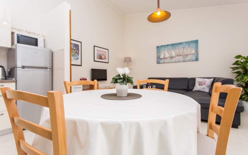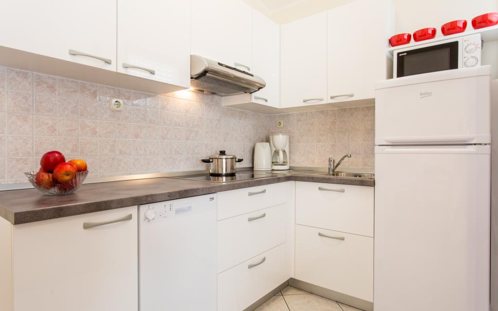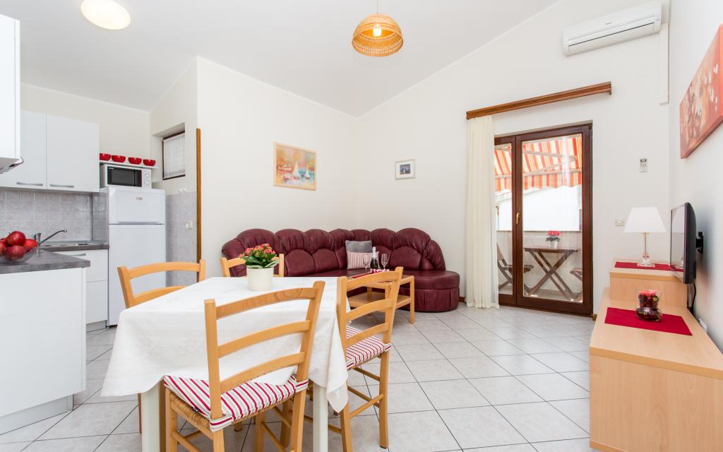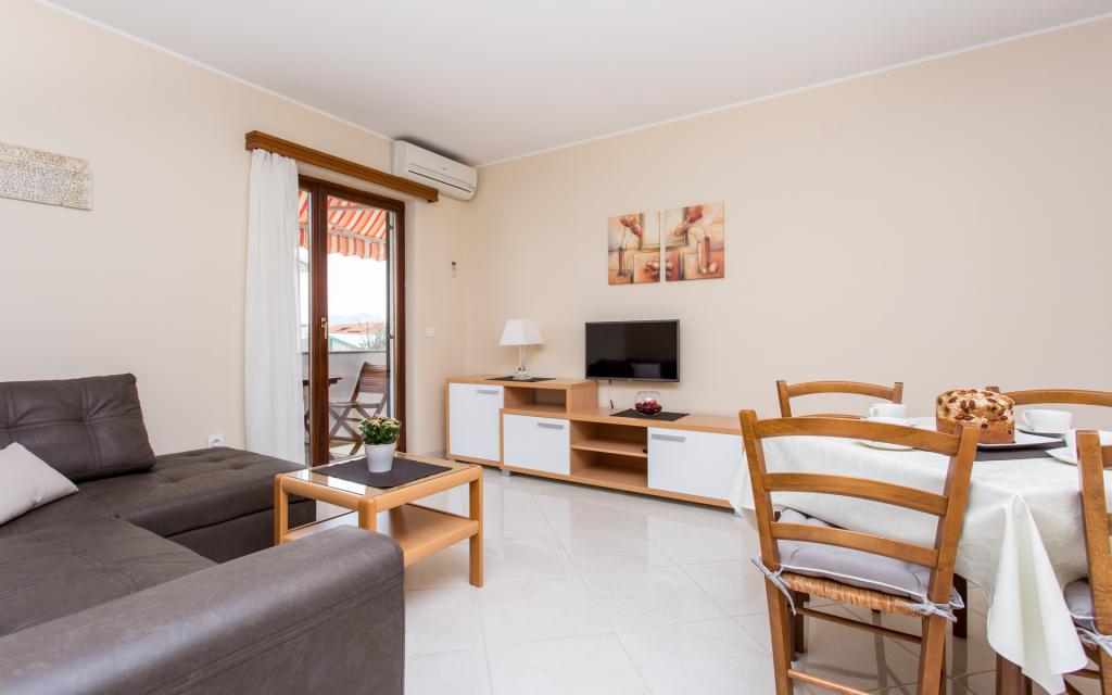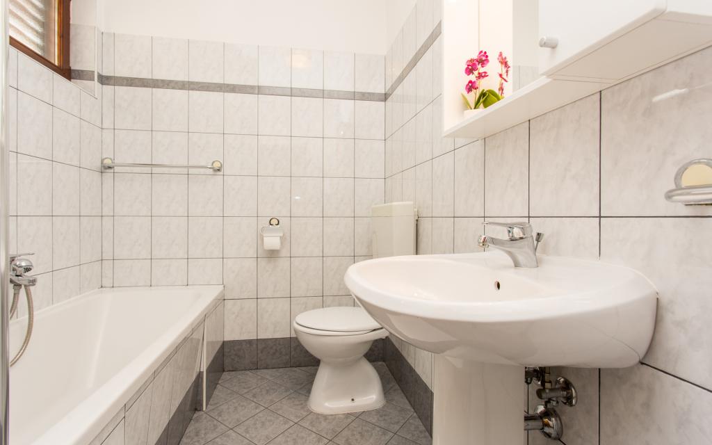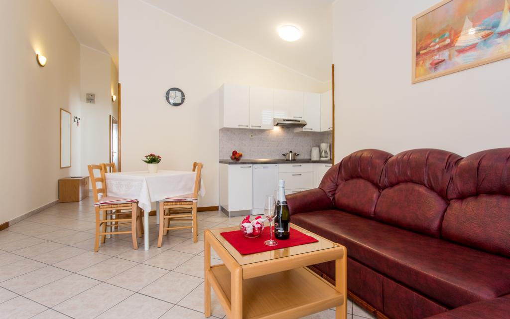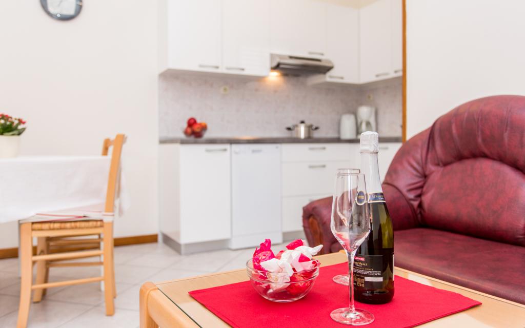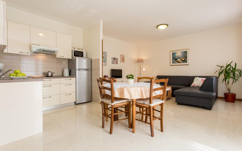 Naša hiša ima pritličje in dve nadstropji, v prvem in drugem nadstropju so apartmaji. Vsak apartma je sestavljen iz 2 spalnic, dnevne sobe s satelitsko televizijo, kuhinje z jedilnim kotom, kopalnice s kadjo s tušem, balkona z zunanjim pohištvom. Na dvorišču imamo lep vrt, ki ga radi pospravimo. Imamo lepo teraso z žarom, ki je idealna za druženje zvečer. Vsem gostom je na voljo terasa z žarom. Na dvorišču ponujamo tudi parkirišče za avtomobile. Že vrsto let najamemo stanovanja. Prizadevamo si, da bi gostom zagotovili udobno bivanje v naši hiši. Vedno smo pripravljeni pomagati. Trudimo se, da so stanovanja zelo urejena in vedno skušamo kaj izboljšati. Naša hiša se nahaja v osrednjem delu Baške, idealna za počitnice. V naši soseski je mirno in prometa ni veliko. Je stran od hrupa in spet je le 10 minut hoje do plaže, prva trgovina, pekarna, banka. .