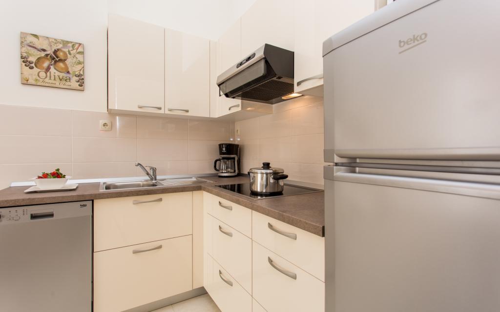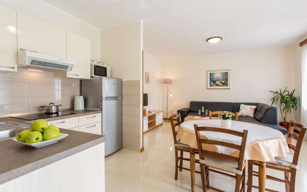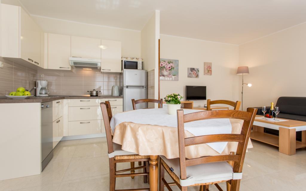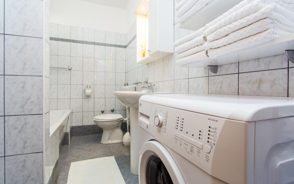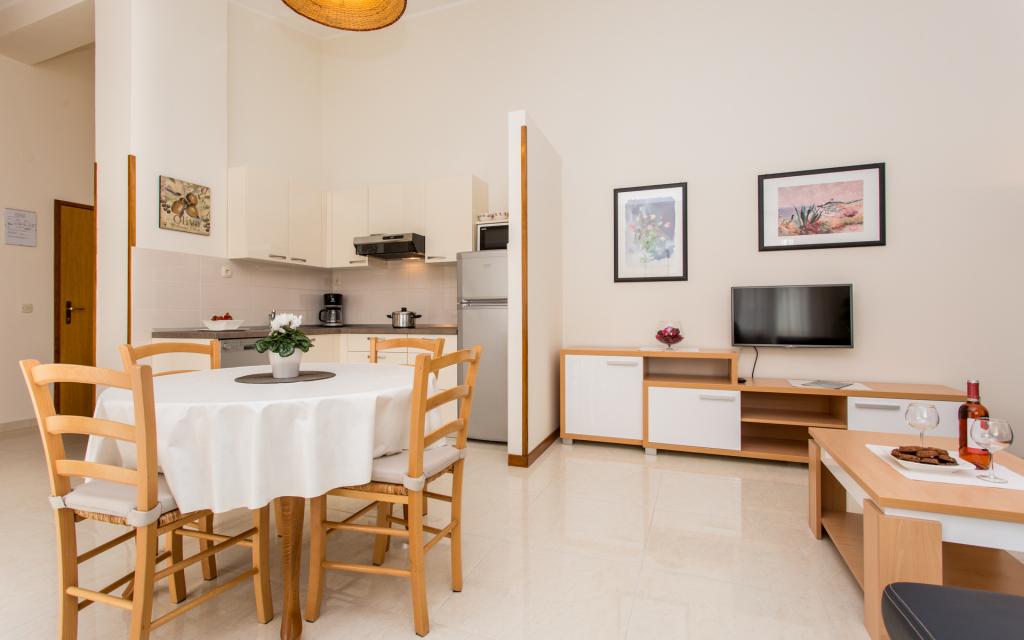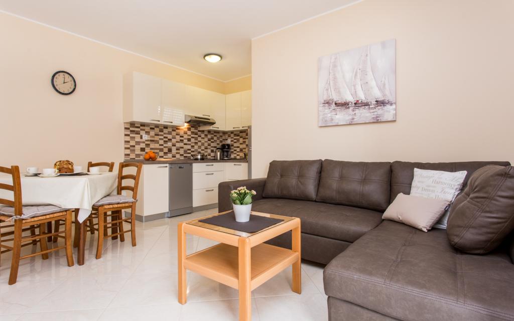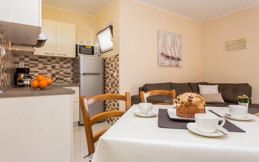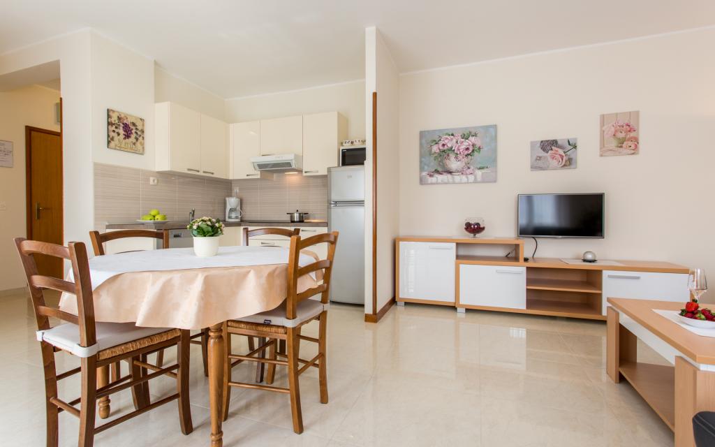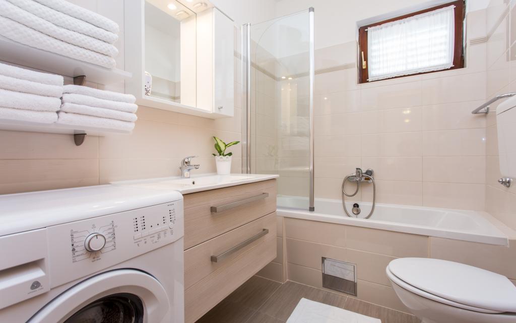 Naša hiša ima pritličje in dve nadstropji, v prvem in drugem nadstropju so apartmaji. Vsak apartma je sestavljen iz 2 spalnic, dnevne sobe s satelitsko televizijo, kuhinje z jedilnim kotom, kopalnice s kadjo s tušem, balkona z zunanjim pohištvom. Na dvorišču imamo lep vrt, ki ga radi pospravimo. Imamo lepo teraso z žarom, ki je idealna za druženje zvečer. Vsem gostom je na voljo terasa z žarom. Na dvorišču ponujamo tudi parkirišče za avtomobile. Že vrsto let najamemo stanovanja. Prizadevamo si, da bi gostom zagotovili udobno bivanje v naši hiši. Vedno smo pripravljeni pomagati. Trudimo se, da so stanovanja zelo urejena in vedno skušamo kaj izboljšati. Naša hiša se nahaja v osrednjem delu Baške, idealna za počitnice. V naši soseski je mirno in prometa ni veliko. Je stran od hrupa in spet je le 10 minut hoje do plaže, prva trgovina, pekarna, banka. .