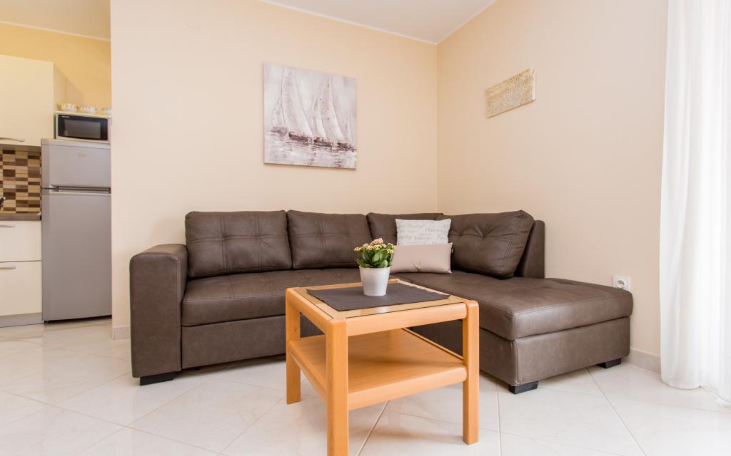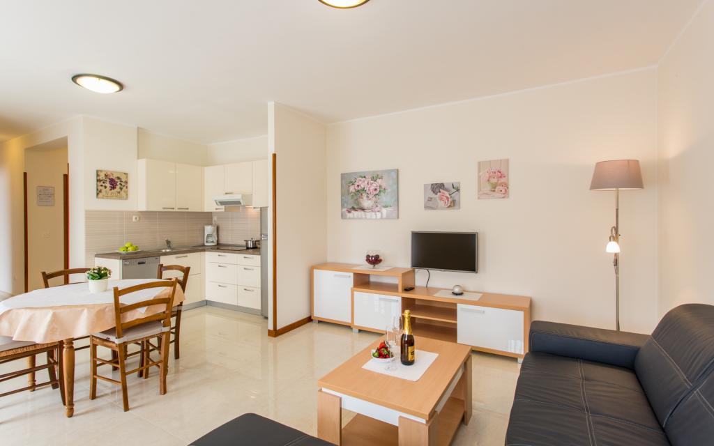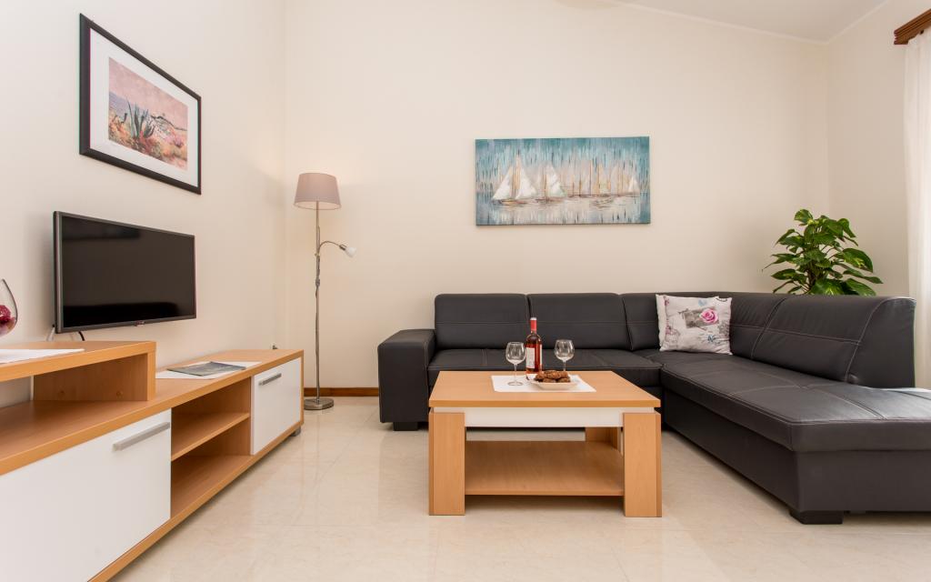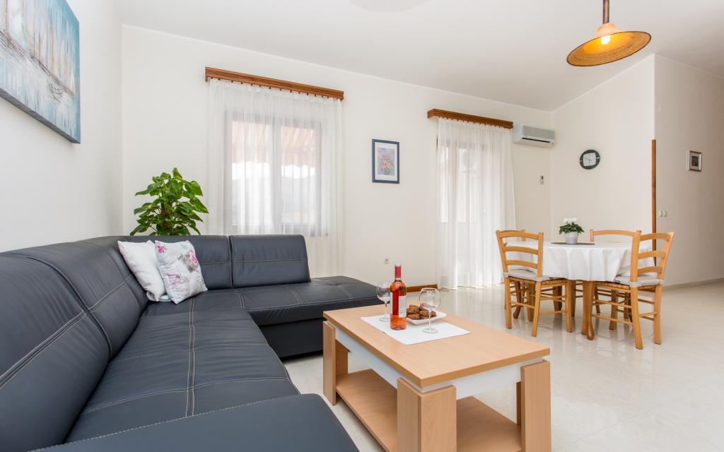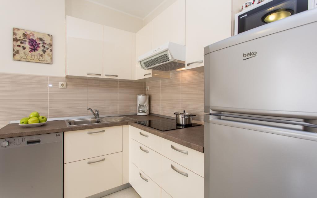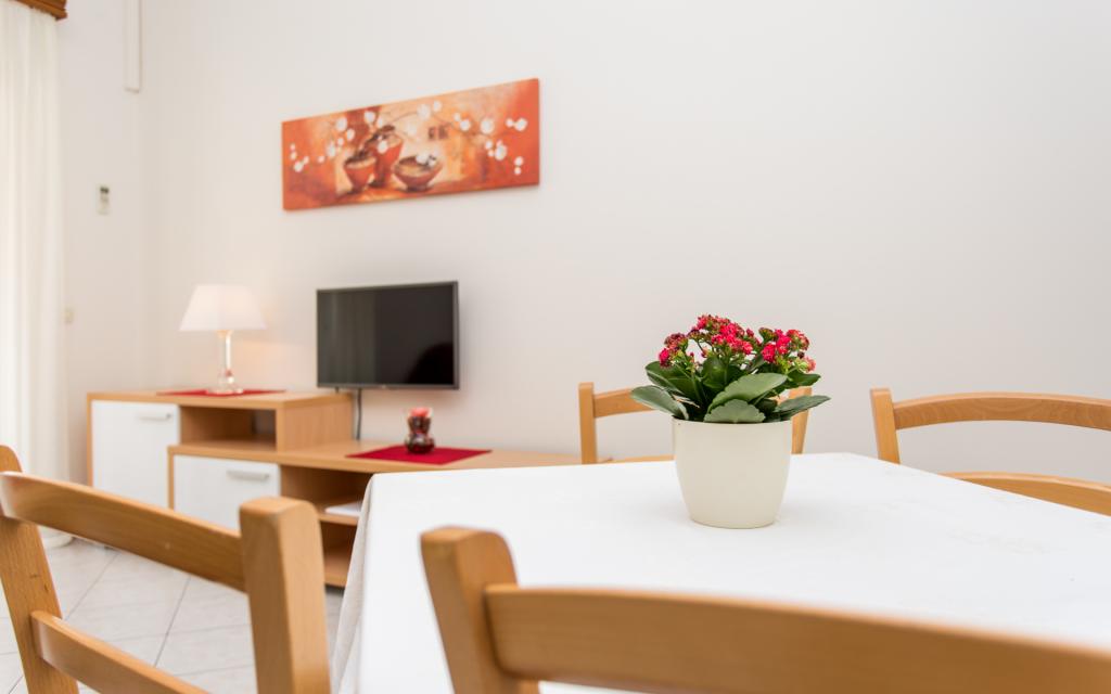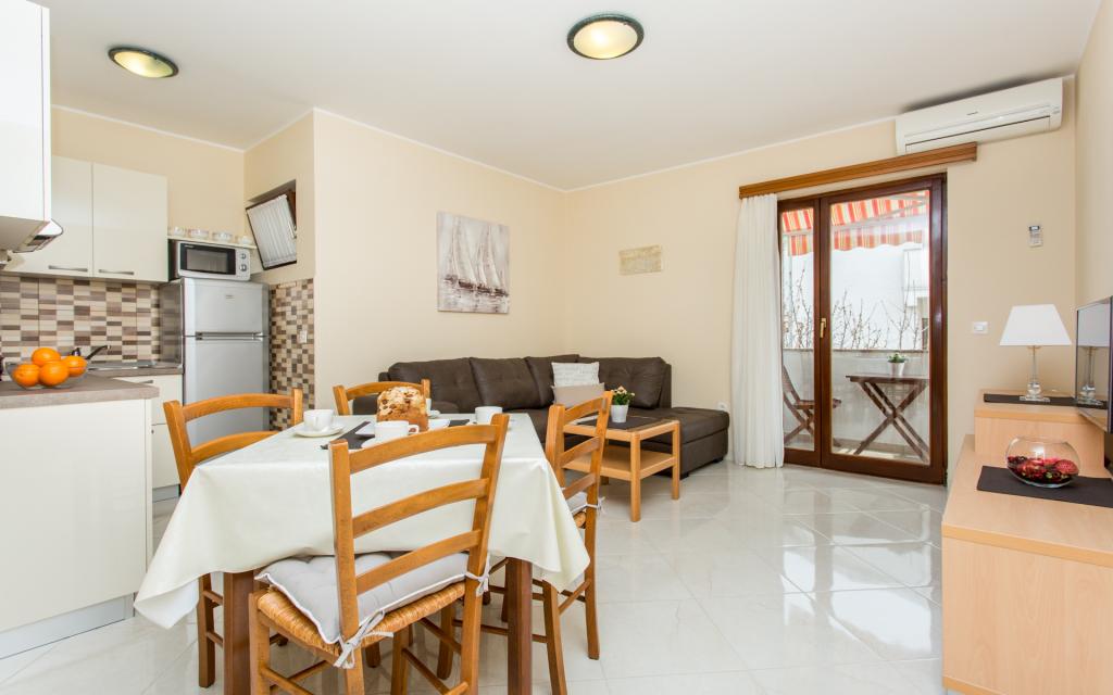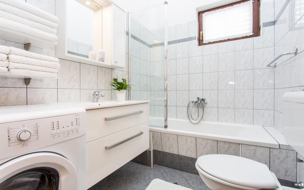Naša hiša ima pritličje in dve nadstropji, v prvem in drugem nadstropju so apartmaji. Vsak apartma je sestavljen iz 2 spalnic, dnevne sobe s satelitsko televizijo, kuhinje z jedilnim kotom, kopalnice s kadjo s tušem, balkona z zunanjim pohištvom. Na dvorišču imamo lep vrt, ki ga radi pospravimo. Imamo lepo teraso z žarom, ki je idealna za druženje zvečer. Vsem gostom je na voljo terasa z žarom. Na dvorišču ponujamo tudi parkirišče za avtomobile. Že vrsto let najamemo stanovanja. Prizadevamo si, da bi gostom zagotovili udobno bivanje v naši hiši. Vedno smo pripravljeni pomagati. Trudimo se, da so stanovanja zelo urejena in vedno skušamo kaj izboljšati. Naša hiša se nahaja v osrednjem delu Baške, idealna za počitnice. V naši soseski je mirno in prometa ni veliko. Je stran od hrupa in spet je le 10 minut hoje do plaže, prva trgovina, pekarna, banka. .