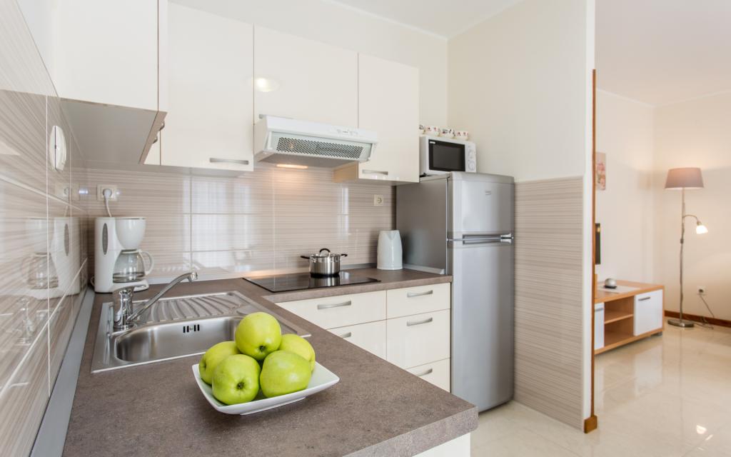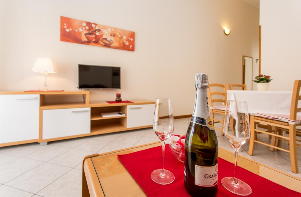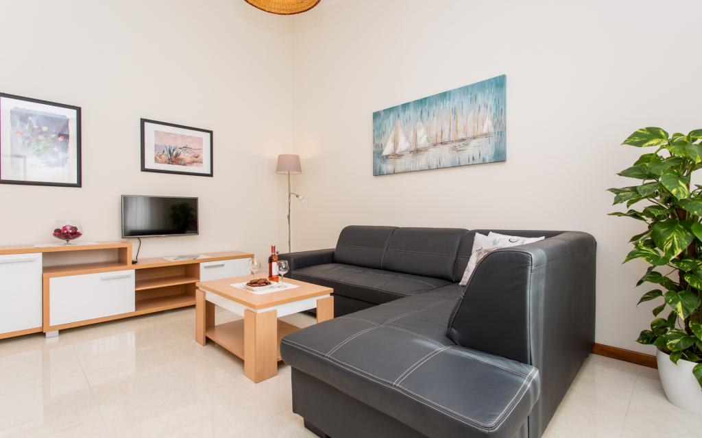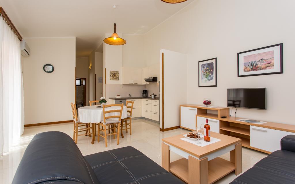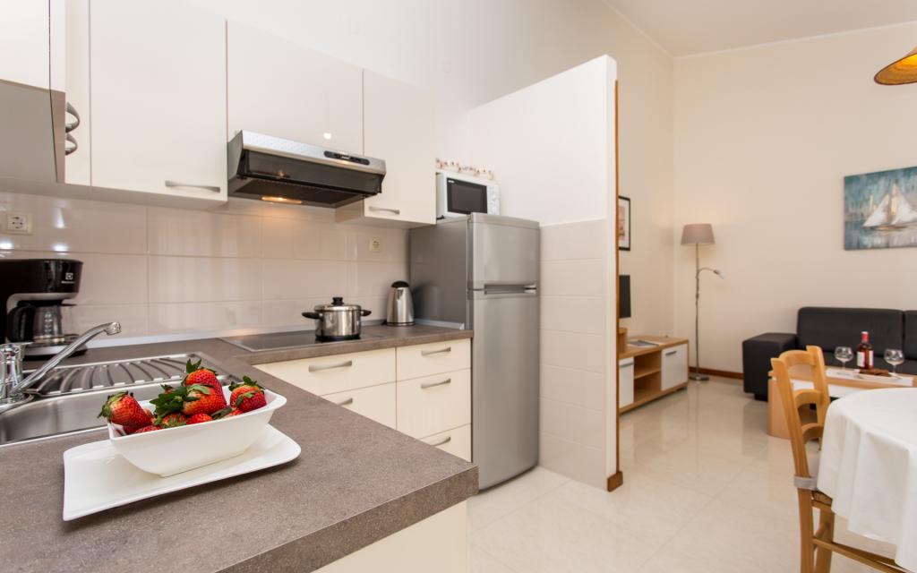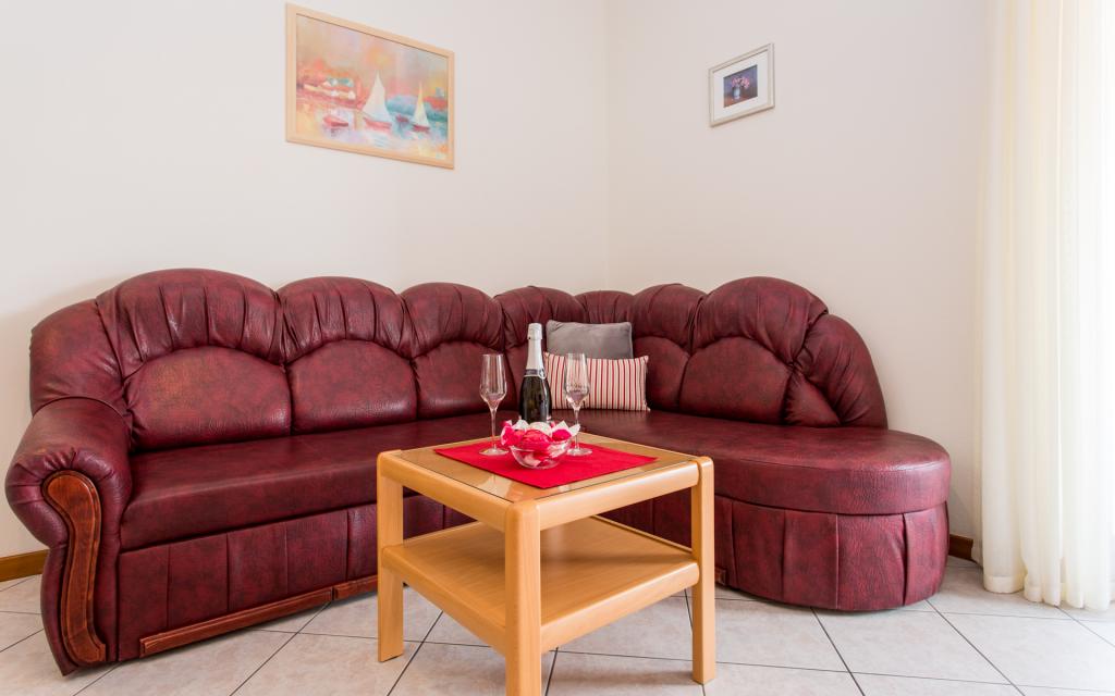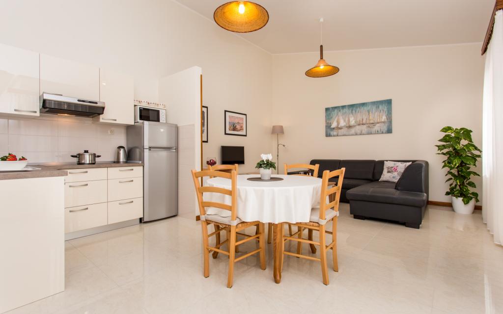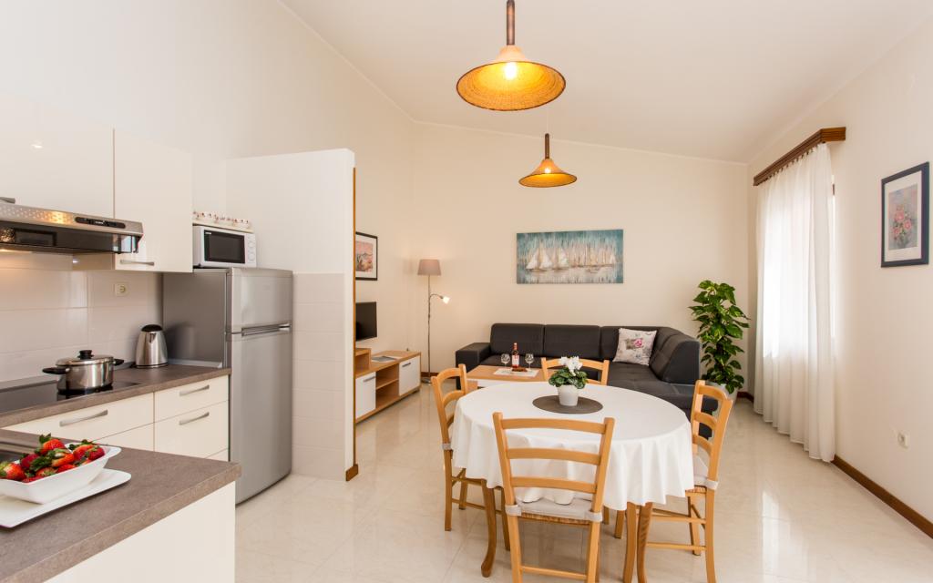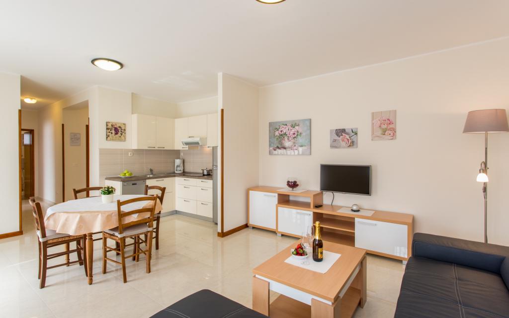 Naša hiša ima pritličje in dve nadstropji, v prvem in drugem nadstropju so apartmaji. Vsak apartma je sestavljen iz 2 spalnic, dnevne sobe s satelitsko televizijo, kuhinje z jedilnim kotom, kopalnice s kadjo s tušem, balkona z zunanjim pohištvom. Na dvorišču imamo lep vrt, ki ga radi pospravimo. Imamo lepo teraso z žarom, ki je idealna za druženje zvečer. Vsem gostom je na voljo terasa z žarom. Na dvorišču ponujamo tudi parkirišče za avtomobile. Že vrsto let najamemo stanovanja. Prizadevamo si, da bi gostom zagotovili udobno bivanje v naši hiši. Vedno smo pripravljeni pomagati. Trudimo se, da so stanovanja zelo urejena in vedno skušamo kaj izboljšati. Naša hiša se nahaja v osrednjem delu Baške, idealna za počitnice. V naši soseski je mirno in prometa ni veliko. Je stran od hrupa in spet je le 10 minut hoje do plaže, prva trgovina, pekarna, banka. .