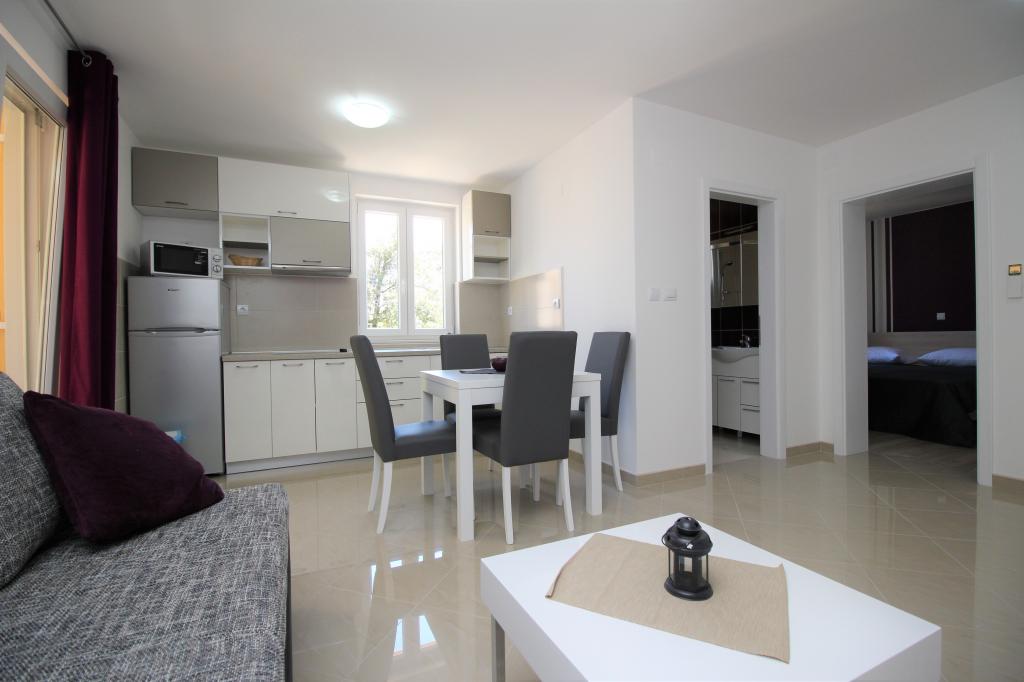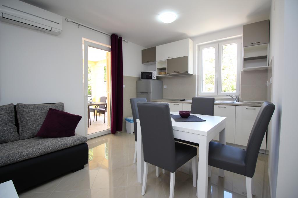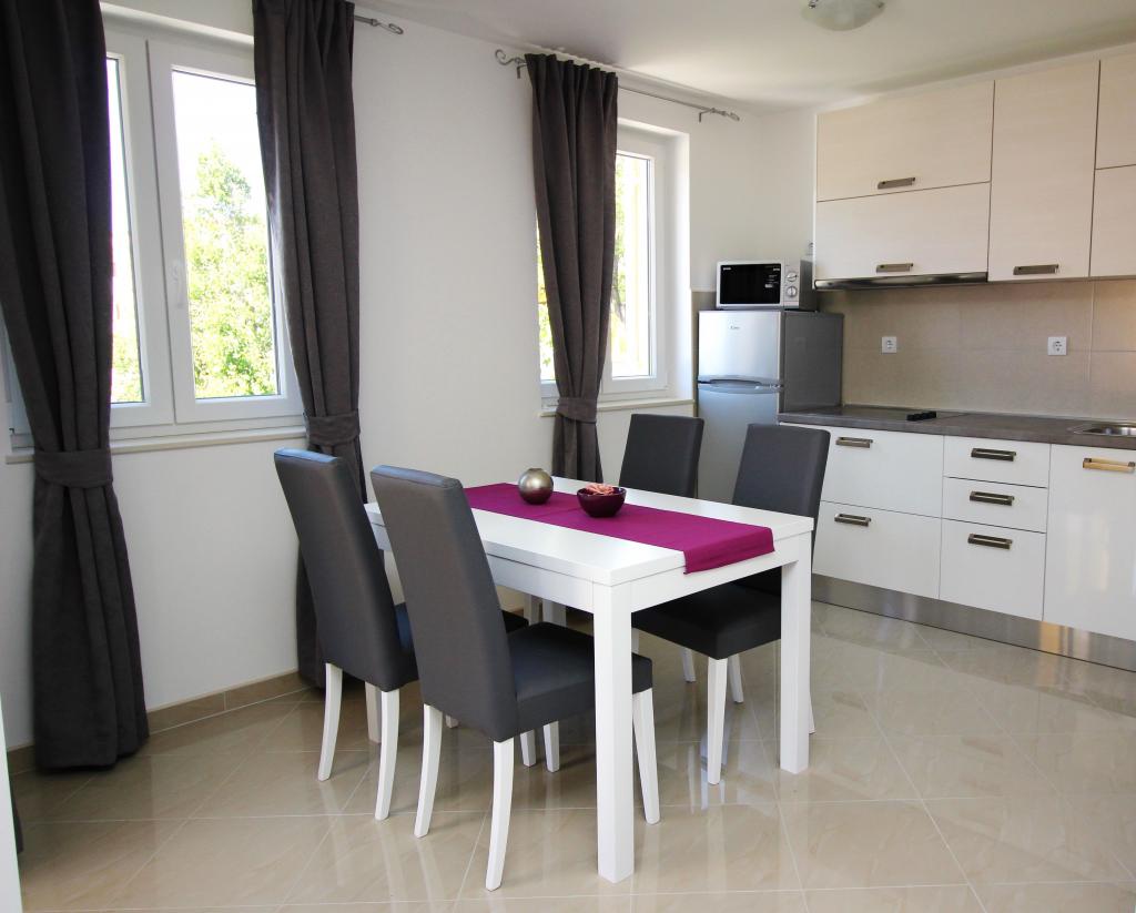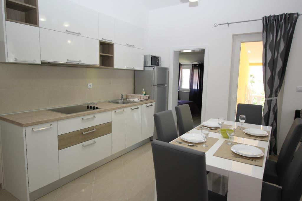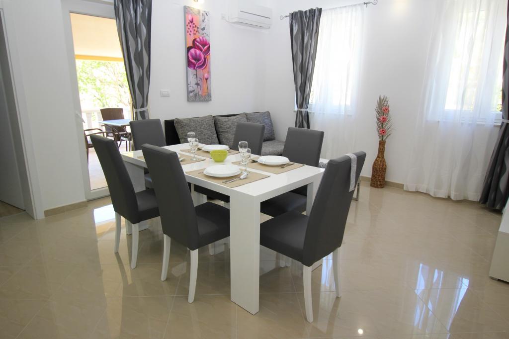 Moderno opremljeni apartmaji, le 5 minut hoje od čudovite plaže Vela, s skupnim zunanjim bazenom in žarom. Hiša ima 9 apartmajev, opremljenih s pomivalnim strojem, pralnim strojem, sefom, klimatsko napravo, internetom in SAT-TV. Vsak apartma ima eno parkirno mesto. Hišni ljubljenčki niso dobrodošli.