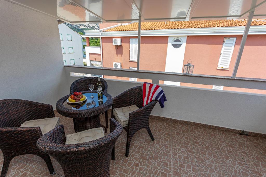 Apartmaji se nahajajo v mirni ulici, približno 350 metrov od plaže in centra. Dvosobno stanovanje se nahaja v pritličju in ima teraso, enosobno pa v 1. in 2. nadstropju in ima balkon. Pred hišo je parkirišče za vsak apartma. Apartmaji so klimatizirani, imajo wifi.