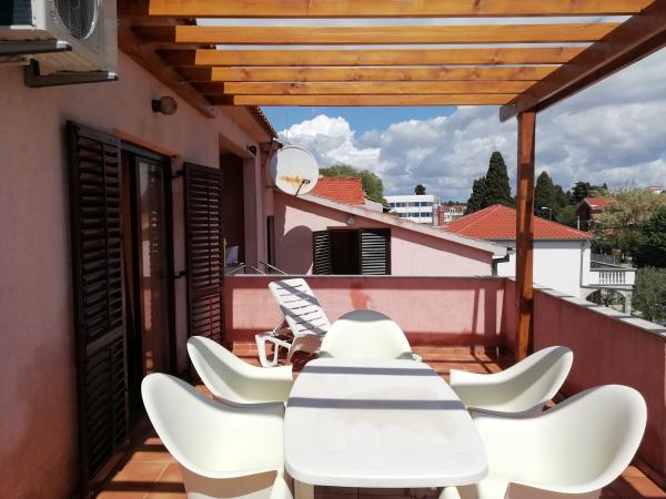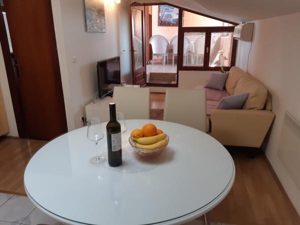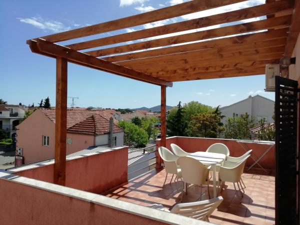 Popolnoma opremljeni apartmaji s pogledom na morje, le 10 minut hoje do centra mesta in 5 minut do plaže. Nahajajo se v drugem nadstropju in ima parkirišče. Apartmaji imajo velike terase, ki poletne počitnice še bolj prijetno.