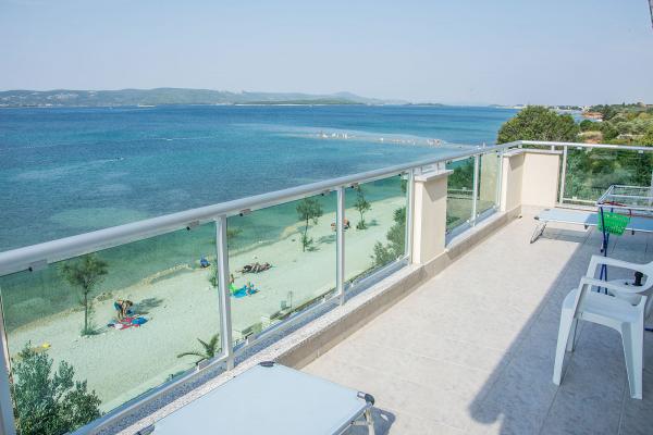 Luksuzna nova družinska hiša Villa Maria, v Biogradu, na plaži Bošana, primerna za otroke in neplavalce, nudi dva prostorne, sodobno in svetlo: Apartma 1, v prvem nadstropju, s tremi spalnicami in dvema dodatnima ležiščema za do 8 osebe in Apartma 2, v drugem nadstropju, z dvema spalnicama in dvema dodatnima ležiščema za do 6 oseb. Vsak apartma ima tri zasebno opremljen balkon z neposrednim pogledom na morje, v večjem balkonov od živih in manj iz ene spalnice in iz kuhinje. V vsakem stanovanju je Wi-Fi (WLAN) dostop do interneta, klima (dve v vsaki dnevni sobi in eno v vsaki spalnici), SAT TV, kuhinjo - s posodo in pribor, štedilnik s pečico, hladilnik predal zamrzovalnik, aparat za kavo in pomivalni stroj, dve kupaonices prhe. Oba apartmaja sta opremljena s pralnim strojem in stanovanje v pritličju in lase.