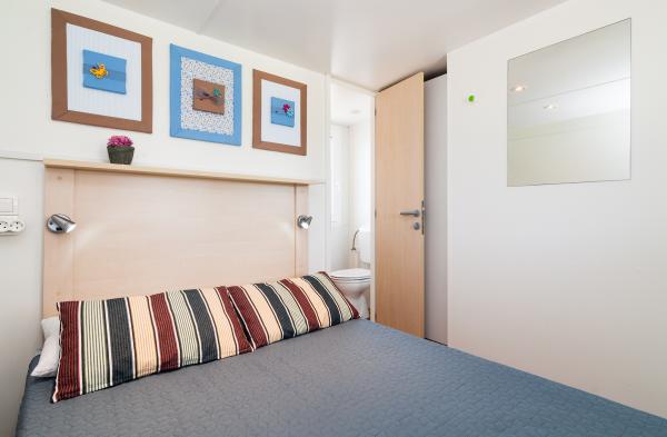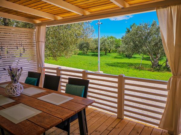 Mobilne hišice se nahajajo v kampu TRSTIKE, zasebnem kampu, ki se nahaja v oljčnem nasadu ob morju, v bližini peščene plaže v Trstu in prodnate plaže Bošana. Ta nastanitev nudi užitek v naravi in tišini. Nahaja se nedaleč od centra Biograda na Moru, le 15-20 minut hoje do morja, kjer imate vse zabavne in gostinske objekte. Bližnja zgodovinska mesta Zadar (30 km) in Šibenik (41 km) nudijo obiskovalcem zanimivo in bogato hrvaško kulturno dediščino. Tematski park Fun Park Mirnovec je oddaljen 5,6 km / 10 min vožnje. Mobilna hišica: 2 spalnici (ena spalnica z 1 veliko posteljo, druga spalnica ima 2 enojni postelji, kotni kavč) (miza za eno odraslo osebo ali 2 otroka) z mizo, 2 x tuš / wc, terasa : 26 m2 z vrtno garnituro in 2 ležalniki, pred kočo je zunanji tuš in žar.