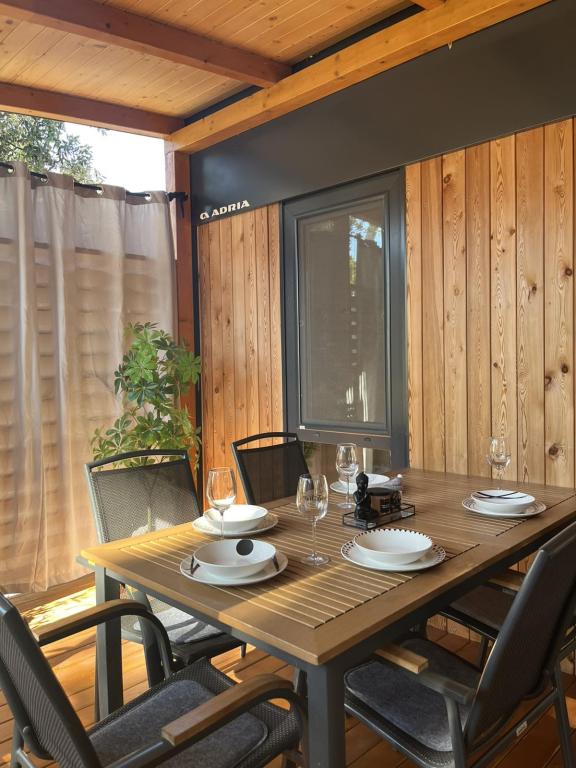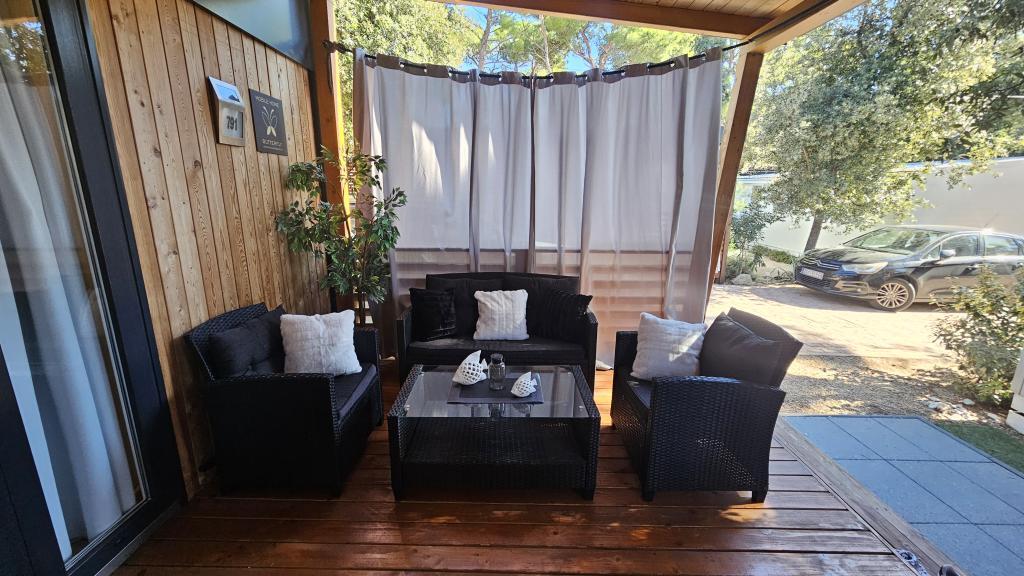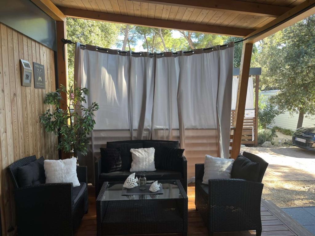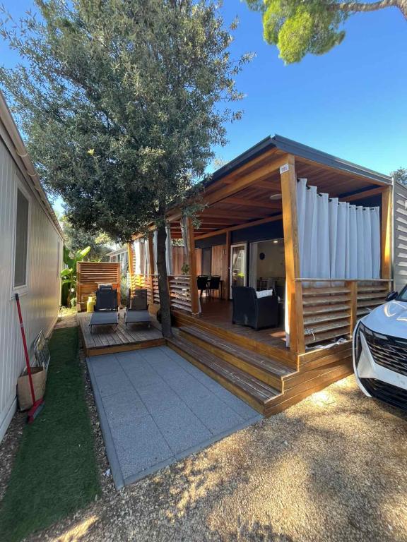 Moderna klimatizirana mobilna hišica v kampu Park Soline, le nekaj korakov od plaže in 15 minut hoje do središča Biograda. Ponuja 2 spalnici, kuhinjo, dnevno sobo, 2 kopalnici in pokrito teraso z vrtnim pohištvom. Brezplačen brezžični internet, parkirišče, otroška zabava, športna igrišča in mediteranska restavracija na kraju samem. Idealna za družine ali pare, ki iščejo sprostitev v senci borovcev, blizu vseh glavnih znamenitosti.