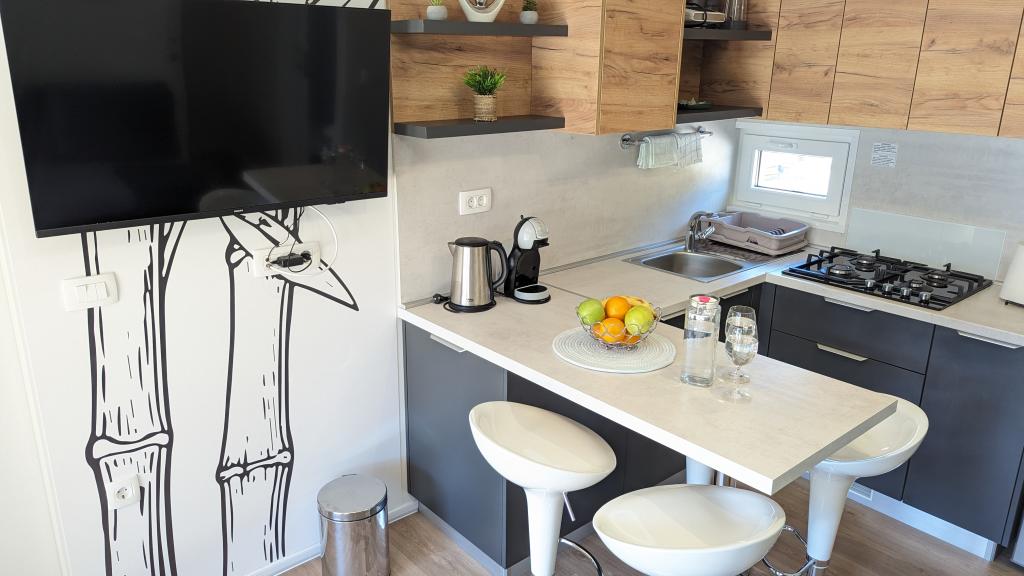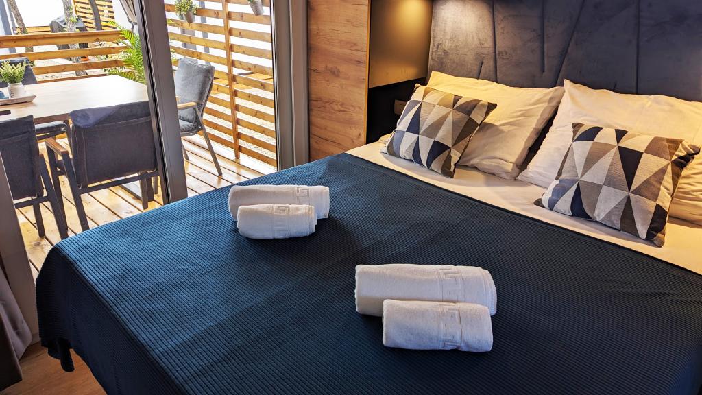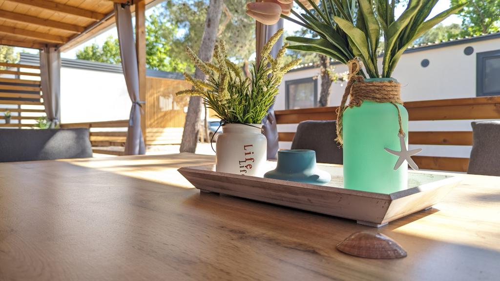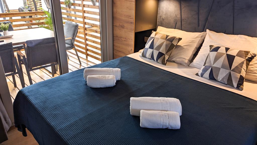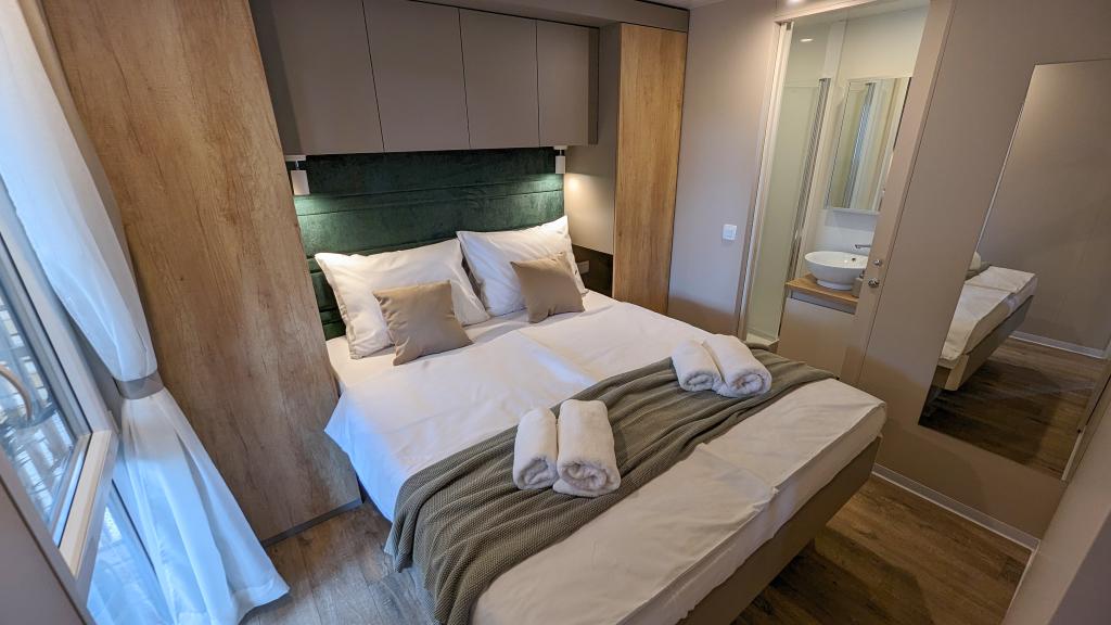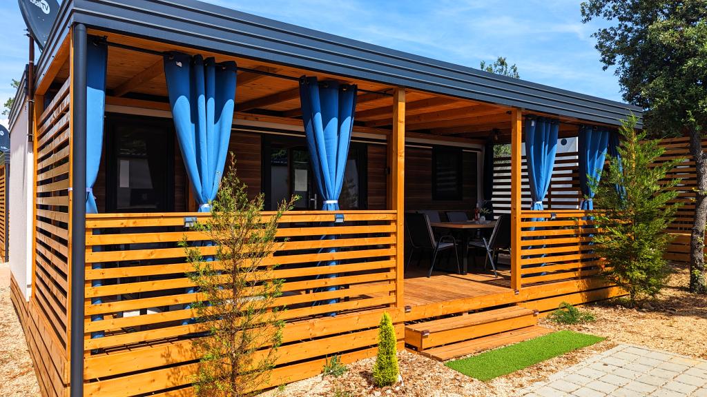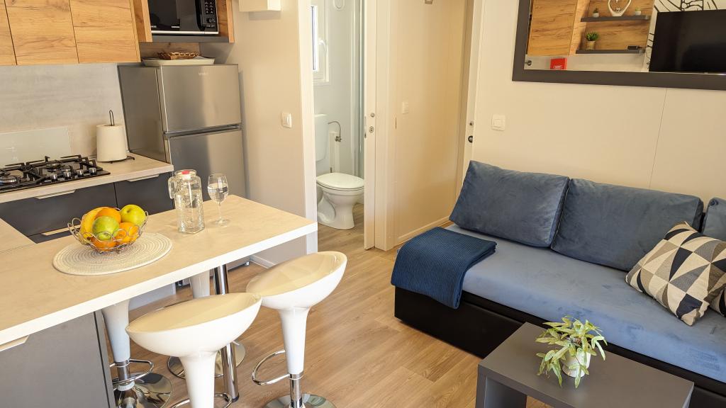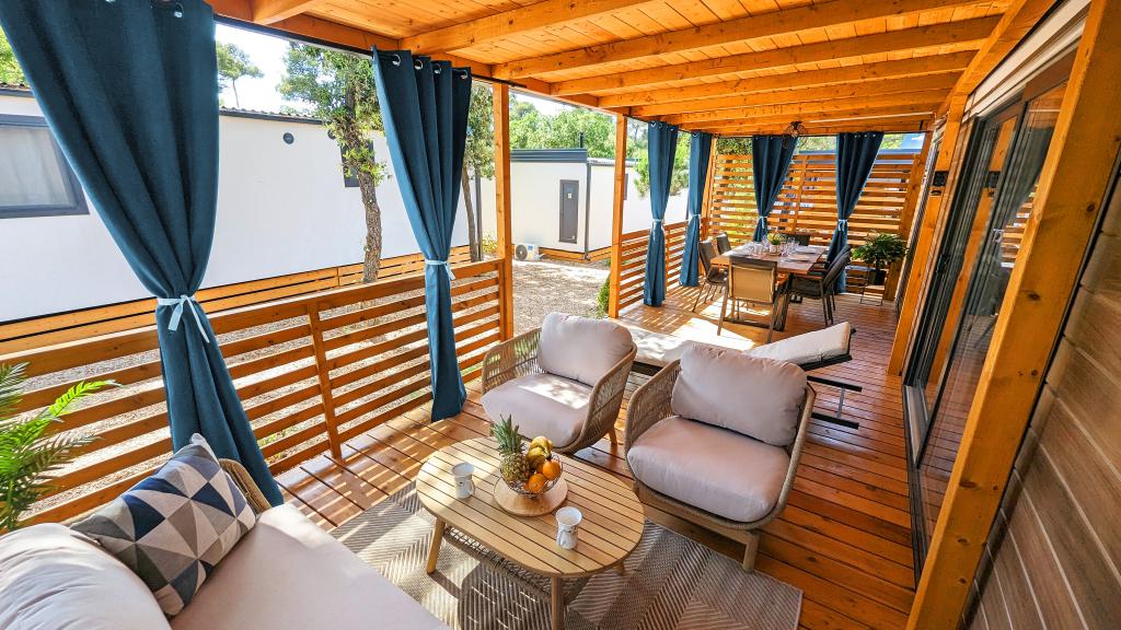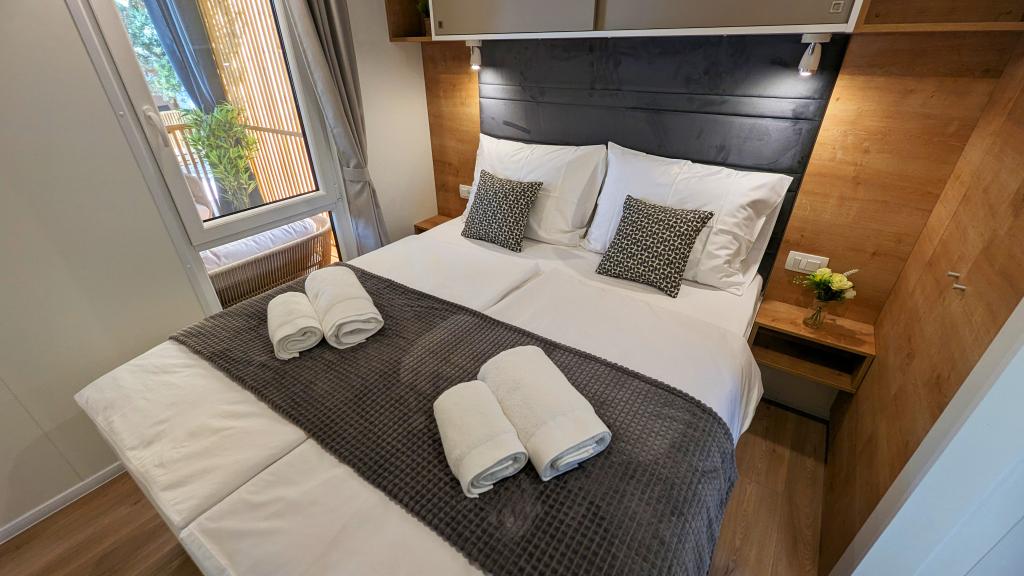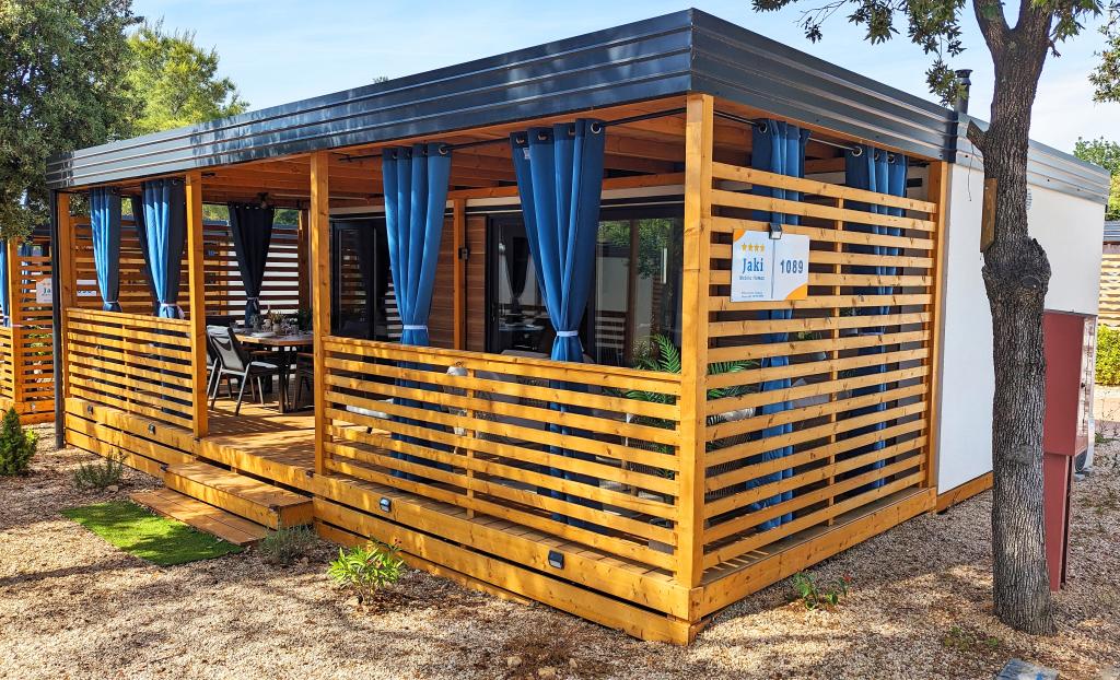 Uživajte v naravi in udobju: mobilne hišice Jaki v kampu Soline, Biograd na Moru. Naše moderno opremljene mobilne hišice, ki se nahajajo v mirnem delu kampa s 4 zvezdicami, obdane z borovim gozdom, so idealne za do 6 oseb. Uživajte v bližini plaže (2-5 minut hoje), trgovin in restavracij ter promenade, ki vodi do centra mesta (15 minut). Te hišice nudijo 2 spalnici in 2 kopalnici, dnevno sobo, veliko teraso z jedilno mizo in bivalnim prostorom ter popolnoma opremljeno kuhinjo - pomivalni stroj, mikrovalovna pečica, aparat za kavo, opekač kruha, mešalnik, zunanji žar. Hiša vključuje tudi brezplačen WiFi, brezplačno parkirišče tik ob hiši, Smart TV, klimatsko napravo, brisače in posteljnino. Kamp ponuja številne vsebine za vso družino: čudovite peščene in prodnate plaže, ki segajo vse do centra mesta, restavracijo z mediteranskimi specialitetami, otroško igrišče, športne aktivnosti in najem koles. Dalmaland, največji tematski vodni park na Hrvaškem, je oddaljen 15 min vožnje.
