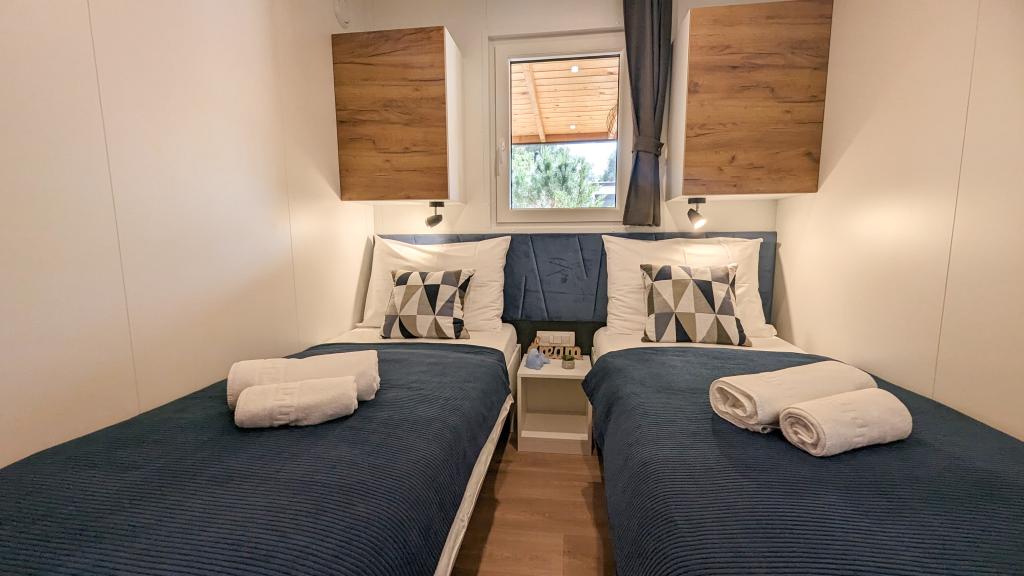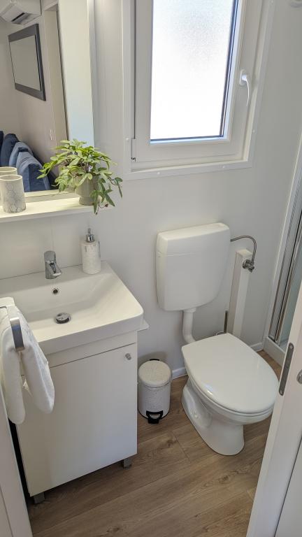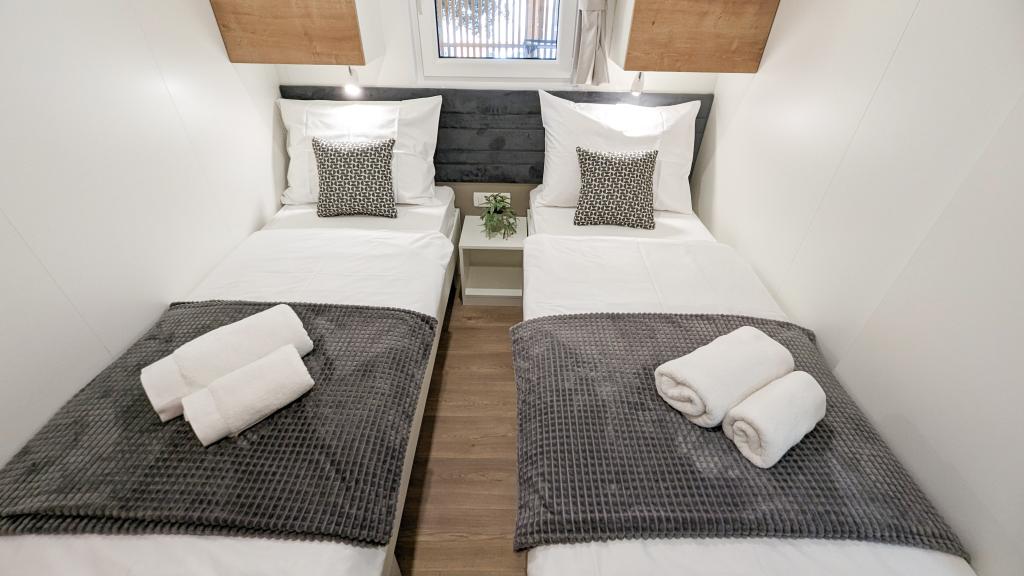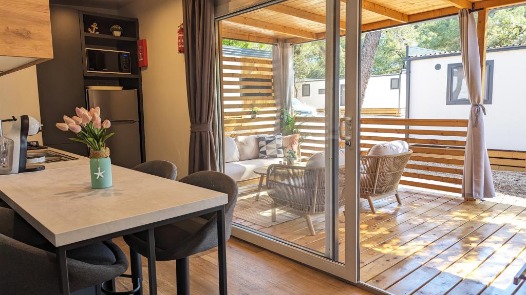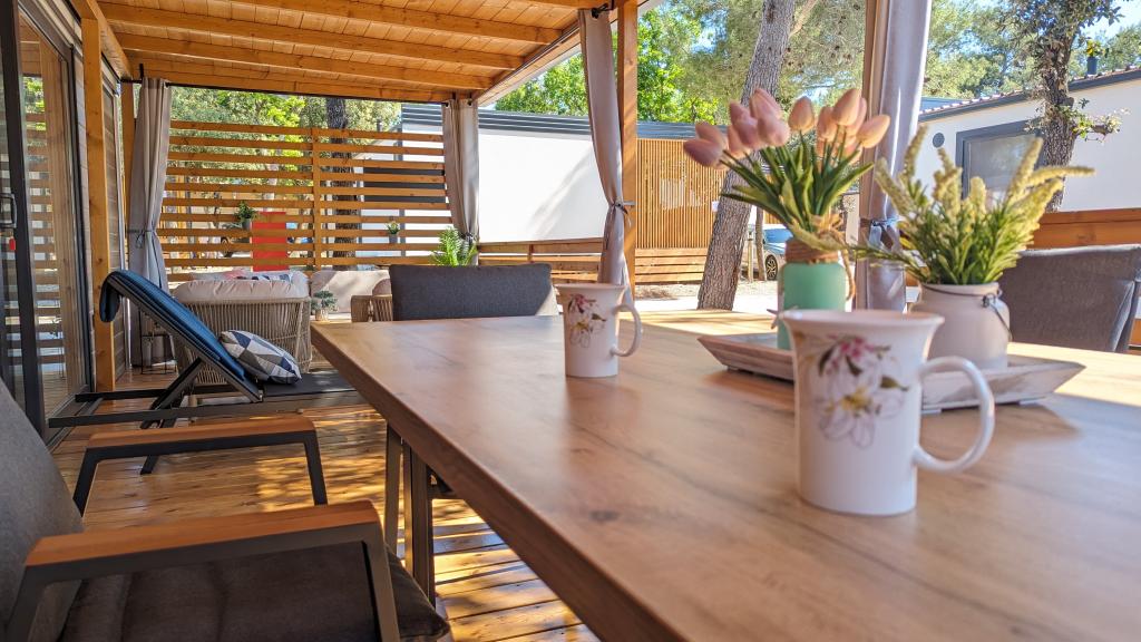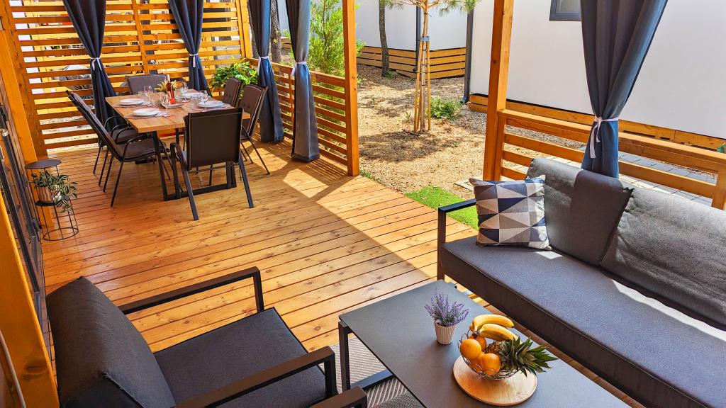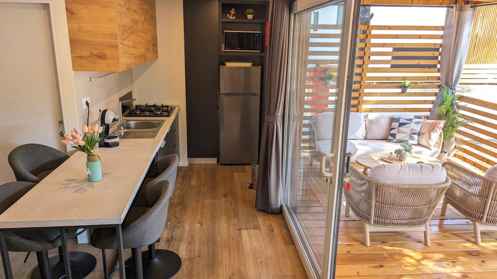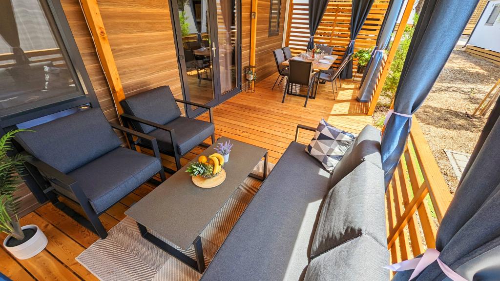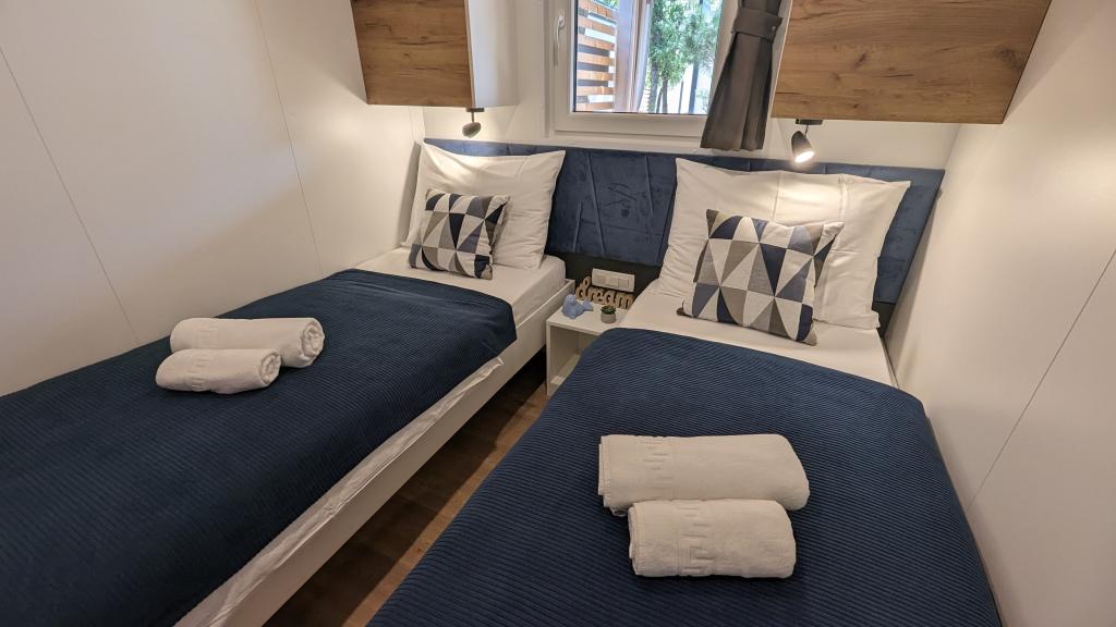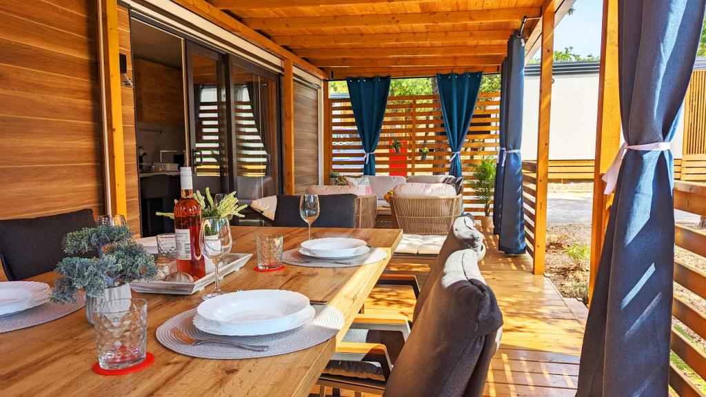 Uživajte v naravi in udobju: mobilne hišice Jaki v kampu Soline, Biograd na Moru. Naše moderno opremljene mobilne hišice, ki se nahajajo v mirnem delu kampa s 4 zvezdicami, obdane z borovim gozdom, so idealne za do 6 oseb. Uživajte v bližini plaže (2-5 minut hoje), trgovin in restavracij ter promenade, ki vodi do centra mesta (15 minut). Te hišice nudijo 2 spalnici in 2 kopalnici, dnevno sobo, veliko teraso z jedilno mizo in bivalnim prostorom ter popolnoma opremljeno kuhinjo - pomivalni stroj, mikrovalovna pečica, aparat za kavo, opekač kruha, mešalnik, zunanji žar. Hiša vključuje tudi brezplačen WiFi, brezplačno parkirišče tik ob hiši, Smart TV, klimatsko napravo, brisače in posteljnino. Kamp ponuja številne vsebine za vso družino: čudovite peščene in prodnate plaže, ki segajo vse do centra mesta, restavracijo z mediteranskimi specialitetami, otroško igrišče, športne aktivnosti in najem koles. Dalmaland, največji tematski vodni park na Hrvaškem, je oddaljen 15 min vožnje.