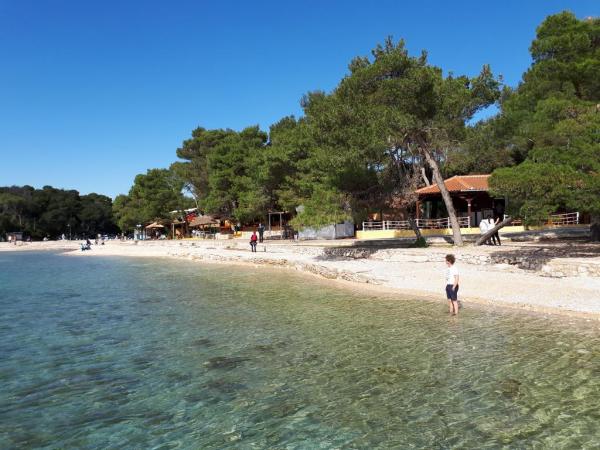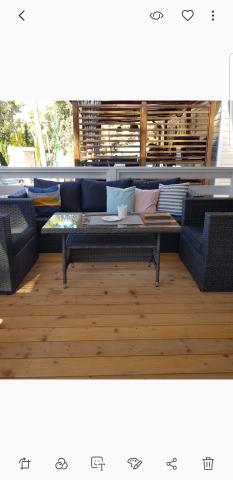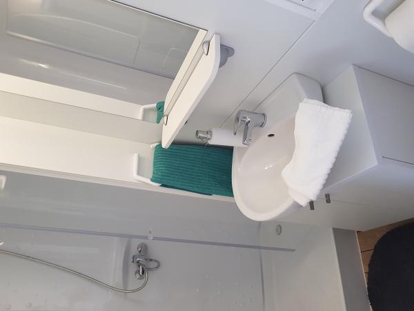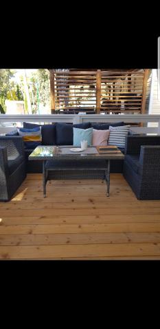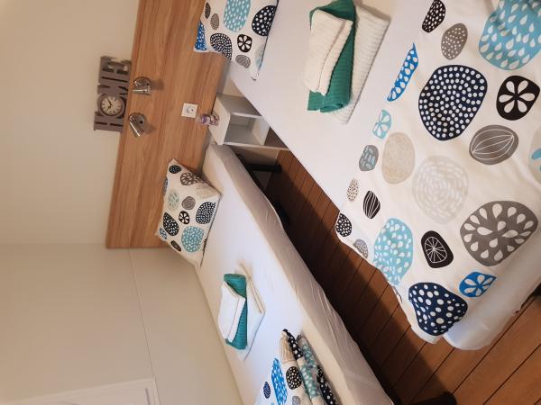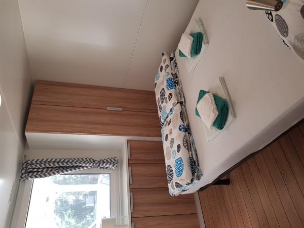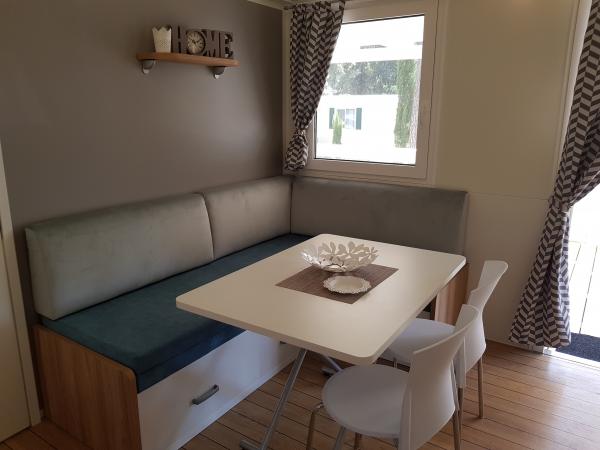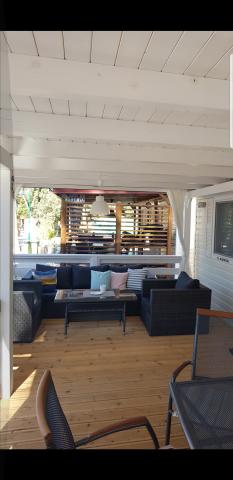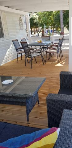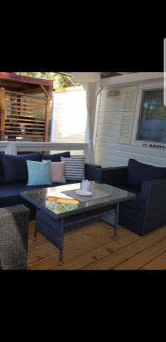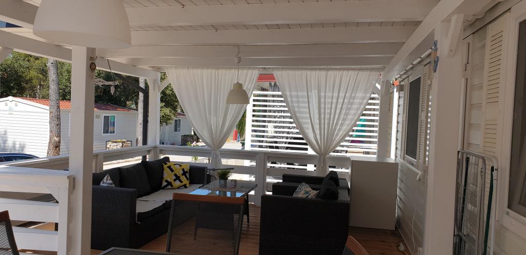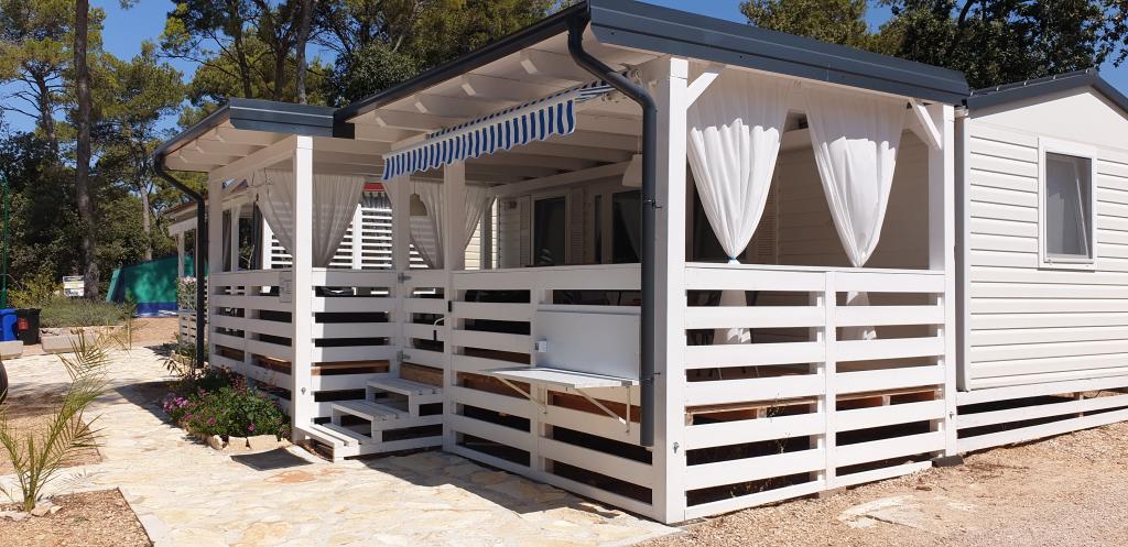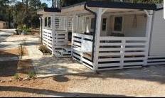 NOVO !! Čisto nov mobilni dom. Sestavljen je iz 2 spalnici (1 z zakonsko posteljo in druga z dvema ločenima ležiščema), vsaka s svojo kopalnico in dnevno sobo s kuhinjo, kjer je postelja. Hiša je predviden za 4 2 ljudi. Površina same hiše je 30 m2 in pokrita terasa 24 m2, kjer je velika jedilna miza s 6 stoli in ležalniki za prijeten dopust. Koča je dobro opremljen, z zrakom, TV, kuhalnik vode, mikrovalovna pečica, velik hladilnik in popolno kuhinjsko opremo. Kamp se nahaja sredi borovega gozda. Ponuja storitve menjave valut, pralni in sušilni stroj in dnevno organizira različne aktivnosti za otroke in odrasle. V kampu so številne restavracije in kavarne. Za tiste, ki želijo aktivne počitnice lahko izbirajo med kolesarjenje, potapljanje, odbojka na mivki, tenis, namizni tenis, smučanje na vodi, jadranje in izlete do številnih bližnjih nacionalnih parkov in barko.