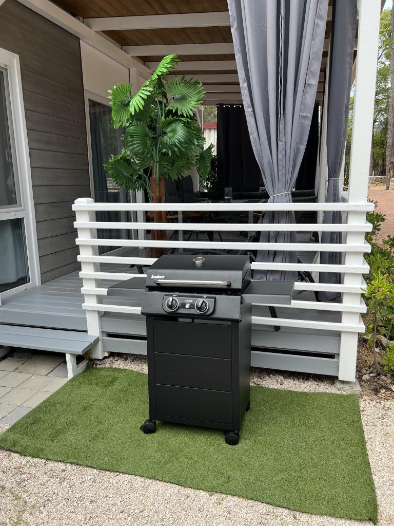 Hiša vsebuje: 2 spalnici, kuhinjo (popolnoma z inverterjem), jedilnico, eno kopalnico, pokrito, popolnoma opremljeno teraso 32m2, otroško posteljico, otroški stolček, sušilnik za lase, aparat za kavo, grelnik vode, žar, opekač kruha, mikrovalovno pečico, likalnik, brisače, posteljnino, kuhalnik jajc, stoječi mešalnik, sesalnik