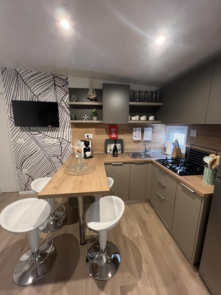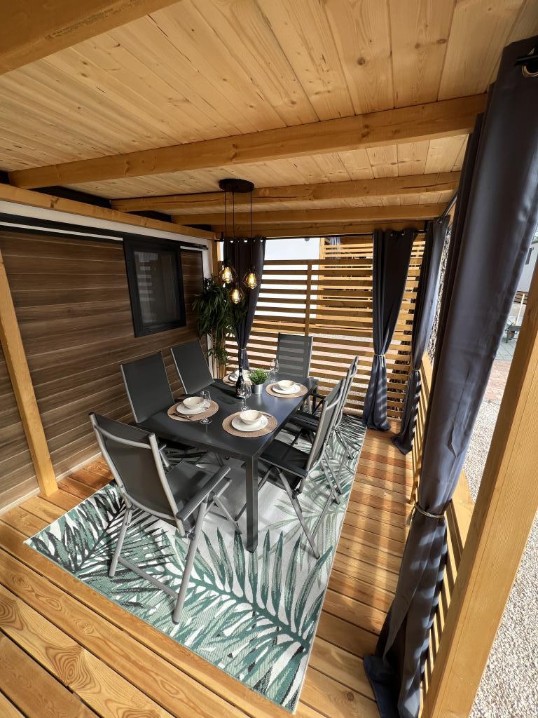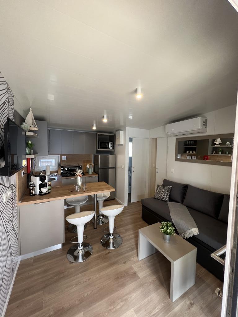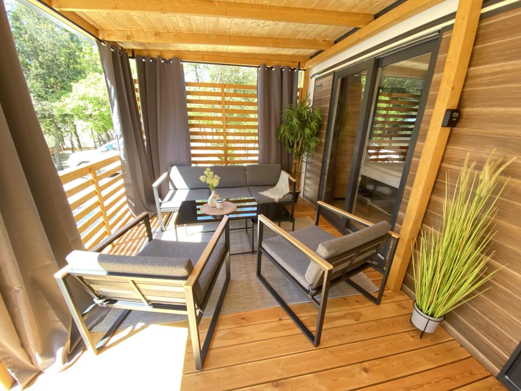 Vsebina mobilne hišice Mobilna hišica vsebuje: • 2 spalnici • Dnevna soba z dodatnim ležiščem za 2 osebi • Popolnoma opremljena kuhinja • Jedilnica • Kopalnica • Velika pokrita terasa približno 30 m² Oprema • Klimatska naprava • Brezplačen WiFi internet • Pametna TV s satelitskimi programi • Aparat za kavo • Električni grelnik vode • Opekač kruha • Mikrovalovna pečica • Popolna kuhinjska oprema • Žar • Sušilnik za lase • Posteljnina vključena • Brisače vključene Idealno za družine Mobilna hišica je še posebej primerna za družine z otroki. Na voljo so: • Otroška posteljica • Otroški stolček Prednosti namestitve Mobilna hišica Biograd na Moru – Kamp Park Soline Le 350 m od plaže Naravna senca borovcev Mirna lokacija Velika terasa Blizu morja Sprehajališče ob morju do centra Restavracije in trgovine v kampu Idealno za družine