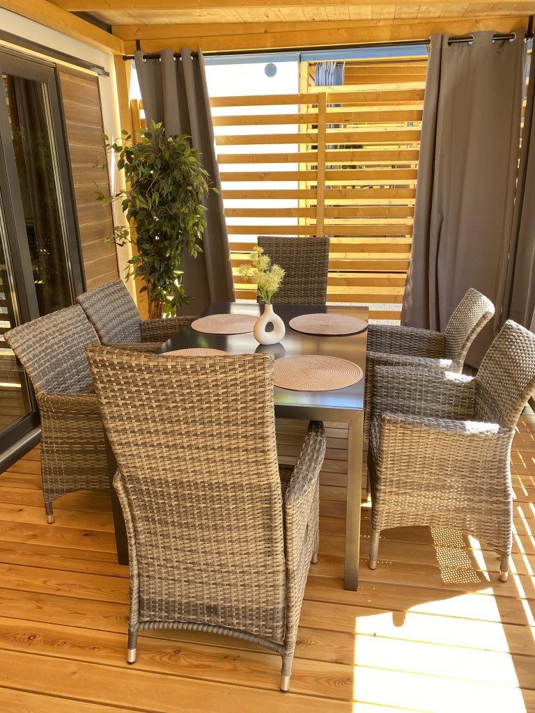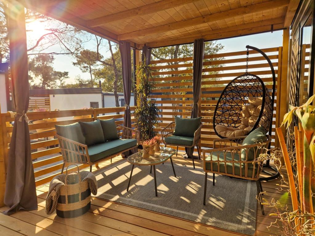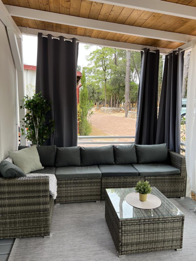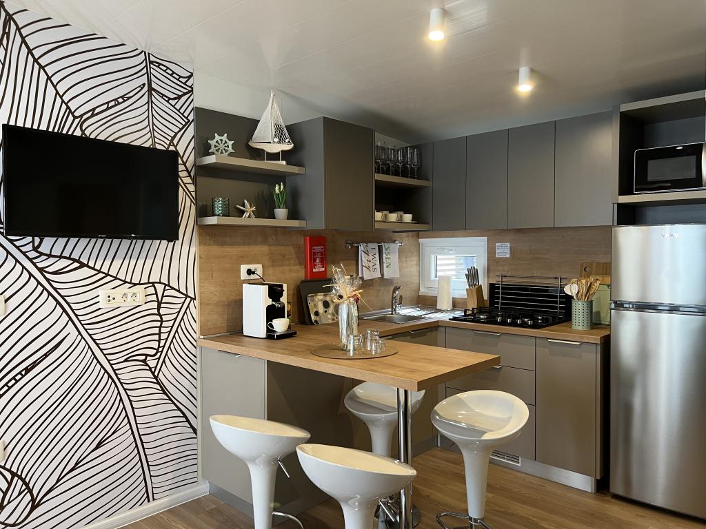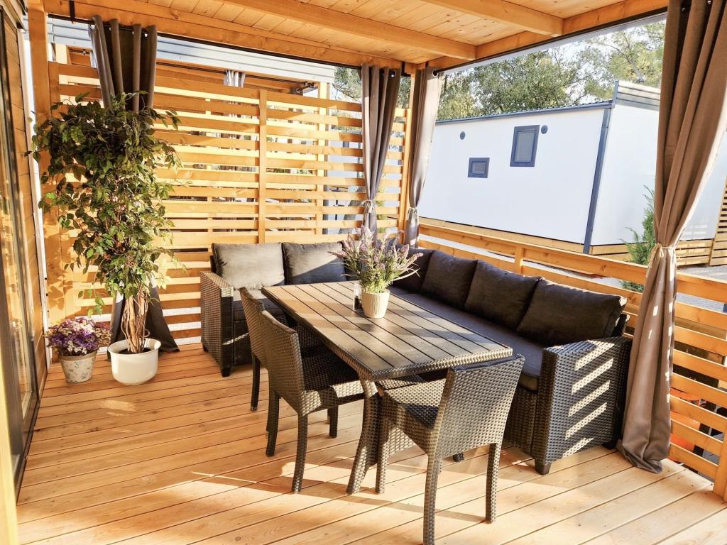 Vsebina mobilne hišice Mobilna hišica vsebuje: • 2 spalnici • Dnevna soba z dodatnim ležiščem za 2 osebi • Popolnoma opremljena kuhinja • Jedilnica • Kopalnica • Velika pokrita terasa približno 30 m² Oprema • Klimatska naprava • Brezplačen WiFi internet • Pametna TV s satelitskimi programi • Aparat za kavo • Električni grelnik vode • Opekač kruha • Mikrovalovna pečica • Popolna kuhinjska oprema • Žar • Sušilnik za lase • Posteljnina vključena • Brisače vključene Idealno za družine Mobilna hišica je še posebej primerna za družine z otroki. Na voljo so: • Otroška posteljica • Otroški stolček Prednosti namestitve Mobilna hišica Biograd na Moru – Kamp Park Soline Le 350 m od plaže Naravna senca borovcev Mirna lokacija Velika terasa Blizu morja Sprehajališče ob morju do centra Restavracije in trgovine v kampu Idealno za družine
