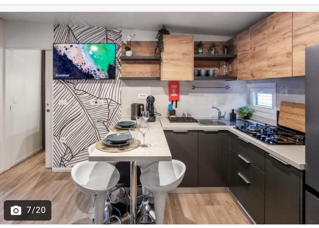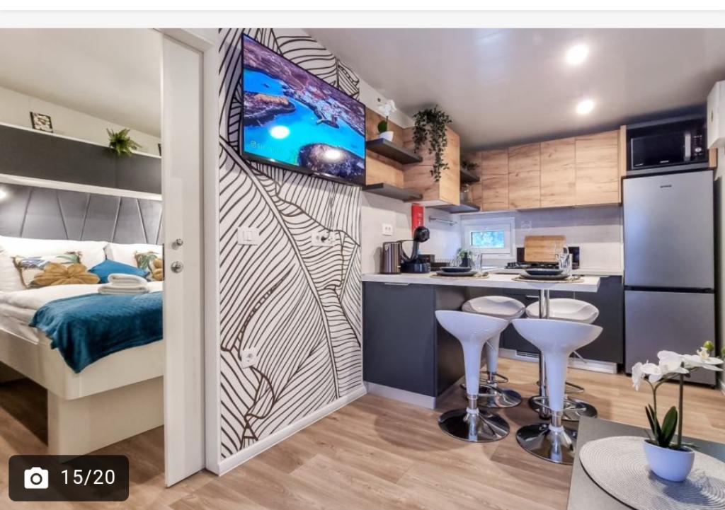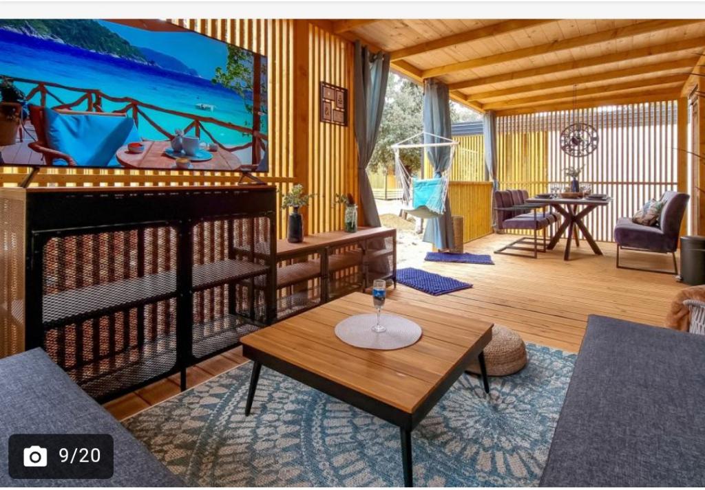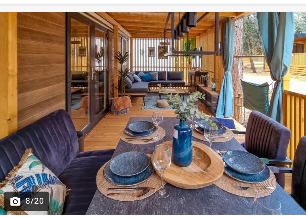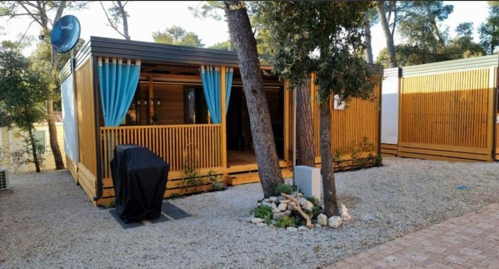 Naša moderno opremljena mobilna hišica ponuja udobno namestitev za do 6 oseb, z 2 prostornima spalnicama, dnevno sobo z raztegljivim kavčem in 2 kopalnicama. Uživajte na veliki pokriti terasi z jedilnico in zunanjo dnevno sobo, idealno za dolga večerna druženja. Tukaj lahko uživate v pikadu ali se sprostite pred velikim televizorjem, medtem ko pečete na našem velikem plinskem žaru in zunanjem štedilniku. Pokrito teraso obdajajo borovci in lahek morski vetrič. Na eni strani terase je prostorna jedilnica z udobnim kavčem in še bolj udobnimi naslanjači, na drugi strani pa naša zunanja dnevna soba ponuja udoben prostor za sedenje, kjer se lahko ne le sprostite, ampak tudi uživate v svojih najljubših televizijskih oddajah na ogromnem televizorju z razpoložljivimi satelitskimi televizijskimi kanali, Netflixom in HBO GO. Hiša se nahaja 3 minute od čudovite plaže.