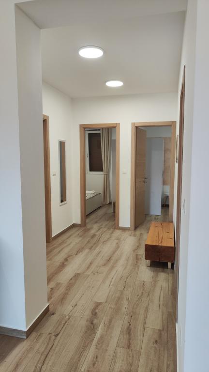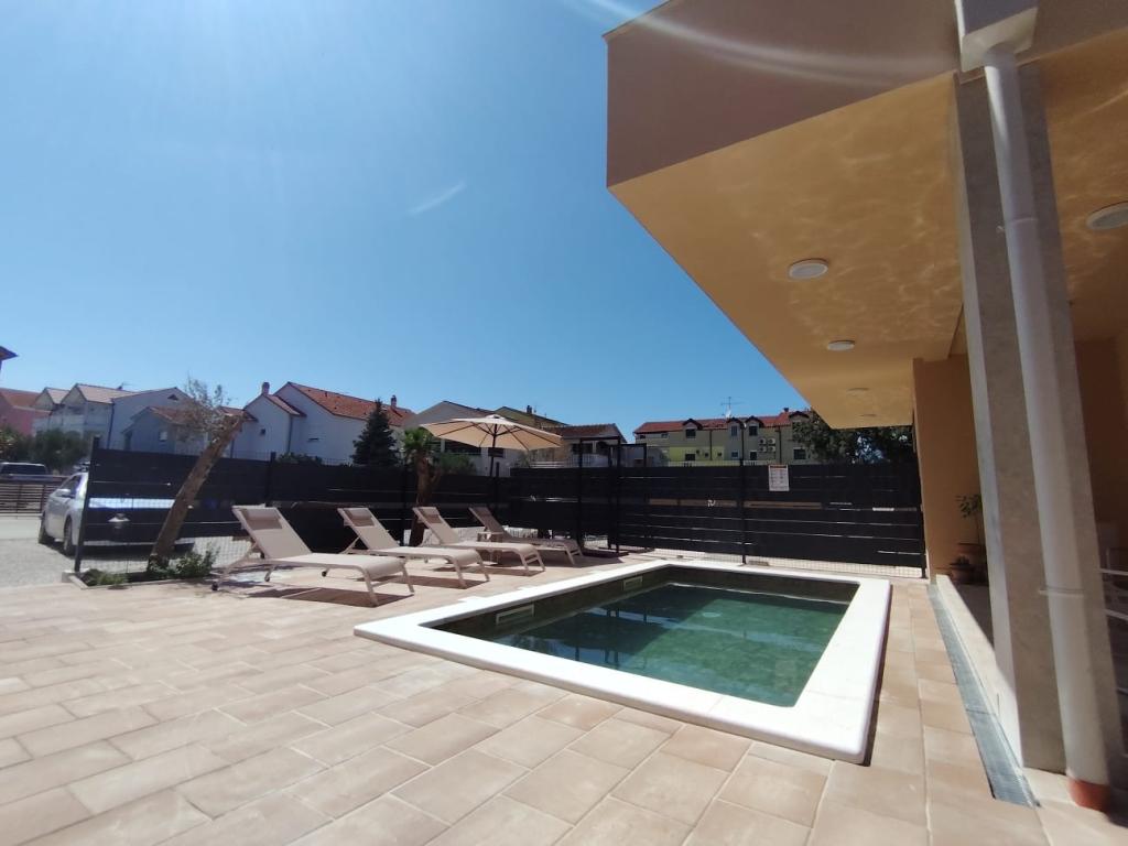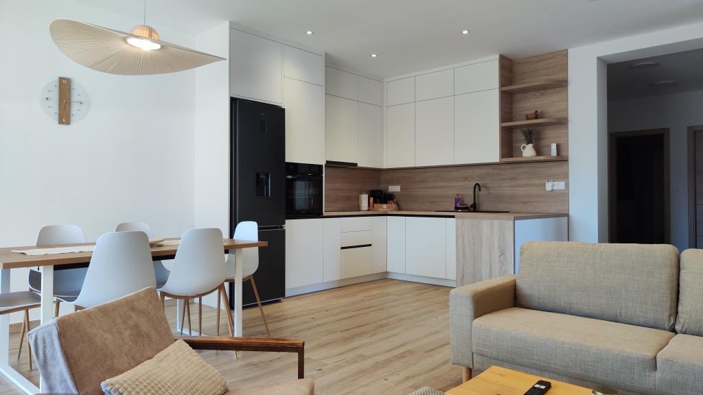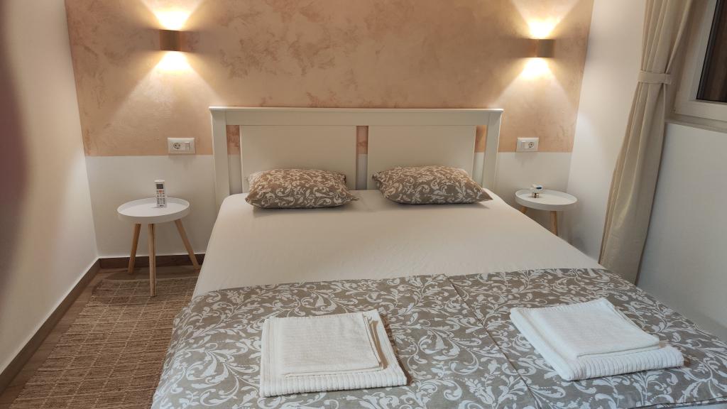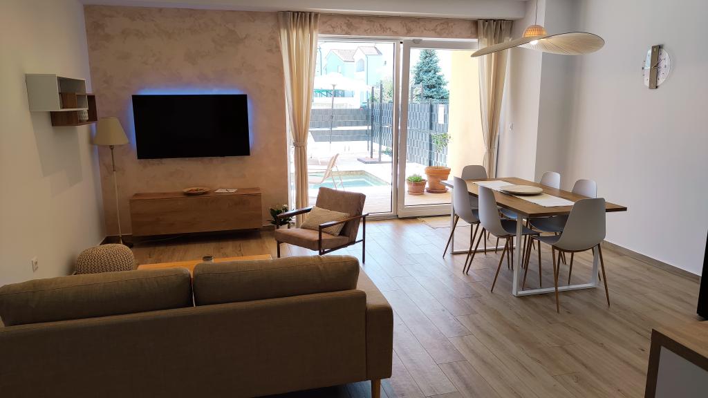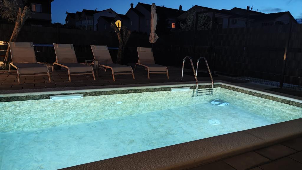 Novozgrajena dvonadstropna počitniška hiša z bazenom in dvema ločenima stanovanjskima enotama (pritličje in prvo nadstropje). Vsaka stanovanjska enota meri 90 kvadratnih metrov in je opremljena s 3 spalnicami, kuhinjo, kopalnico, teraso in dnevno sobo. Parkirišče je zagotovljeno.