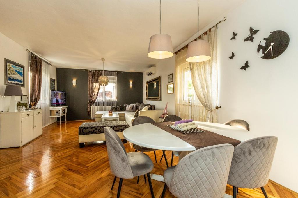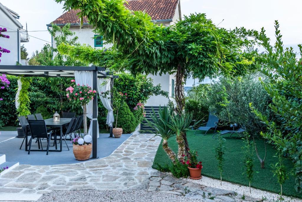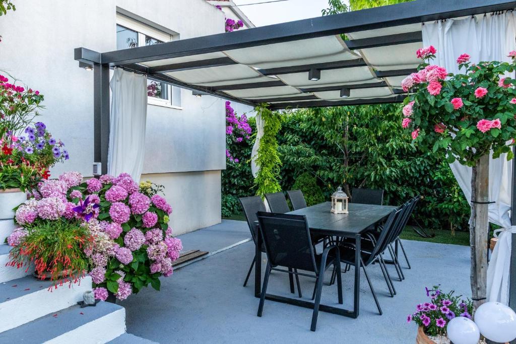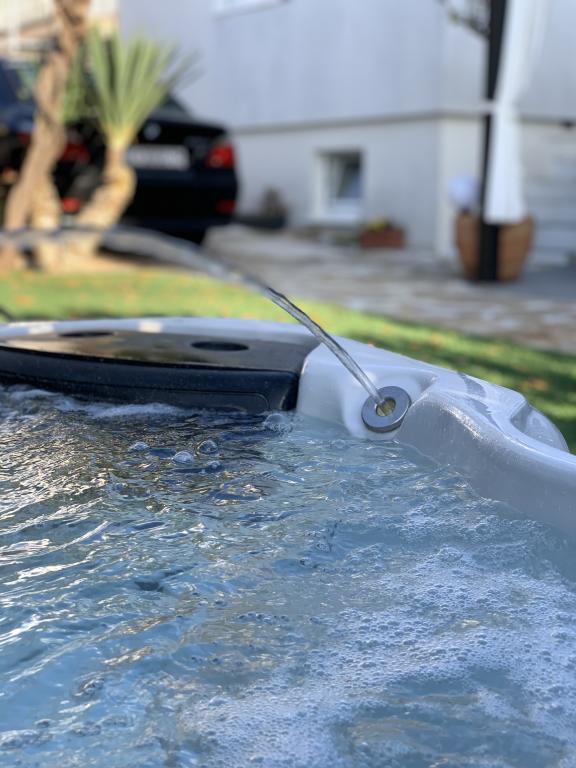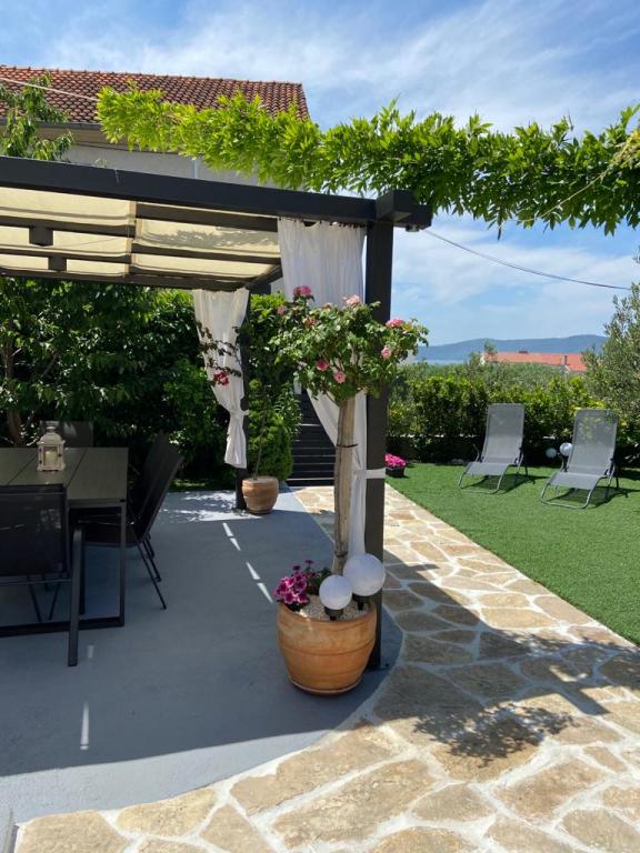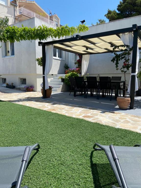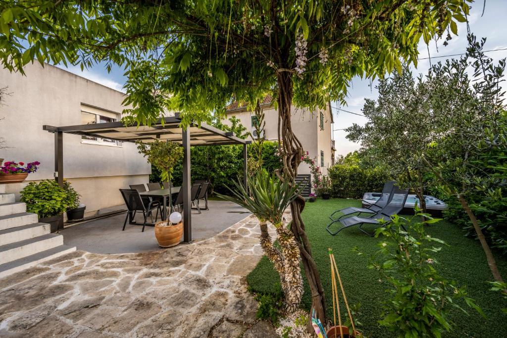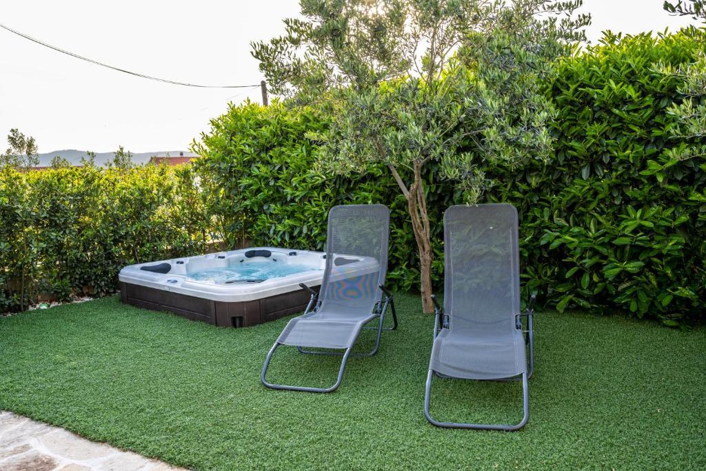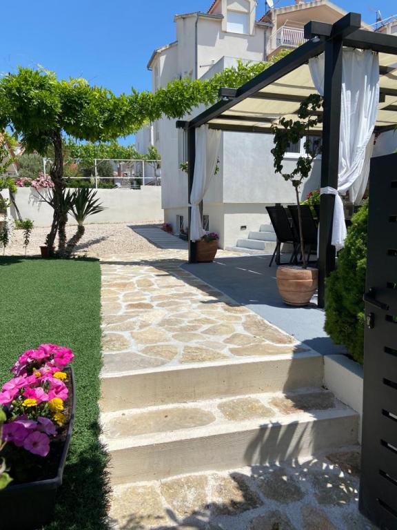 Moderno stanovanje velikosti 85 m2 v pritličju hiše z 2 spalnicama - ena z zakonsko posteljo 180 cm, druga z zakonsko posteljo 160 cm in raztegljivim kavčem (za 1 odraslo osebo ali dva otroka). Na željo gosta je možno dodati otroško posteljico. Dnevna soba je prostorna z velikim raztegljivim kavčem za še 2 osebi, jedilnico, moderno opremljeno kuhinjo s pomivalnim strojem, hladilnikom z zamrzovalnikom, pečico, štedilnikom, vsemi potrebnimi aparati in posodo ter jedilnico. Na voljo je tudi velika kopalnica s kadjo in pralni stroj. Terasa pred hišo s pokrito paviljonom in mizo s stoli, jacuzzijem in ležalniki ter žarom na vrtu. Brezplačno parkiranje za dva avtomobila. Brezplačen wi-fi. Klimatizirana dnevna soba in obe sobi. Plaža je 150 m po ulici. 100 m od hiše je trgovina. Na plaži so tudi 3 beach bari/kavarne, od katerih ima ena igrišče za otroke v senci. Solaris beach resort cca. 1 km od hiše s plažo, restavracijami, aquaparkom in objekti za otroke in odrasle.