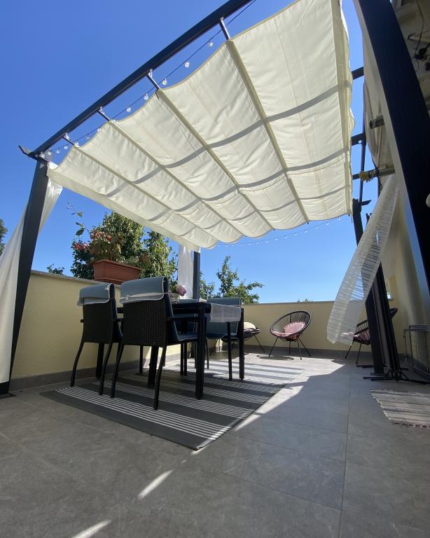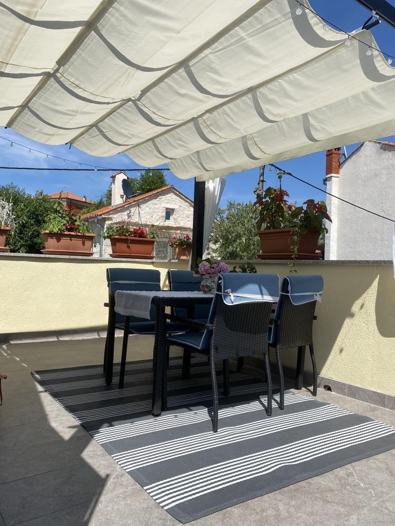 Apartma Violetta se nahaja v slikovitem mestecu Brtonigla (Verteneglio), le 5 km od čudovitih istrskih plaž in vodnega parka Istralandia, enega najbolj priljubljenih vodnih parkov v regiji. Nahaja se v tretjem nadstropju naše hiše, z ločenim zasebnim vhodom – odlična izbira za tiste, ki iščejo miren in sproščujoč dopust. Prostoren in udoben apartma je opremljen z vsemi dodatki, da se boste počutili kot doma: ima dve spalnici z zakonskimi posteljami, sodobno kopalnico s tušem in pralnim strojem ter popolnoma opremljeno kuhinjo z mikrovalovno pečico, aparatom za kavo, grelnikom vode in pomivalnim strojem. Uživajte v trenutkih miru na veliki terasi s pogledom na morje, ki je idealna za zajtrk na prostem, večerno sprostitev ob sončnem zahodu ali branje vaše najljubše knjige. Apartma je klimatiziran, ima hitri Wi-Fi, SAT TV, za pripravo okusnih jedi pa vam je na voljo tudi žar. Gostje imajo tudi zasebno parkirišče pred hišo.