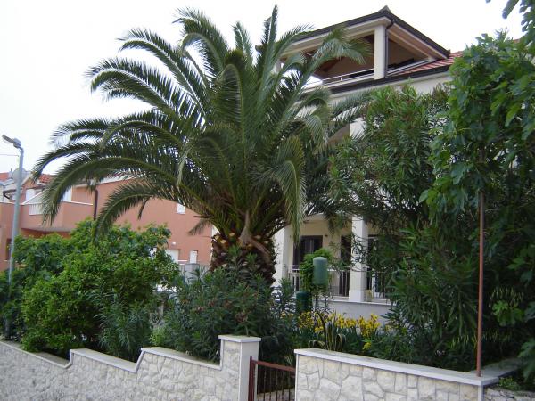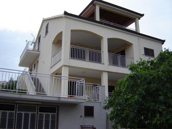 Okrug Gornji - Bušinci Popolnoma nove in popolnoma opremljeni, klimatizirani apartmaji v enostanovanjsko družinski hiši z vrtom in prekrasnim pogledom na morje. Hiša se nahaja v mirnem zalivu s čudovite plaže in čisto morje, 10 minut hoje od centra Okrug Gornji in 5 km od Trogirja. Stanovanje mediteransko vzdušje v prvem nadstropju 110 m2 z 3 balkoni skupno površino 50m2 (dve dvoposteljni sobi in ena twin, veliko sodobno kuhinjo s pomivalnim strojem, velika dnevna soba s pogledom na morje, sodobno kopalnico s kadjo in WC, dodatni WC ). Stanovanje v mansardi območju 90m2 ima dva balkona, skupna površina 17m2 in zagotavlja posebno intimno vzdušje (ena dvoposteljna in ena dvoposteljna soba, velika kuhinja s pomivalnim strojem, velika dnevna soba s pogledom na morje, kopalnica s tušem).
