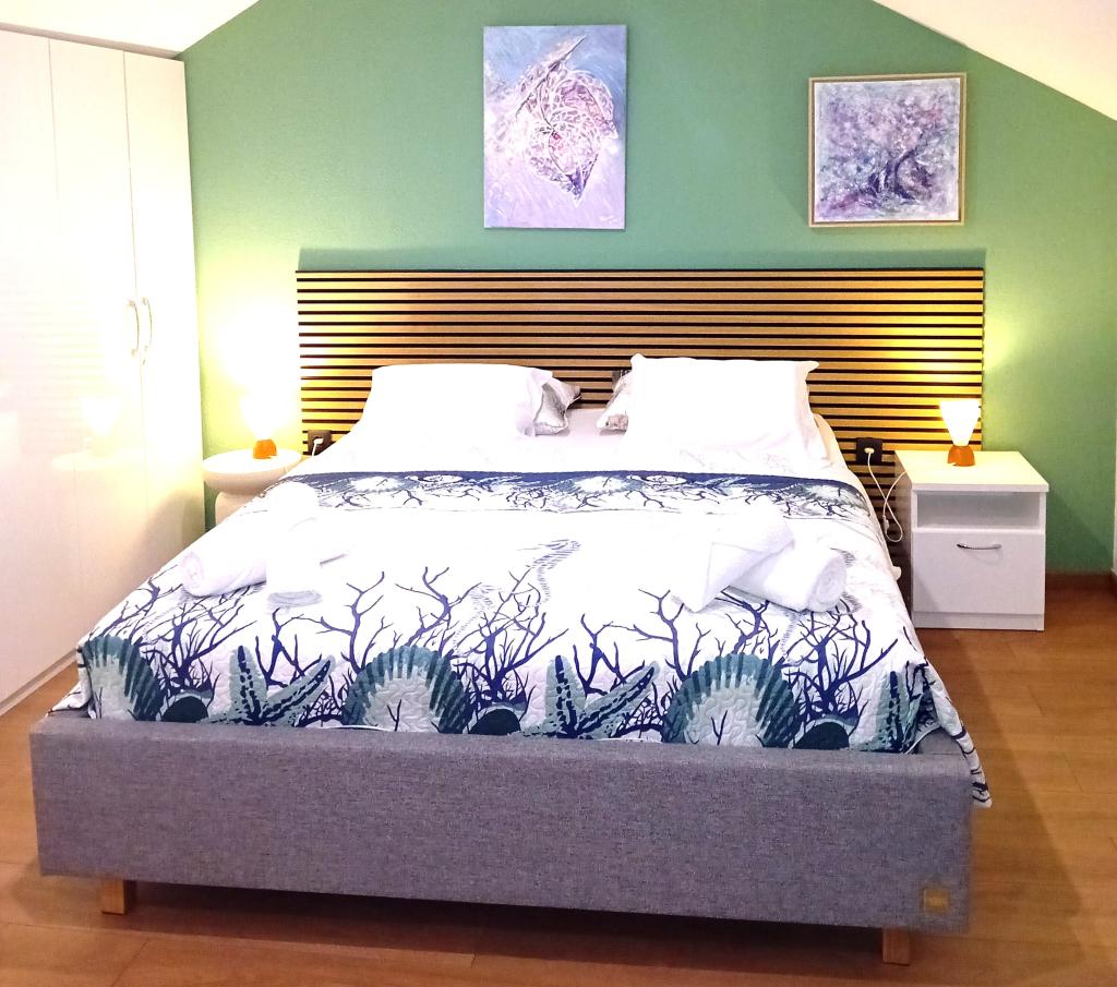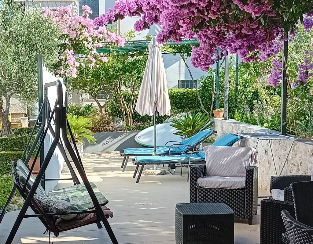 Moderno opremljen apartma s pogledom na morje, veliko teraso in vrtom, blizu plaže, 4 zvezdice. Apartma se nahaja v hiši (pritličje in prvo nadstropje). V pritličju se nahaja: vhodni prostor, kuhinja, dnevna soba in kopalnica. Dnevna soba je opremljena z raztegljivim kavčem za dve osebi. V prvem nadstropju se nahaja: spalnica, kopalnica (z ločeno prho in straniščem) in pokrit balkon velikosti 10 m² s pogledom na morje. Spalnica ima udobno zakonsko posteljo in fotelj, ki se lahko spremeni v otroško posteljico. Kuhinja v pritličju vodi na 45 m2 veliko teraso. Žar in jedilna miza se nahajata v pokritem delu (15 m2), preostali del pa je prostor za sončenje in sprostitev s pogledom na vrt.