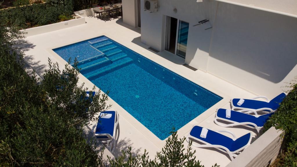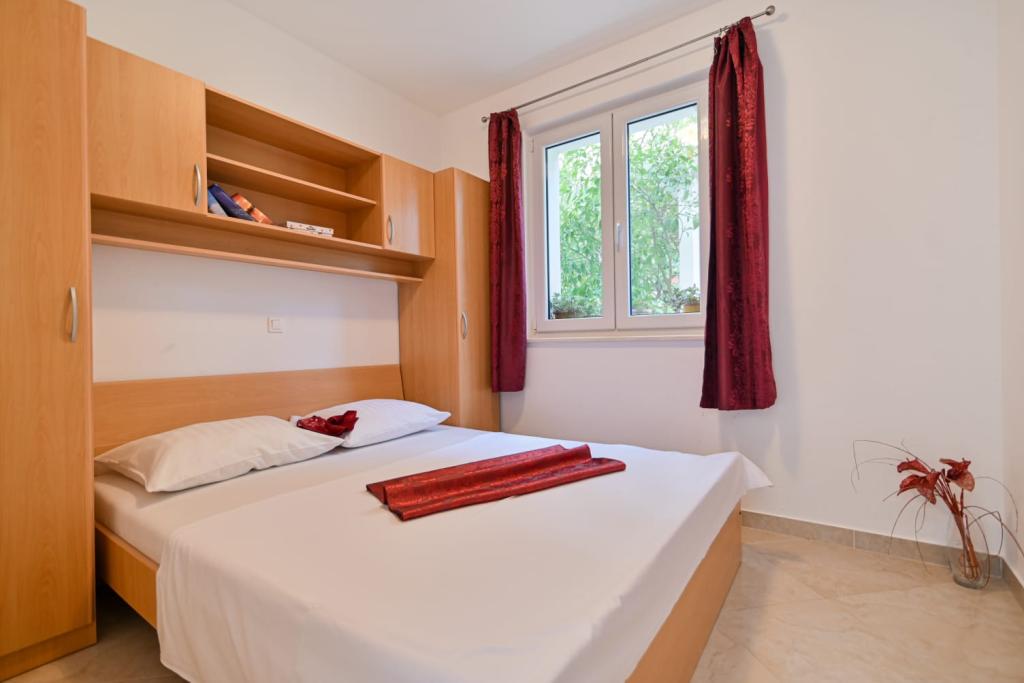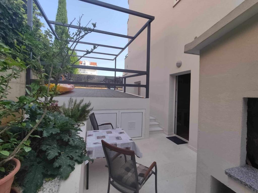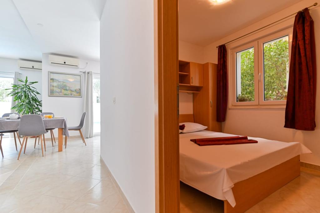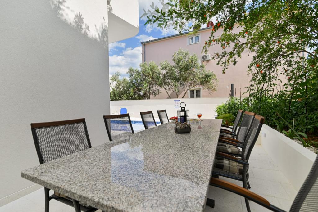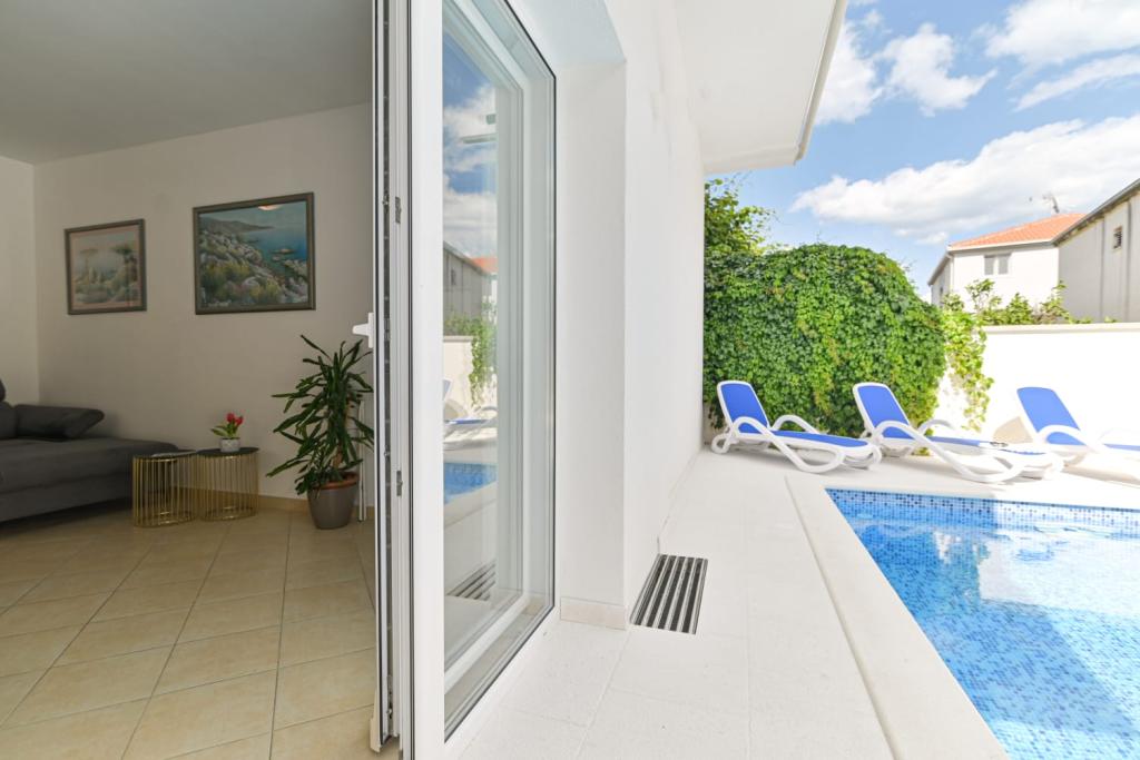 Na južni strani otoka Čiovo, ki je z dvema mostovoma povezan s starim in zgodovinskim mestom Trogir in celino, 200 m od kristalno čistega morja in plaže, vam ponujamo popolnoma opremljen apartma z zasebnim bazenom. . Apartma z dvema spalnicama se nahaja v pritličju, pred katerim je zasebni bazen in žar. Parkirišče je zagotovljeno v sklopu objekta.