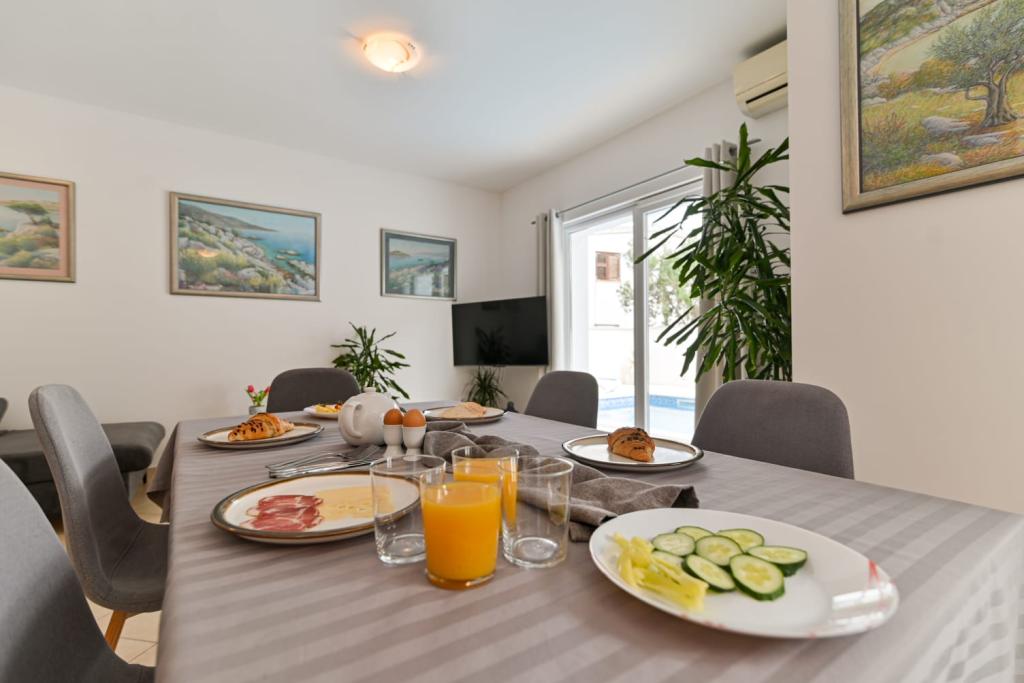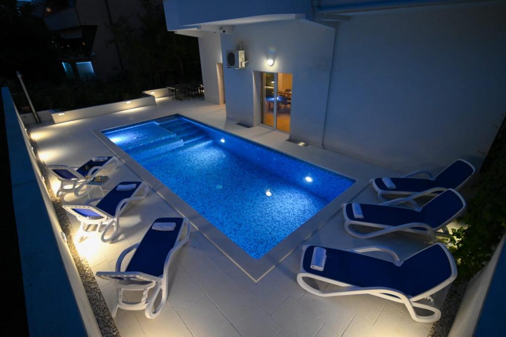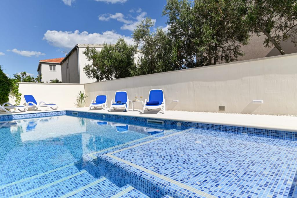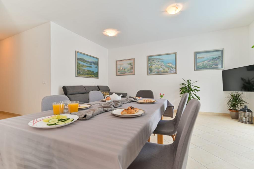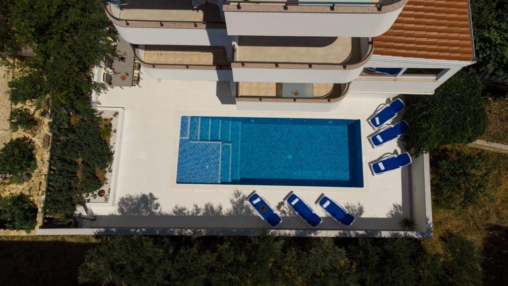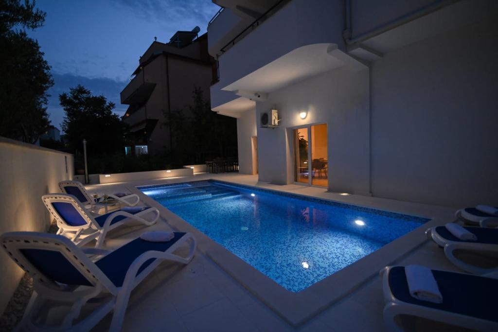Na južni strani otoka Čiovo, ki je z dvema mostovoma povezan s starim in zgodovinskim mestom Trogir in celino, 200 m od kristalno čistega morja in plaže, vam ponujamo popolnoma opremljen apartma z zasebnim bazenom. . Apartma z dvema spalnicama se nahaja v pritličju, pred katerim je zasebni bazen in žar. Parkirišče je zagotovljeno v sklopu objekta.
