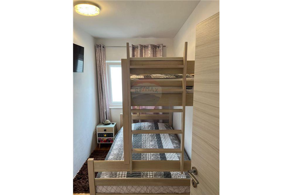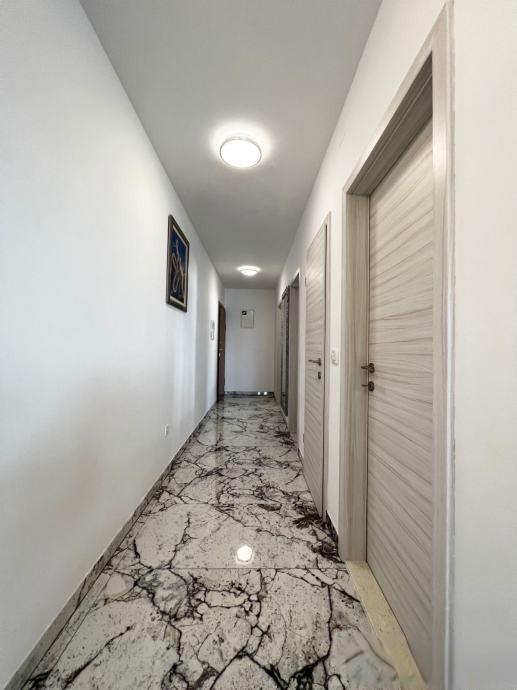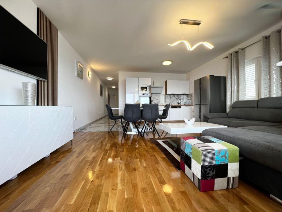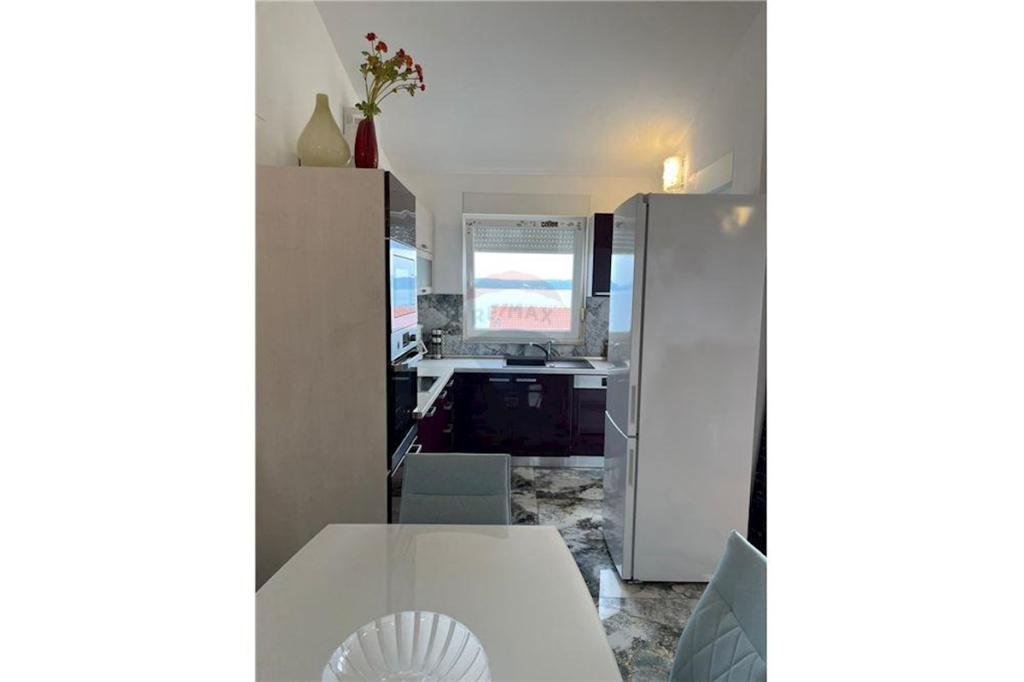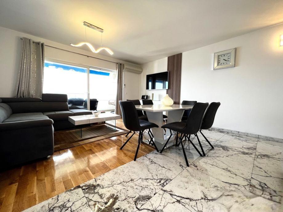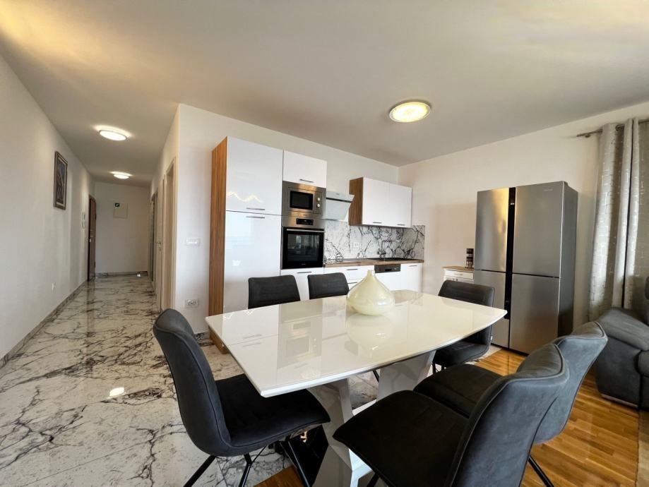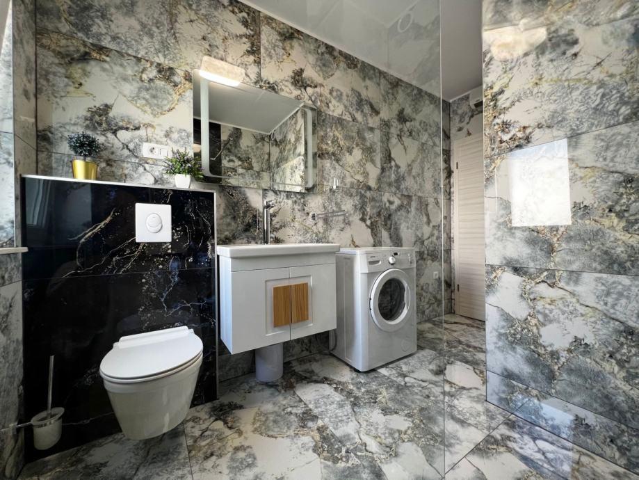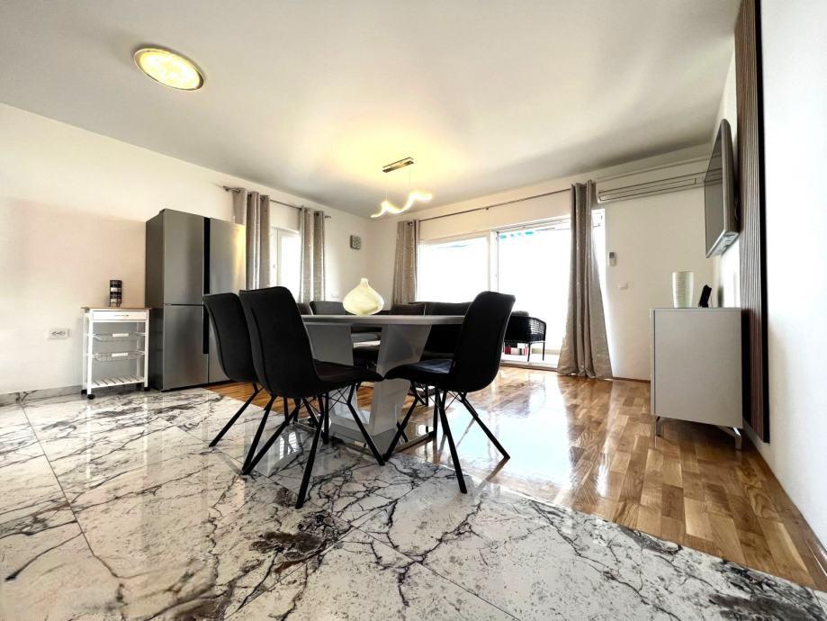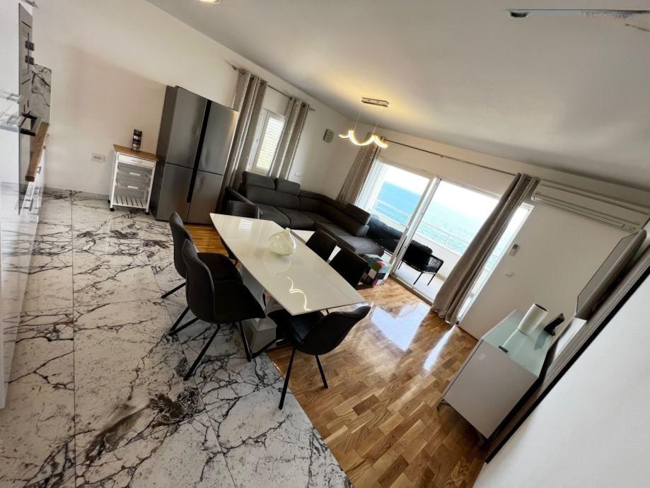 Sodoben penthouse navdušuje z elegantnim dizajnom in spektakularnim pogledom na otoke. Prostoren dnevni prostor vključuje sodobno in udobno pohištvo, klimatsko napravo in velik 190 cm TV, kar ustvarja prijetno okolje. Velike drsne stene ponujajo neverjeten panoramski pogled na otoke, ki prežemajo prostor z naravno svetlobo. Kuhinja je opremljena z najsodobnejšimi aparati, jedilnica je prostorna in omogoča uživanje v obrokih s čudovitim pogledom na morje. Ima tri udobne sobe, od katerih je vsaka opremljena z luksuzno posteljo, TV in klimatsko napravo za popolno udobje gostov. Kopalnica s kabino za prhanje poskrbi za razkošno sprostitev, ločeno stranišče pa dodatno udobje. Velik balkon z vrtno garnituro in gugalnico je idealen kraj za sprostitev in uživanje v sončnem vzhodu in zahodu s čudovitim pogledom na otoke. Ta apartma predstavlja kombinacijo modernega stila, udobja in neverjetne naravne lepote, ki zagotavlja nepozabno izkušnjo bivanja ob obali.