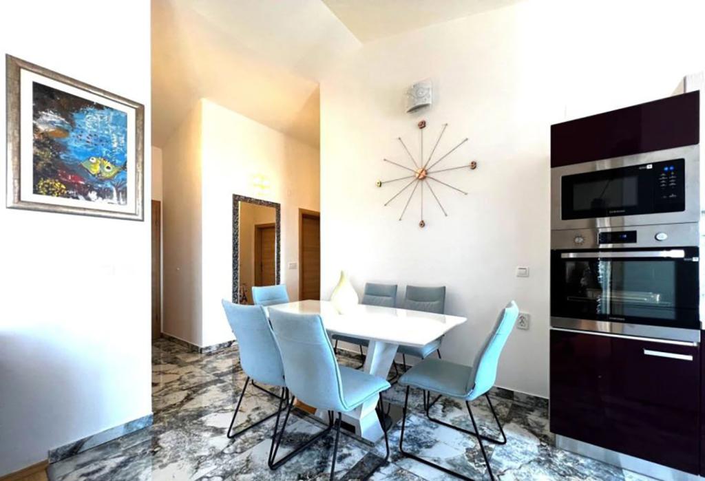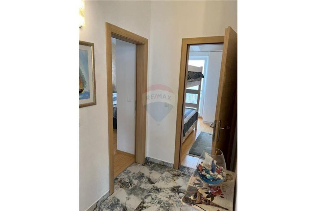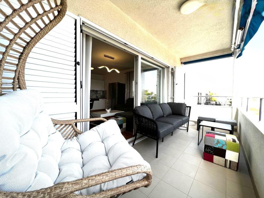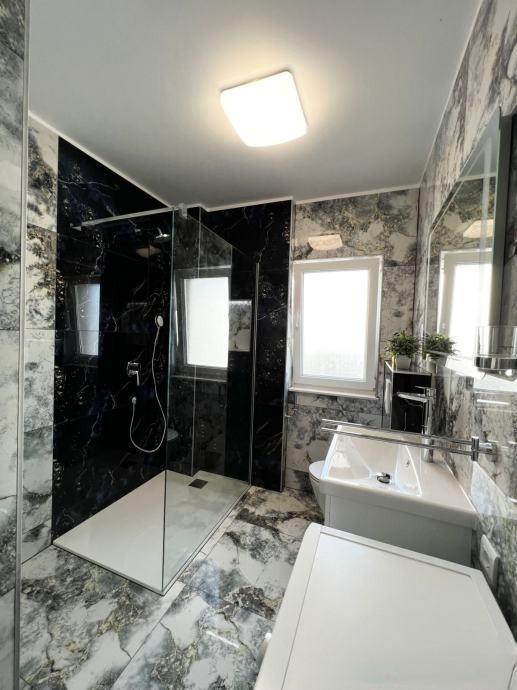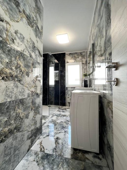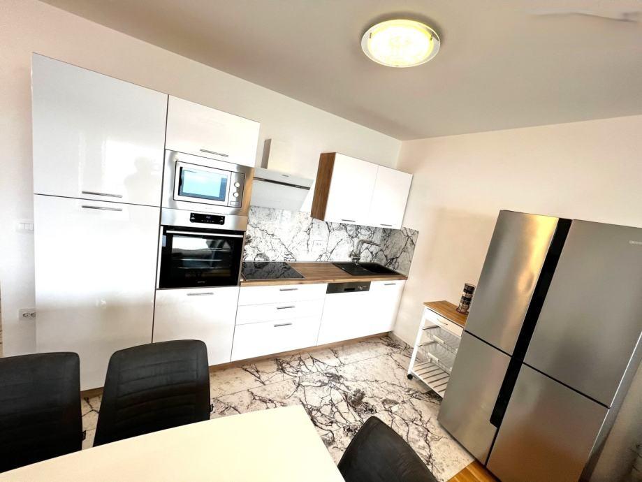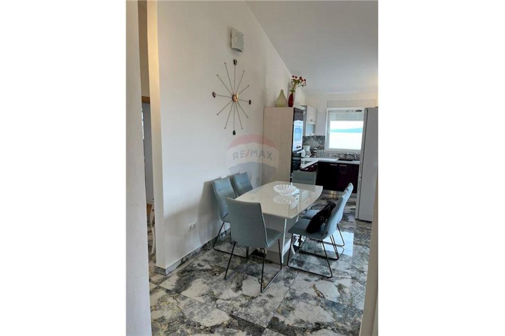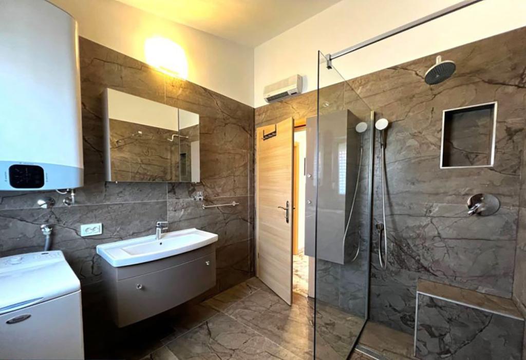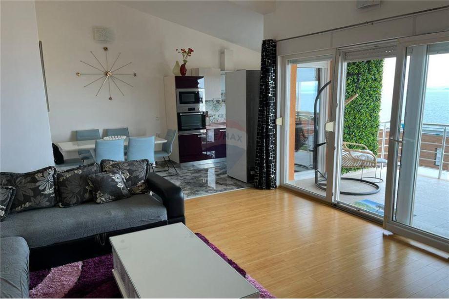 Sodoben penthouse navdušuje z elegantnim dizajnom in spektakularnim pogledom na otoke. Prostoren dnevni prostor vključuje sodobno in udobno pohištvo, klimatsko napravo in velik 190 cm TV, kar ustvarja prijetno okolje. Velike drsne stene ponujajo neverjeten panoramski pogled na otoke, ki prežemajo prostor z naravno svetlobo. Kuhinja je opremljena z najsodobnejšimi aparati, jedilnica je prostorna in omogoča uživanje v obrokih s čudovitim pogledom na morje. Ima tri udobne sobe, od katerih je vsaka opremljena z luksuzno posteljo, TV in klimatsko napravo za popolno udobje gostov. Kopalnica s kabino za prhanje poskrbi za razkošno sprostitev, ločeno stranišče pa dodatno udobje. Velik balkon z vrtno garnituro in gugalnico je idealen kraj za sprostitev in uživanje v sončnem vzhodu in zahodu s čudovitim pogledom na otoke. Ta apartma predstavlja kombinacijo modernega stila, udobja in neverjetne naravne lepote, ki zagotavlja nepozabno izkušnjo bivanja ob obali.