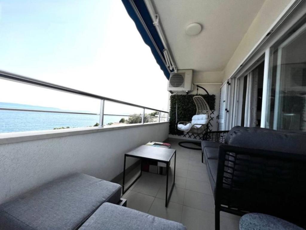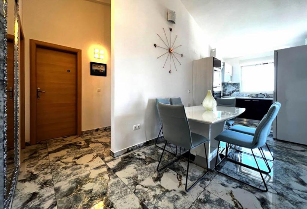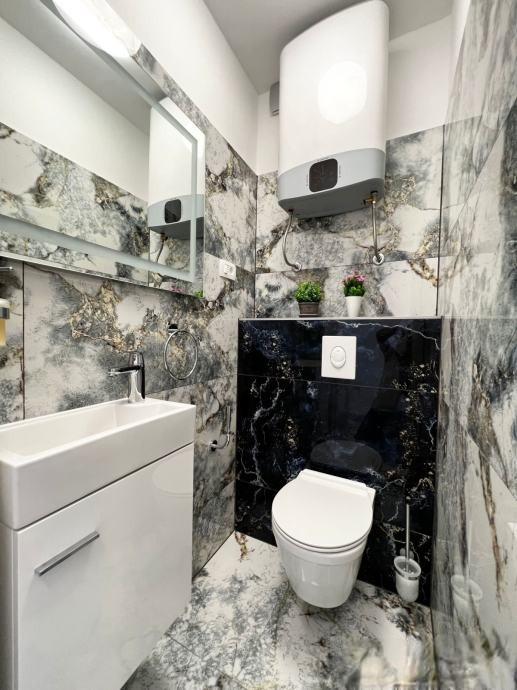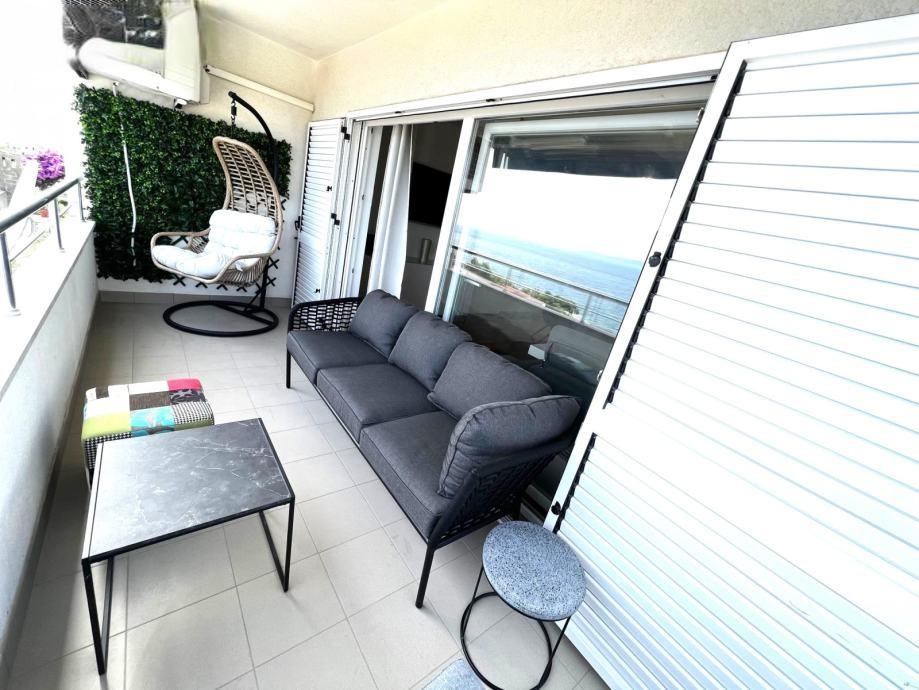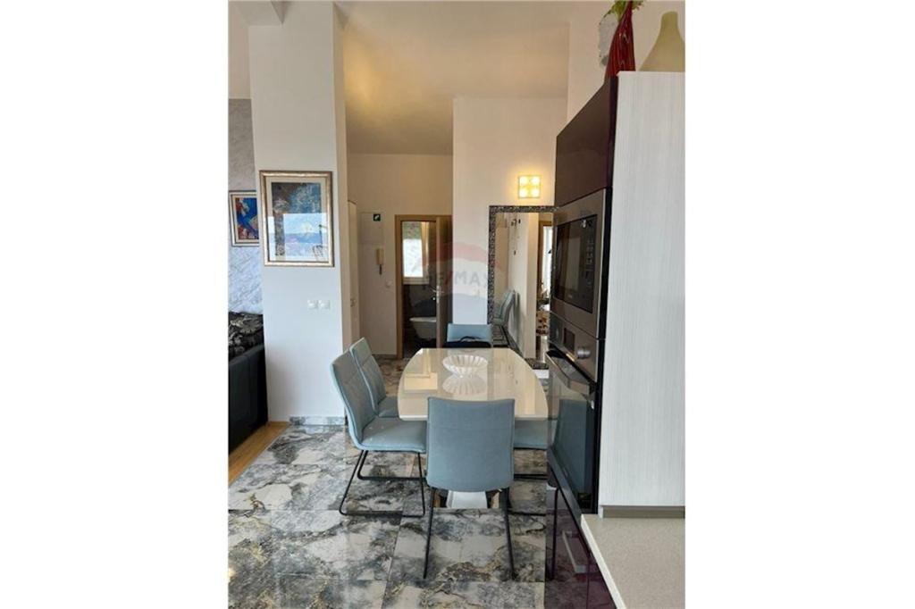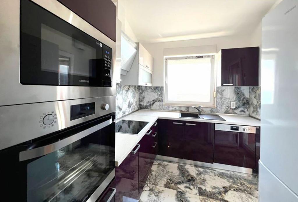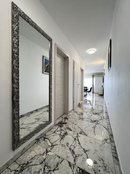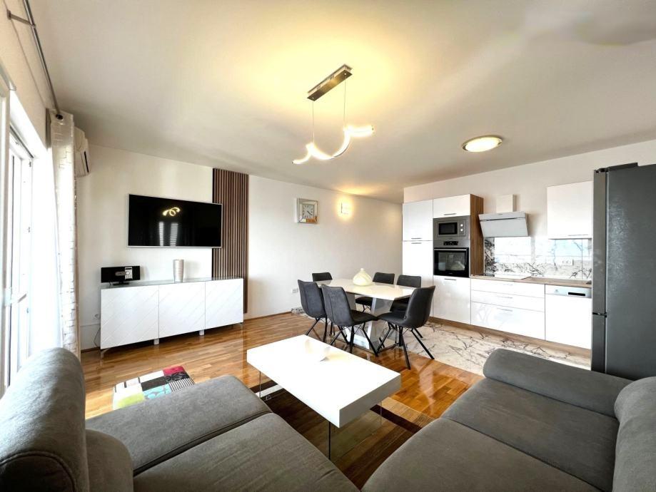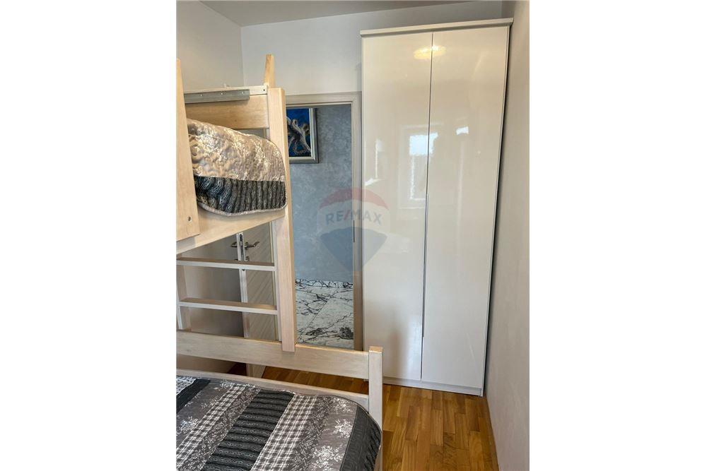 Sodoben penthouse navdušuje z elegantnim dizajnom in spektakularnim pogledom na otoke. Prostoren dnevni prostor vključuje sodobno in udobno pohištvo, klimatsko napravo in velik 190 cm TV, kar ustvarja prijetno okolje. Velike drsne stene ponujajo neverjeten panoramski pogled na otoke, ki prežemajo prostor z naravno svetlobo. Kuhinja je opremljena z najsodobnejšimi aparati, jedilnica je prostorna in omogoča uživanje v obrokih s čudovitim pogledom na morje. Ima tri udobne sobe, od katerih je vsaka opremljena z luksuzno posteljo, TV in klimatsko napravo za popolno udobje gostov. Kopalnica s kabino za prhanje poskrbi za razkošno sprostitev, ločeno stranišče pa dodatno udobje. Velik balkon z vrtno garnituro in gugalnico je idealen kraj za sprostitev in uživanje v sončnem vzhodu in zahodu s čudovitim pogledom na otoke. Ta apartma predstavlja kombinacijo modernega stila, udobja in neverjetne naravne lepote, ki zagotavlja nepozabno izkušnjo bivanja ob obali.