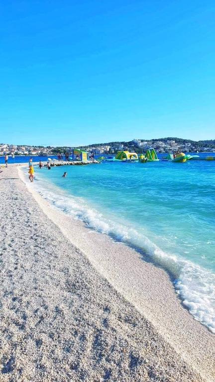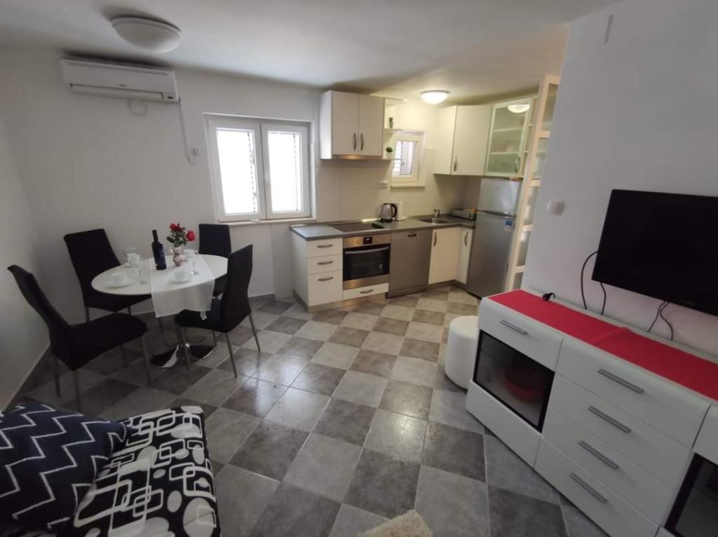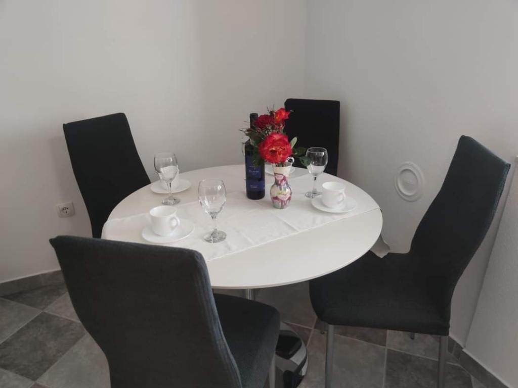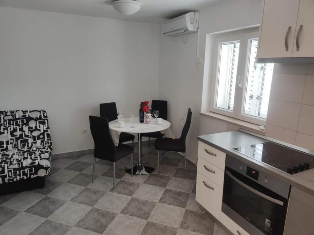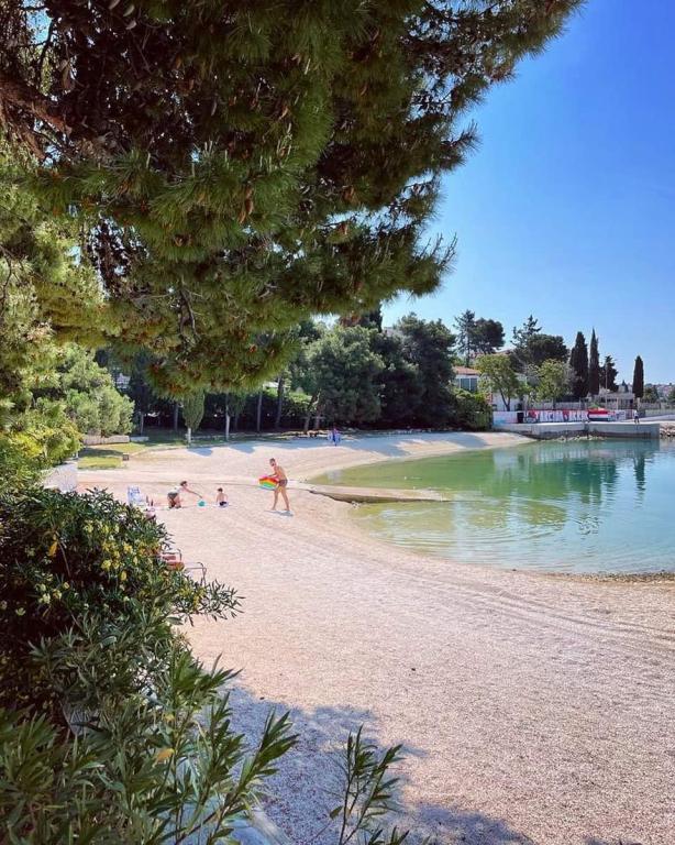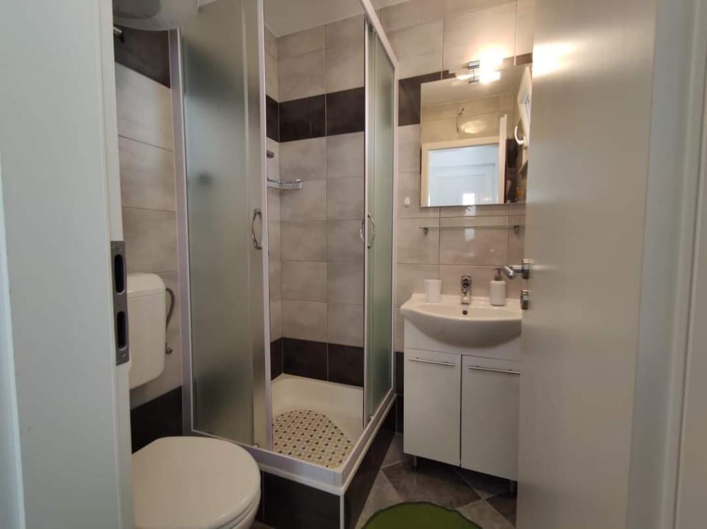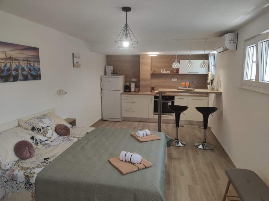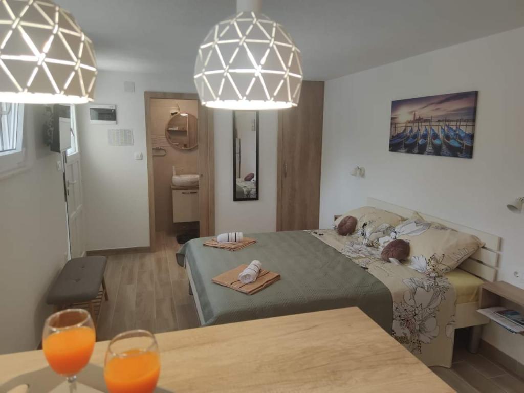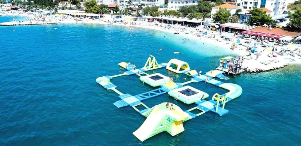 Apartmaji se nahajajo na mirni lokaciji, obdani z zelenjem, oddaljeni pa so 200 m ali manj kot 5 minut hoje. Studio app je za 2 osebi, s tem, da lahko manjši otrok uporablja tudi potovalno posteljico. Apartma 2+2 je idealen za družino z otroki do 10 let. Vse je na dosegu roke, zato ne potrebujete avta.