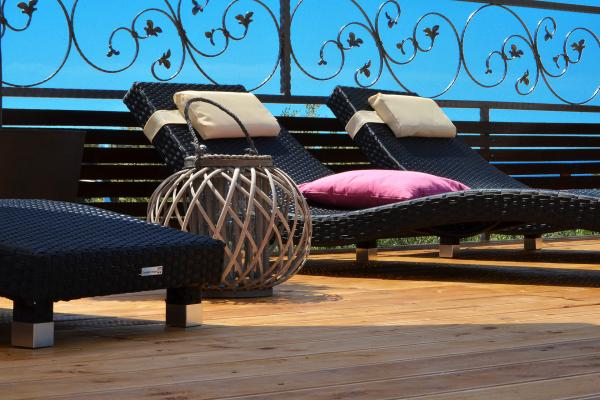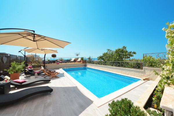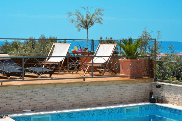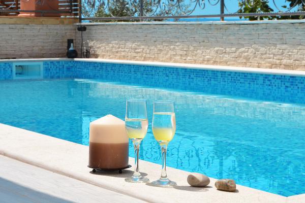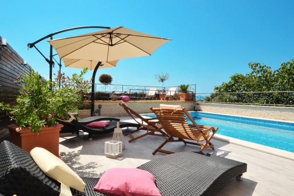 Pred hišo je 35m2 velik hidromasažni bazen, opremljen s ležalniki, gugalnicami, mizo in stoli ter žarom.