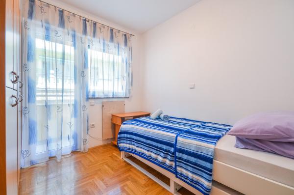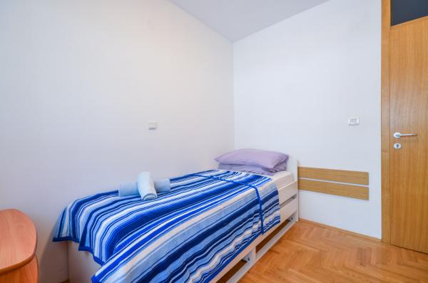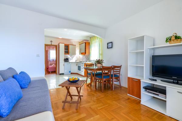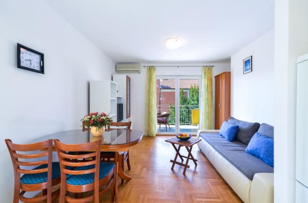 Apartma Valerija se nahaja v samotni tlakovani ulici, ki se nahaja v prvi vrsti do morja na znameniti peščeni plaži "Crni Mol". V bližini je več kavarn, ki se nahajajo tik ob morju, pa tudi številne restavracije s hitrimi in počasnimi prigrizki, poleg apartmaja je tudi majhen trg z osnovnimi živili in higienskimi potrebščinami ter pekarna, ki deluje skoraj 24 ur. Središče mesta je oddaljeno približno 600 m ali deset minut sprostitvenih sprehodov ob morju. Apartma ima dve ločeni spalnici, ena z zakonsko posteljo in ena z dvema ločenima posteljama. Kopalnica ima tuš in umivalnik z WC-jem. Kuhinja je v celoti opremljena s pripomočki, hladilnik ima zamrzovalnik, kuhalnik za vodo, pečica, plinski štedilnik, pomivalni stroj in aparat za kavo. V isti sobi je tudi jedilnica in raztegljiv kavč za dve osebi. Za zajtrk ali za sproščujočo večerjo s kozarcem vina je na voljo terasa za 6 oseb s pogledom na morje. Klimatska naprava, TV in wifi.