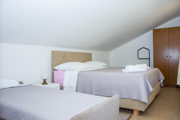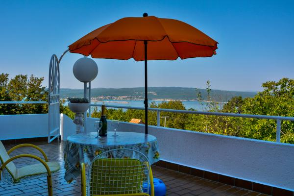 Moderno opremljeni apartmaji za 3-5 oseb z veliko teraso in čudovitim pogledom na morje. Udobne postelje, klimatska naprava in brezžični internet. Varno parkiranje.