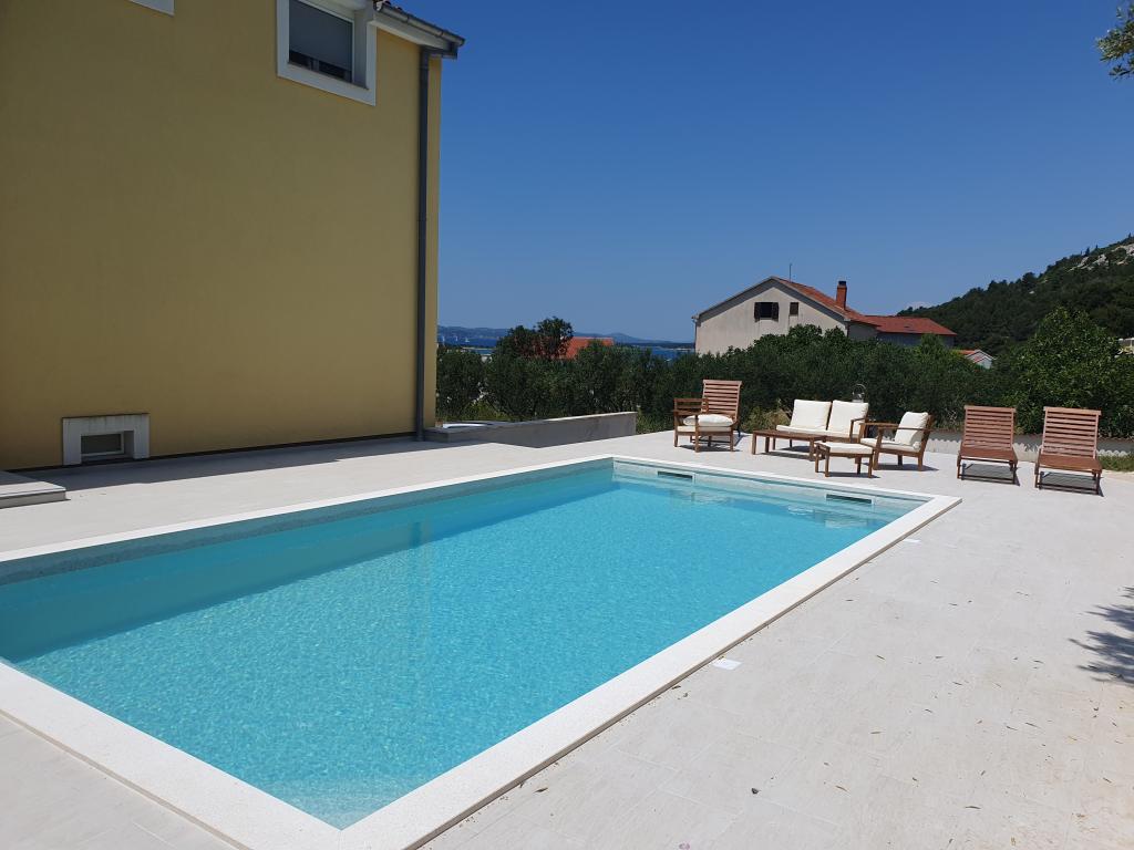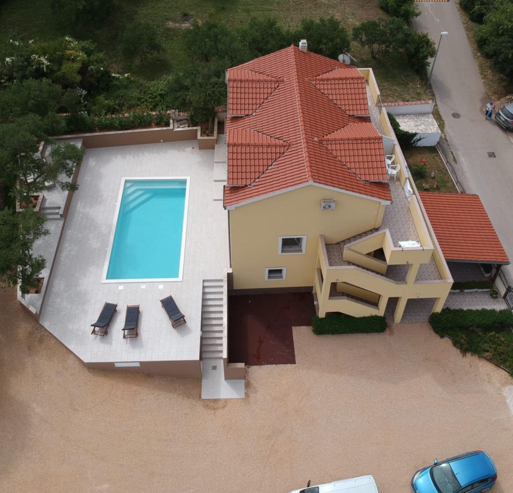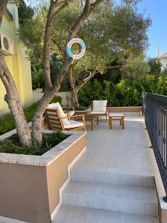Novi, popolnoma opremljeni apartmaji s pogledom na morje, bazenom, SAT TV, klimatsko napravo, kuhinjo, WC tušem, 2-3 minute hoje do morja. Nepremičnina se nahaja v čudovitem oljčnem nasadu, ki se razprostira na približno 2500 m2, z veliko cvetja in zelenja. Novo zgrajen 32 m2 bazen z 200 m2 površine za kopanje in pogledom na morje. Žar na voljo za skupno uporabo. Apartma številka 1 je sestavljen iz: 3 sob (od tega 2 spalnici), 55 m2, 4+2 osebi. Vhod v pritličju, preko terase v dnevno sobo. Pritličje: spalnica 1 z zakonsko posteljo, dnevna soba s kuhinjo in sedežno garnituro, spalnica 2 z zakonsko posteljo in raztegljivim kavčem, WC/tuš, terasa. Apartmaja 2 in 3 sta sestavljena iz 2 sob, od tega 1 spalnica, dnevna soba s kuhinjo in sedežno garnituro, WC/tuš, balkon. Relax House je sestavljen iz 3 sob, od tega 2 spalnici, v dnevni sobi je kuhinja in raztegljiv kavč, WC/tuš, terasa. Počitniška hiša je sestavljena iz 3 sob, vključno z 2 spalnicama, dnevno sobo in straniščem/tušem, teraso.