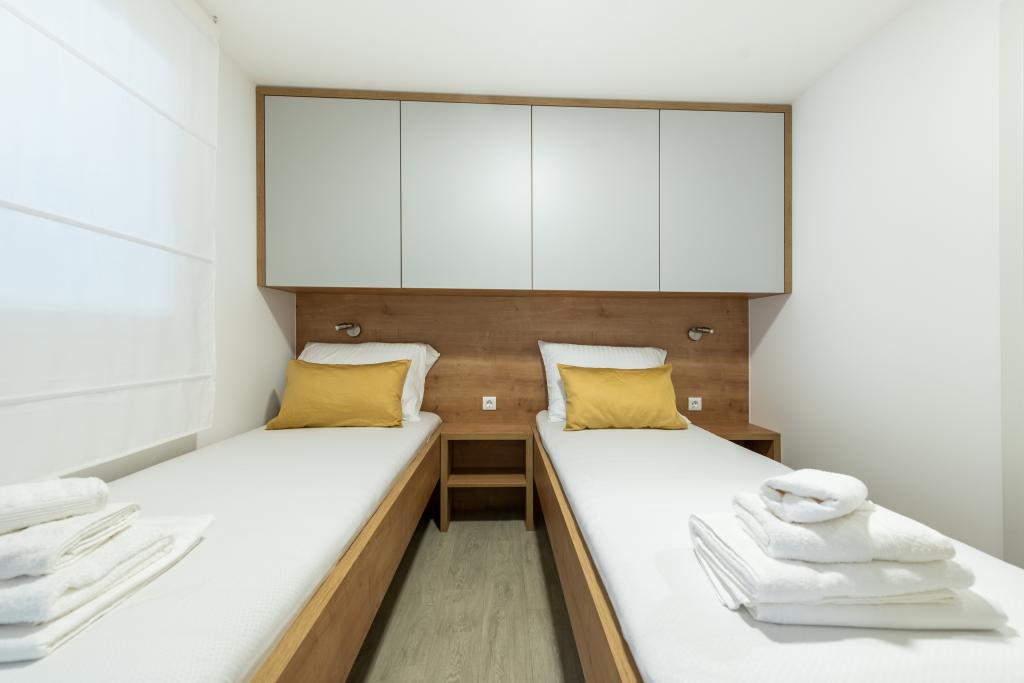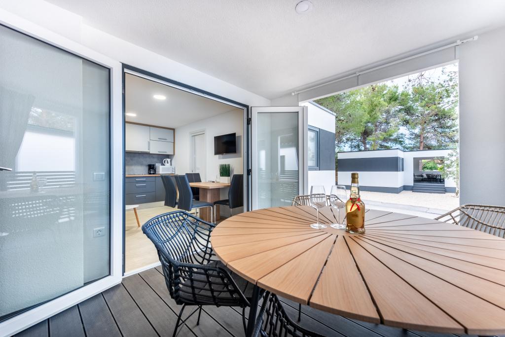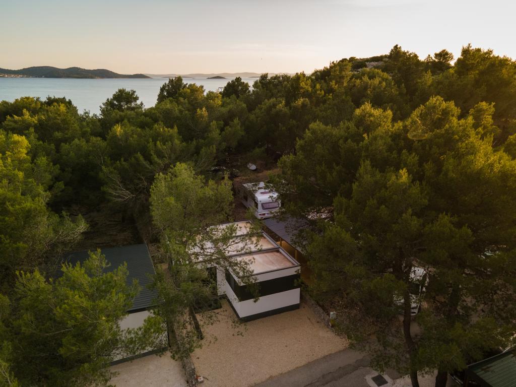 Luksuzna mobilna hišica, moderno opremljena s čudovito teraso, ki bo zadovoljila vse okuse. Mobilna hiška se nahaja v kampu "Oaza mira" na odlični lokaciji v senčnem borovem gozdu, le 50 m od čudovite plaže. V neposredni bližini se nahaja velik bazen in številni športni objekti (teniško igrišče, balinišče, otroško igrišče). Kamp ima restavracijo, supermarket in velik sanitarni objekt s pralnico. Hišice imajo po dve spalnici, sobo z zakonsko posteljo in sobo z dvema ločenima posteljama. V dnevni sobi lahko kotna sedežna garnitura služi kot dodatno ležišče za še dve osebi. Hiša ima veliko dnevno sobo, kuhinjo s posodo, štedilnikom in hladilnikom ter eno/dve kopalnici s tušem, umivalnikom in straniščem. Mobilna hiška ima vrt s teraso in nadstreškom.