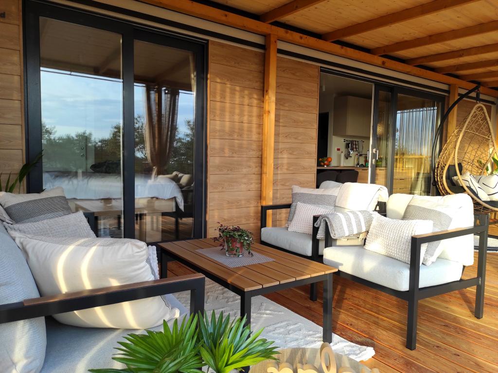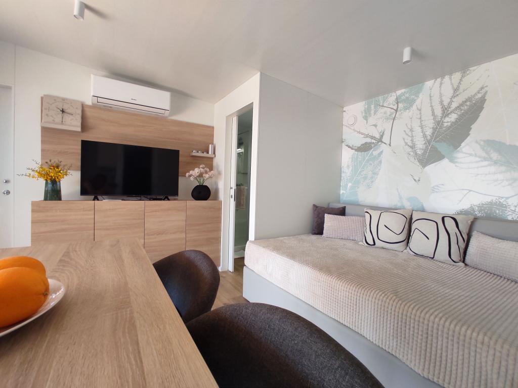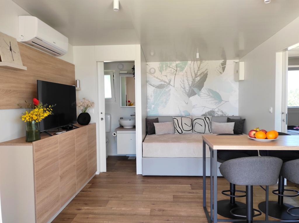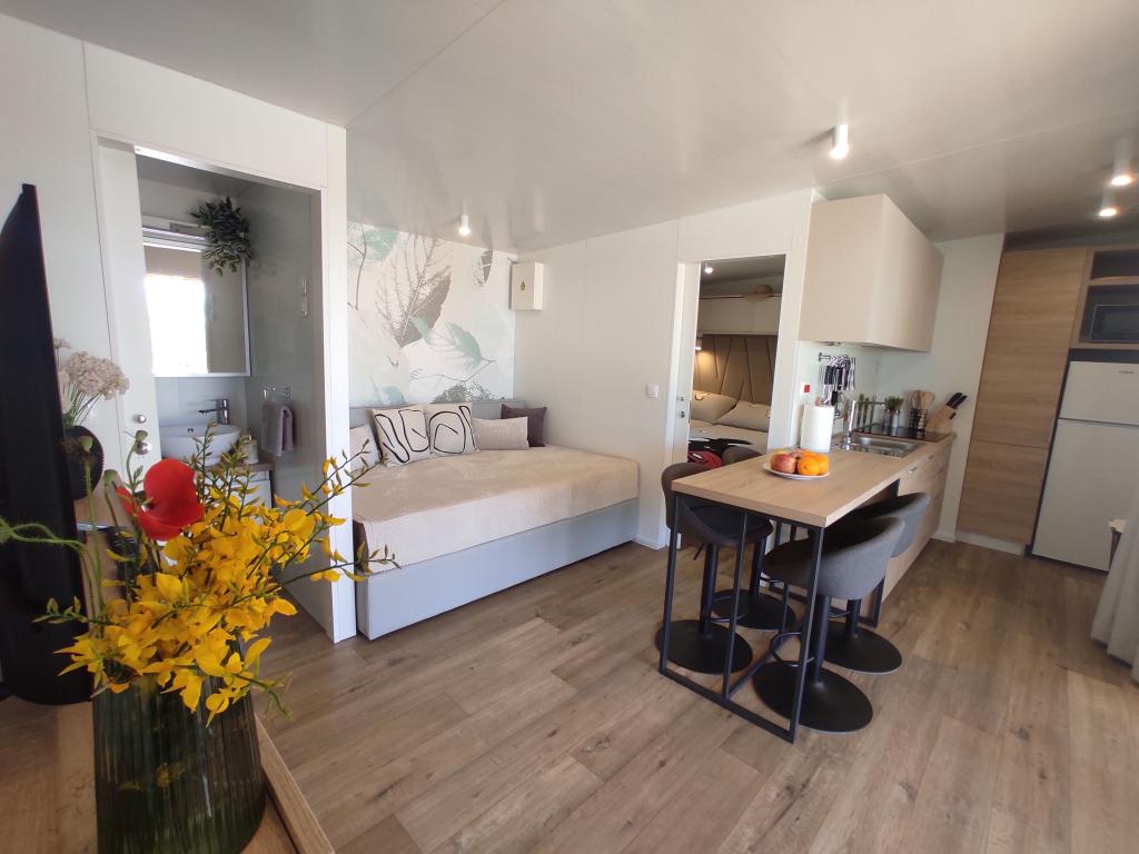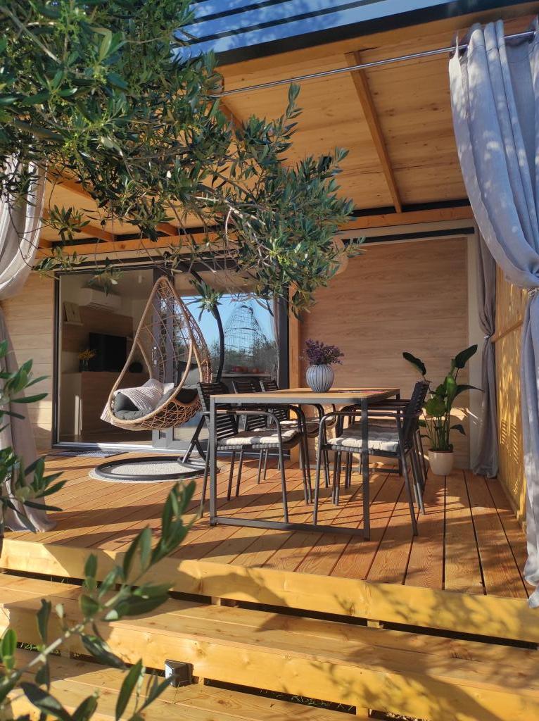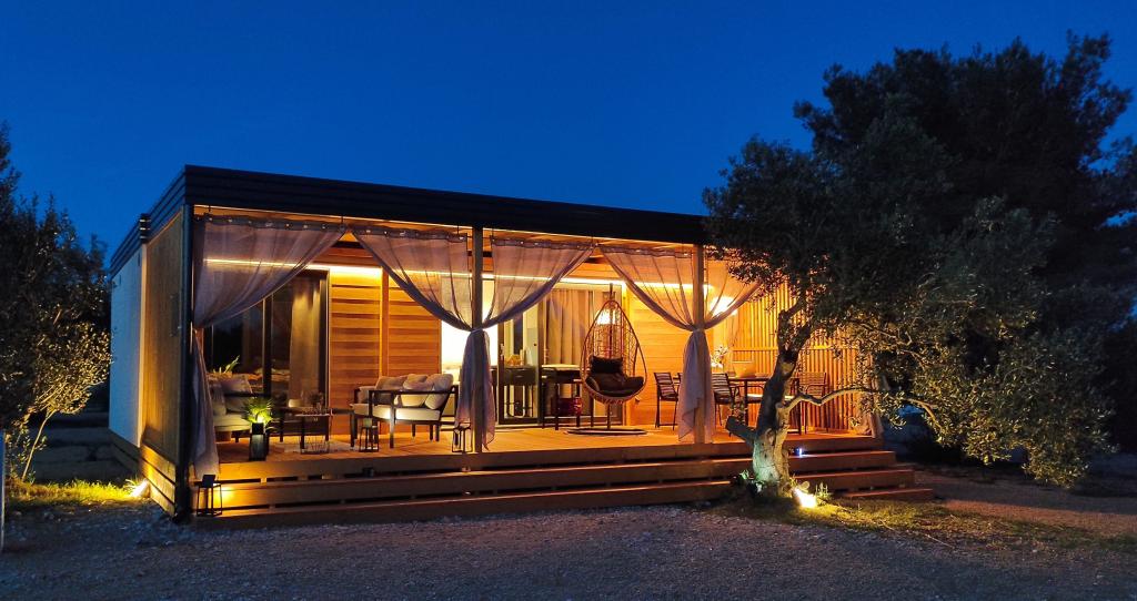 Mobilna hiška Zen Zone Premium je moderno urejena hiša, popolnoma opremljena z aparati in vsem, kar potrebujete za sprostitev in uživanje v težko pričakovanem dopustu. Skupaj s teraso ima hiša skupno površino 65 m2 in prostoren vrt za uživanje na počitnicah. Pitje jutranje kave na prostorni zunanji terasi ob žvrgolenju ptic in vonju narave, ki vam jo prinaša morski vetrič, se zdi idealen začetek dneva. Ko se želite osvežiti v morju, ste od plaže oddaljeni le 150 metrov. Če se odločite za bivanje v senci terase, v tišini prebirate dobro knjigo ali se samo hladite z brezplačnim WiFi-jem, gledate televizijo ali samo zadremate, smo poskrbeli, da boste to dobili v mobilni hiški Zen Zone. Ko vam ni do kuhanja obrokov v kuhinji, smo vam priskrbeli velik žar in električno pečico za preprosto, a raznoliko pripravo okusnih jedi. Hiša je namenjena celotni družini, družbi prijateljev in vsem, ki si želijo dobrega počitka, sprostitve in uživanja v miru čiste narave.
