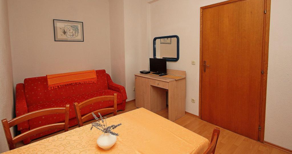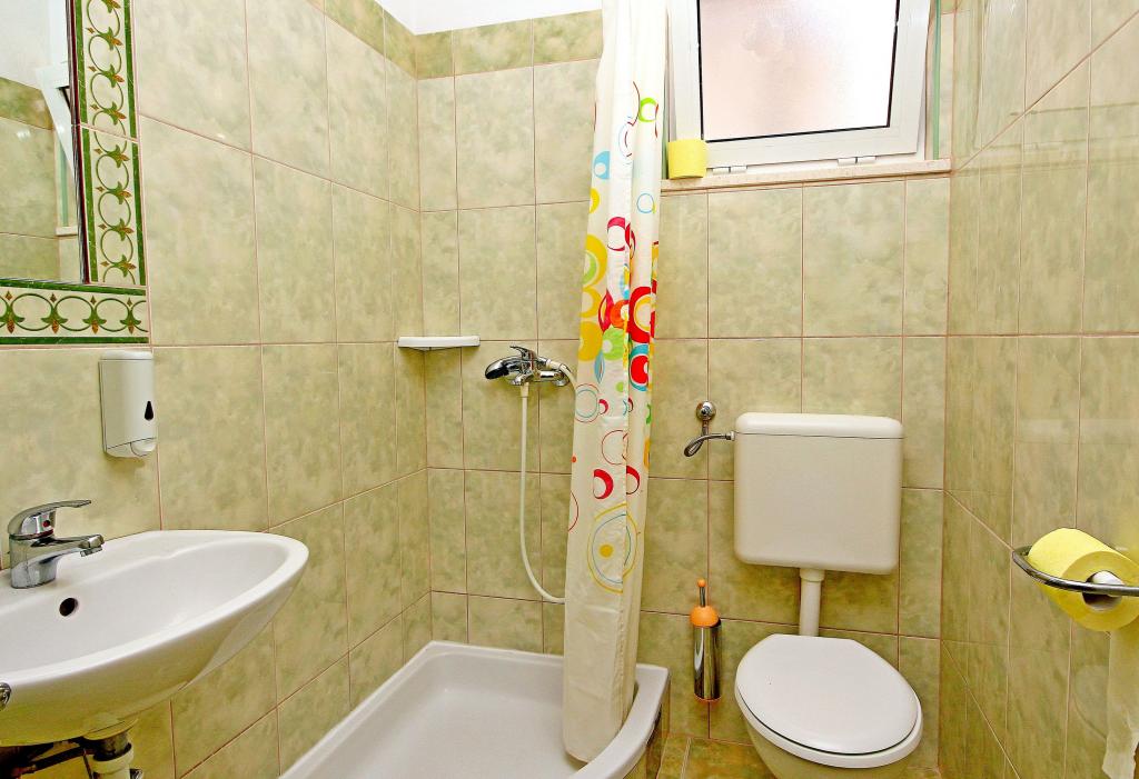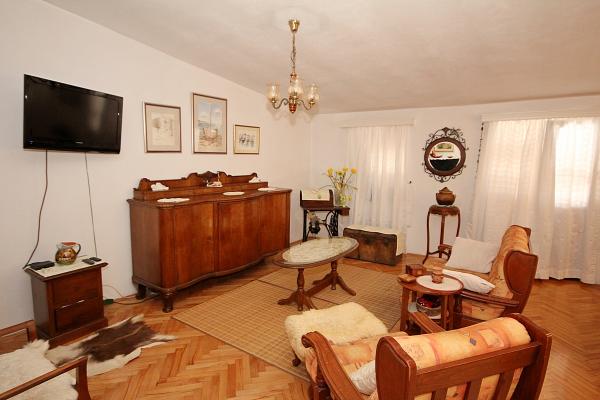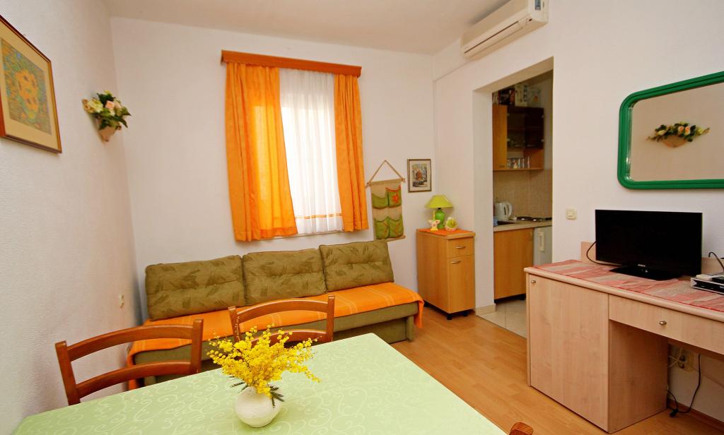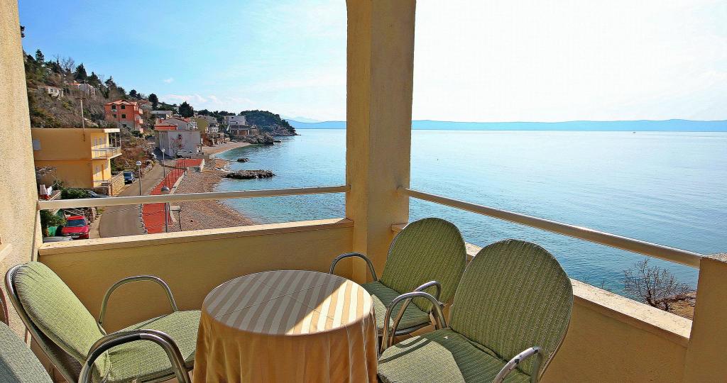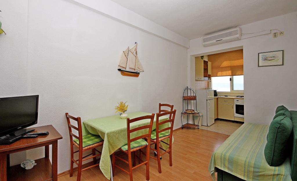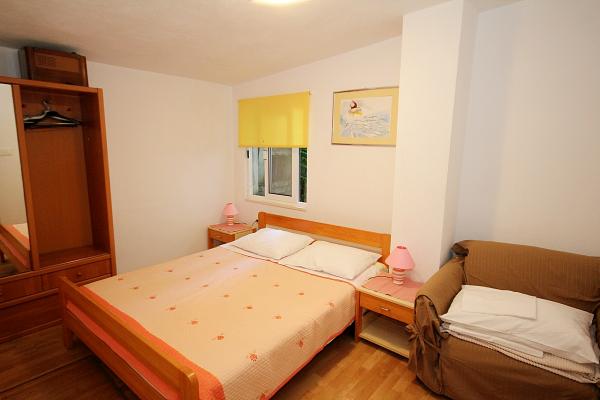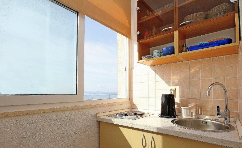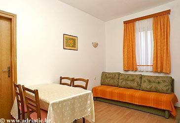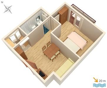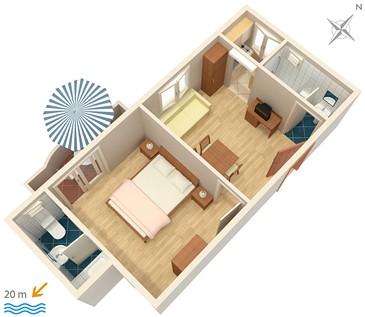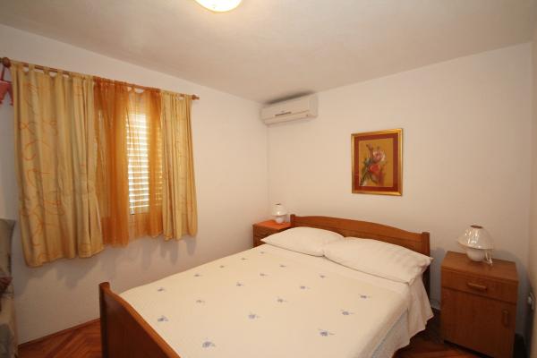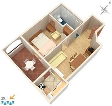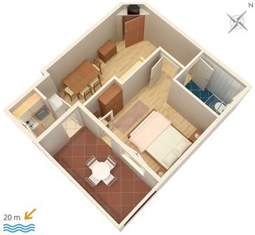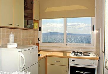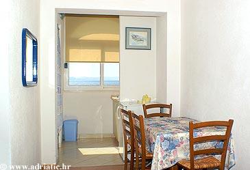Apartmaji na plaži s pogledom na morje, parkirišče pred stavbo na obali, mogoče privez za čoln v pristanišču, za hišo je dvorišče z žarom. Velik apartma A8 se nahaja v hiši zraven v tretjem nadstropju je sestavljen iz 3 spalnice, 3 kopalnice, velika kuhinja s pomivalnim strojem, dnevna soba in dva balkona z južnih in zahodnih pogledom na morje in gore. V sprednji lastnine je parkirišče za dva avtomobila.