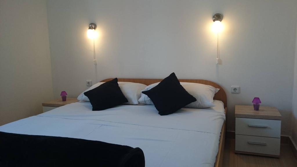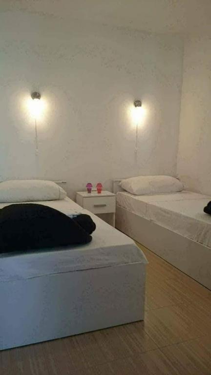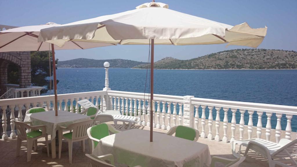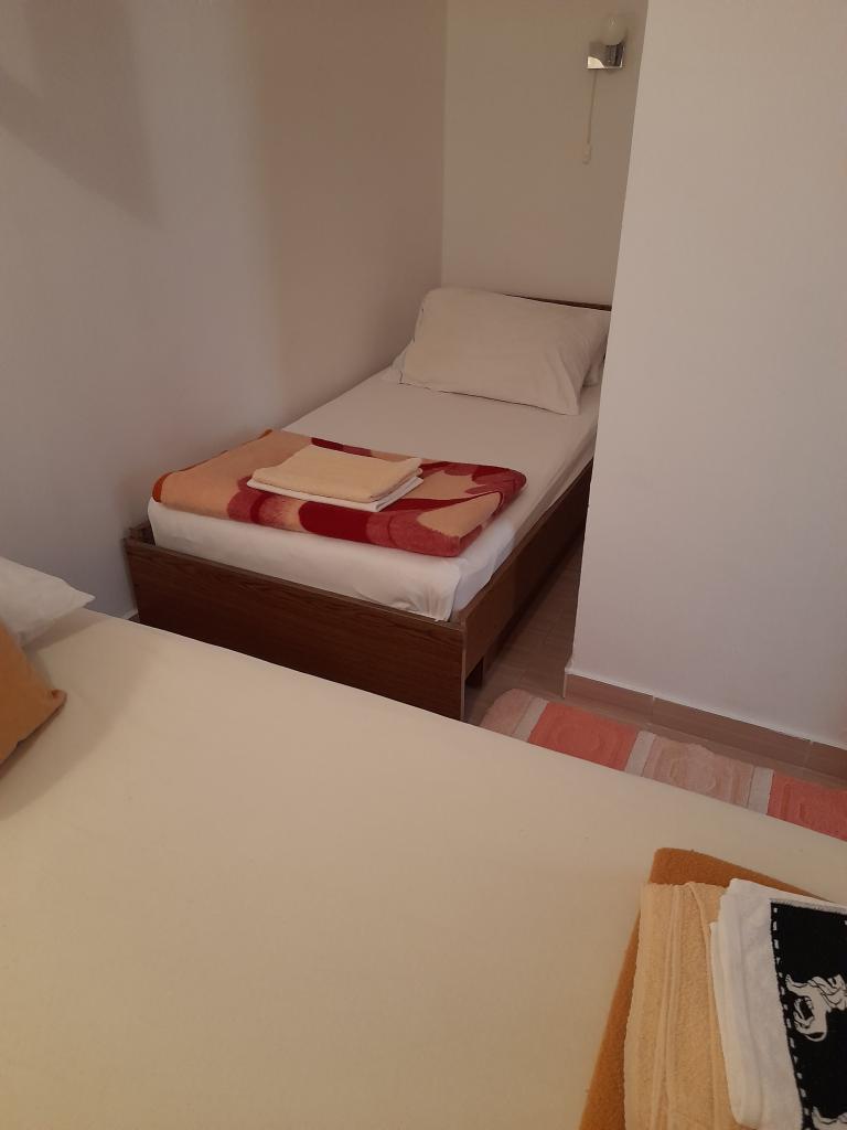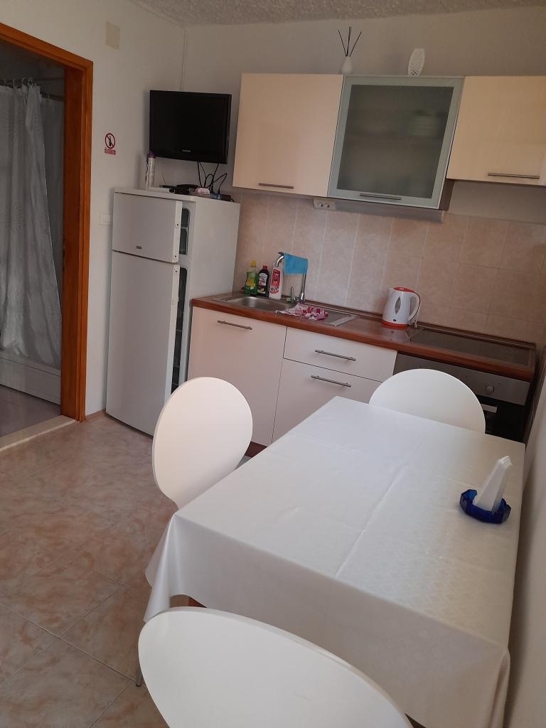 Apartmaji 7 metrov od morja za 7 - 8 oseb na 34 m2 veliki terasi s pogledom na morje. Apartmaji imajo kuhinjo s kuhinjskim in servirnim priborom, dnevno sobo z raztegljivim kavčem za sprostitev ali spanje, satelitsko televizijo, klimatsko napravo, dostop do interneta, 3 spalnice (2 dvoposteljni in 1 troposteljna soba) z brisačami in posteljnino, dodatno ležišče, kopalnico s tušem, straniščem in pralnim strojem, žar. Na terasi je vrtna garnitura za 8 oseb, ležalniki, 2 kolesi, parkirišče, plaža je 7 metrov od apartmaja. Imamo mobilno trgovino (mini bus), ki nas oskrbuje z osnovnimi potrebščinami pred apartmajem. To je idealen kraj za počitnice z otroki, sorodniki ali prijatelji.