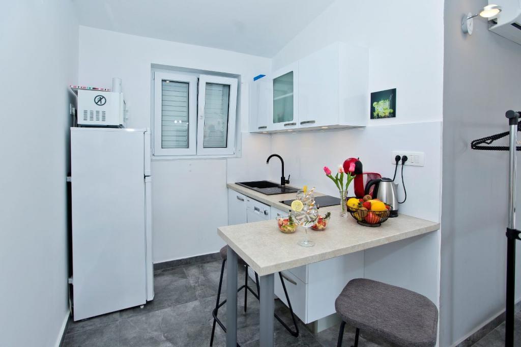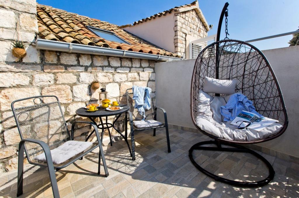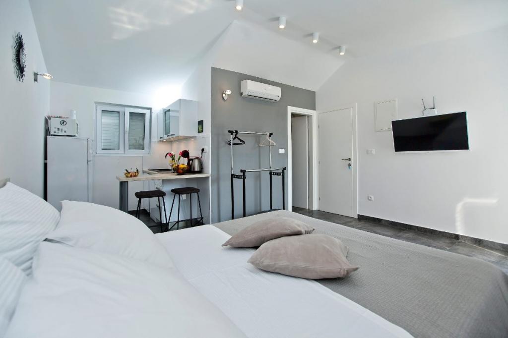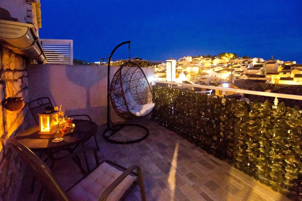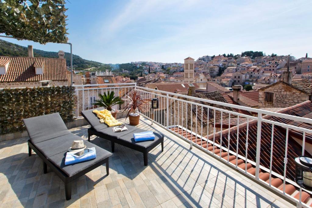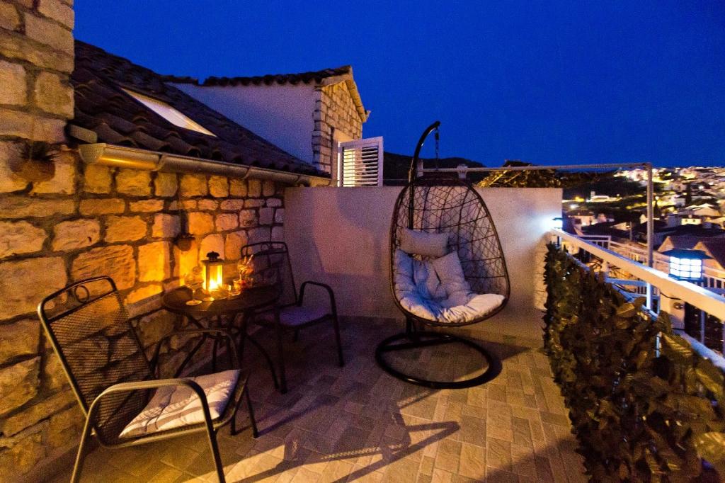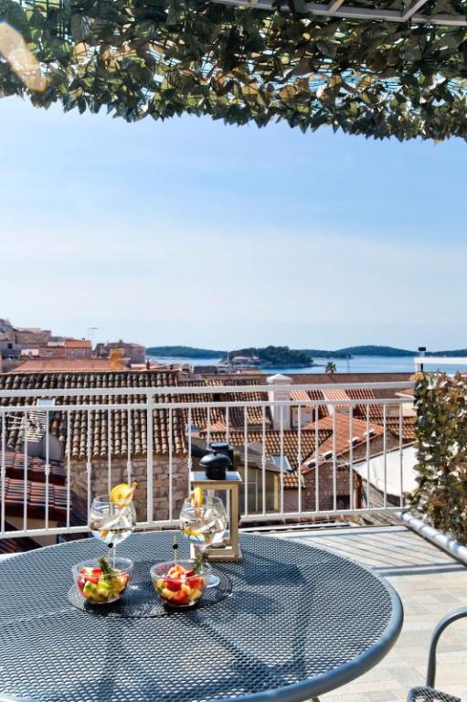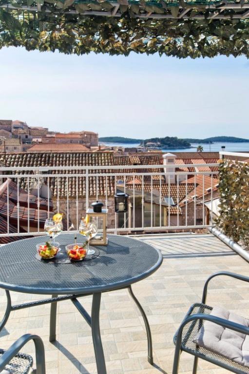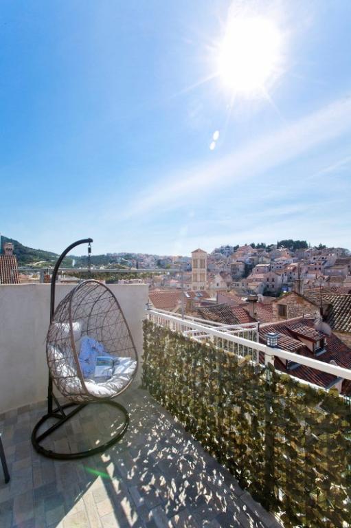 Elegantno opremljeni studio apartmaji, ki se nahajajo v samem središču mesta Hvar, ponujajo popolno kombinacijo udobja in odlične lokacije. Apartmaji so svetli in moderni, opremljeni z udobno zakonsko posteljo (160 × 200), popolnoma opremljenimi kuhinjami z vsemi potrebnimi dodatki (hladilnik z zamrzovalnikom, grelnik vode, opekač kruha, kuhalne plošče, mikrovalovne pečice, pomivalni stroji), kopalnicami s tušem, klimatsko napravo in obema z zasebnima terasama (zunanja miza, stoli in ležalniki), ki ponujajo očarljiv razgled na staro mestno jedro in čudovito hvarsko pristanišče. Doživite najboljše od Hvara dobesedno pred vašim pragom: očarljive kavarne, vrhunske restavracije, prijetni zajtrkovalnice, lokalni butiki in trgovine s spominki. Glavni mestni trg s katedralo sv. Štefana in najstarejšim javnim gledališčem v Evropi sta oddaljena le 3 minute hoje od vaših vrat. Bivali boste v samem središču Hvara, a hkrati v popolnoma odmaknjeni ulici, ki zagotavlja miren in prijeten nočni počitek.