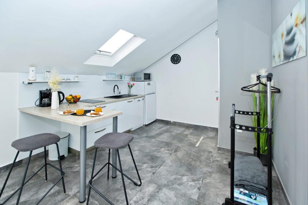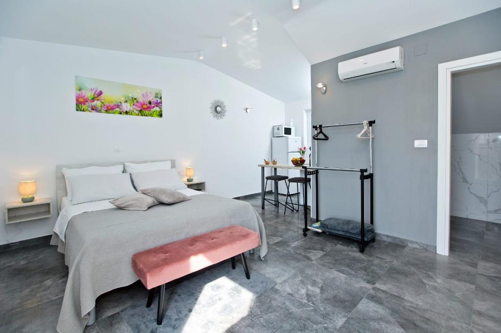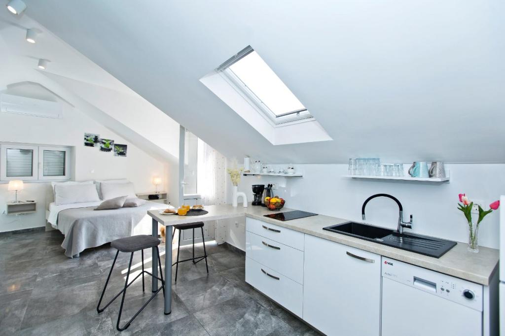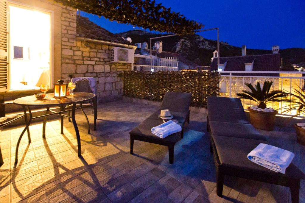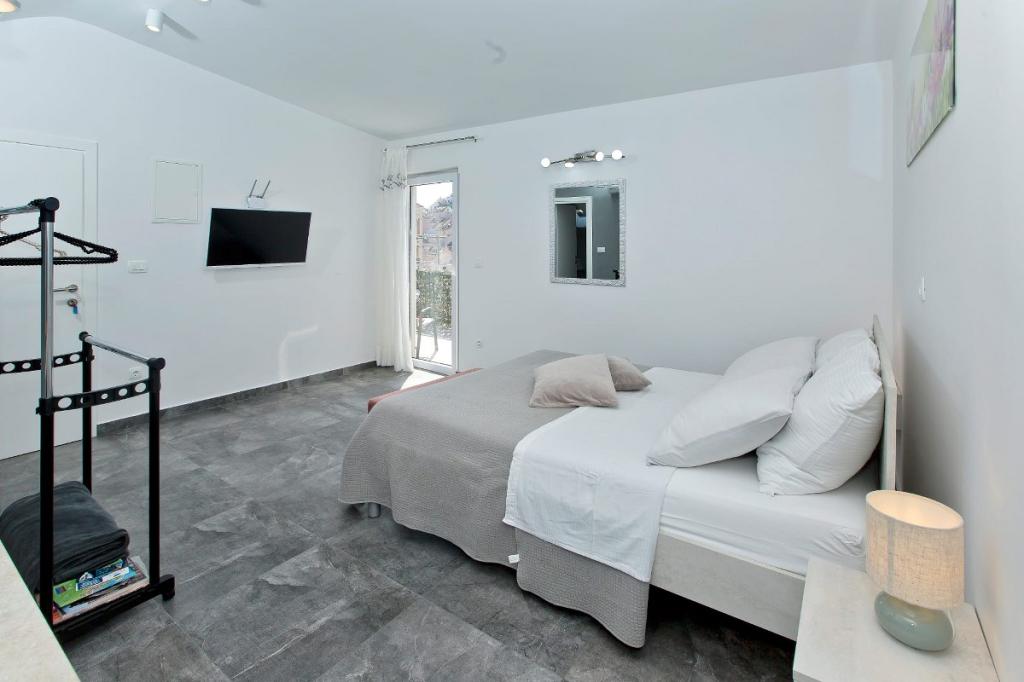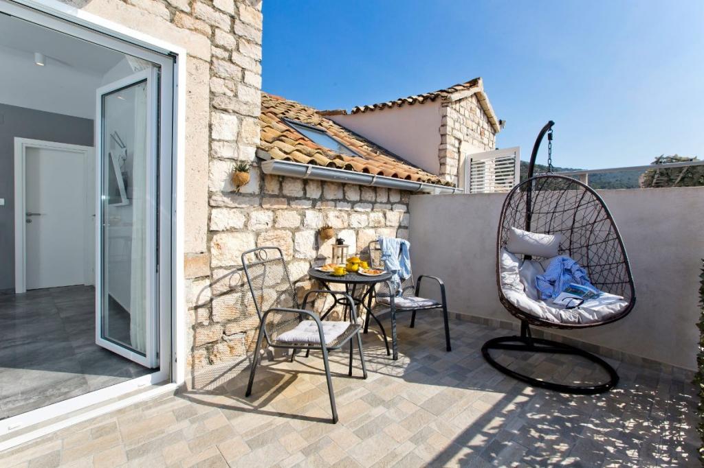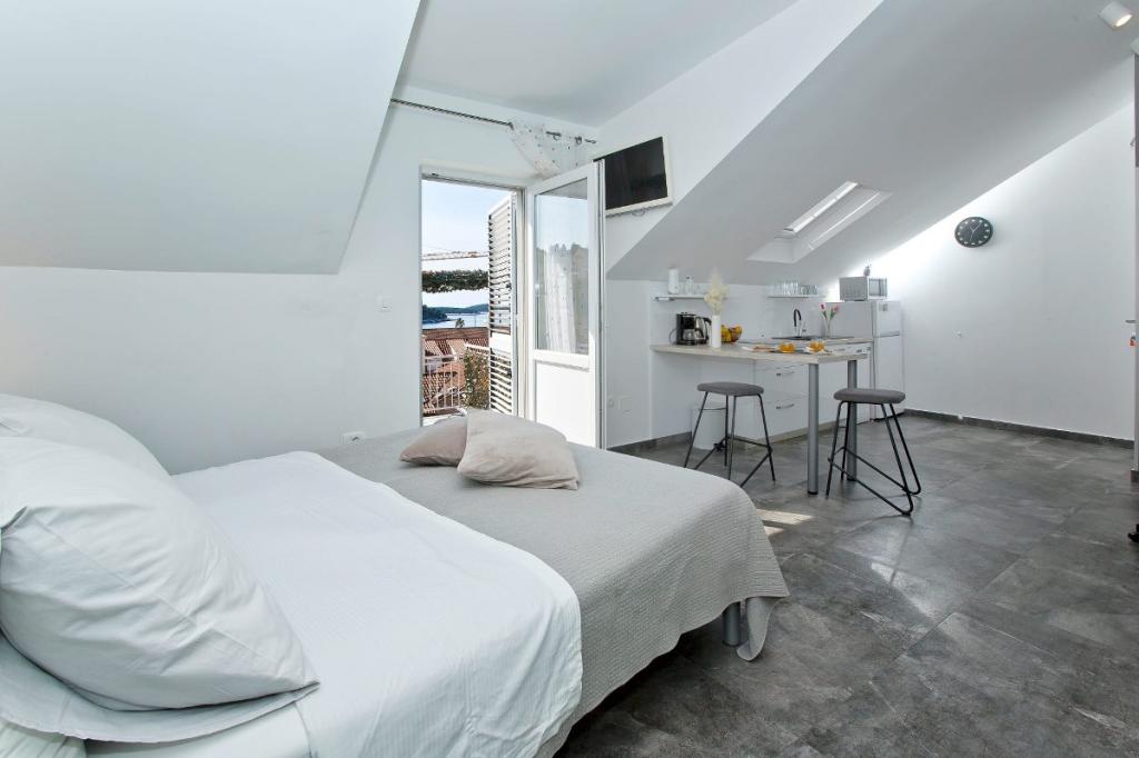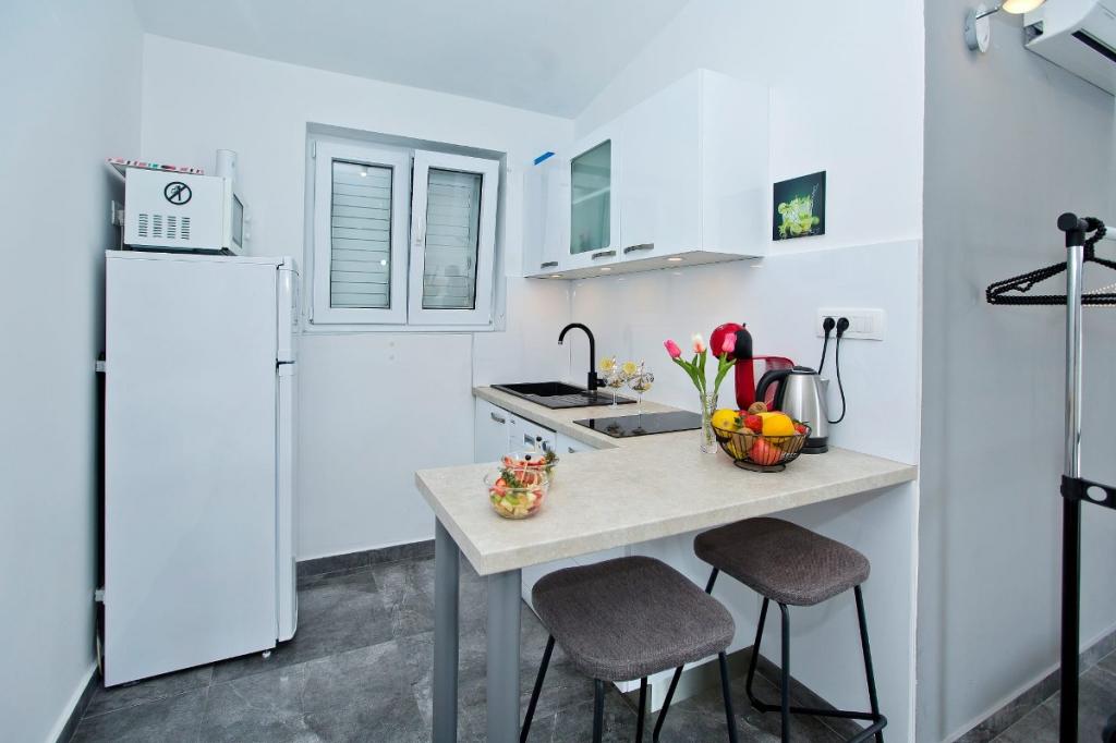 Elegantno opremljeni studio apartmaji, ki se nahajajo v samem središču mesta Hvar, ponujajo popolno kombinacijo udobja in odlične lokacije. Apartmaji so svetli in moderni, opremljeni z udobno zakonsko posteljo (160 × 200), popolnoma opremljenimi kuhinjami z vsemi potrebnimi dodatki (hladilnik z zamrzovalnikom, grelnik vode, opekač kruha, kuhalne plošče, mikrovalovne pečice, pomivalni stroji), kopalnicami s tušem, klimatsko napravo in obema z zasebnima terasama (zunanja miza, stoli in ležalniki), ki ponujajo očarljiv razgled na staro mestno jedro in čudovito hvarsko pristanišče. Doživite najboljše od Hvara dobesedno pred vašim pragom: očarljive kavarne, vrhunske restavracije, prijetni zajtrkovalnice, lokalni butiki in trgovine s spominki. Glavni mestni trg s katedralo sv. Štefana in najstarejšim javnim gledališčem v Evropi sta oddaljena le 3 minute hoje od vaših vrat. Bivali boste v samem središču Hvara, a hkrati v popolnoma odmaknjeni ulici, ki zagotavlja miren in prijeten nočni počitek.