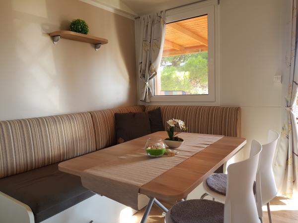 Preberite več Namestitvene enoteRezervacija je potrjena po plačilu akontacije 20% celotnega zneska. Cena vključuje: 4 plus 1 osebo, parkirno mesto za 1 avto, dostop do interneta, klimo, posteljnino in brisače (menjava 8. dan dopusta), elektriko, plin, vodo. Cena ne vključuje: končnega čiščenja 50 eur, turistične takse in enkratne prijave na recepciji kampa. Menjava gostov vsak dan: prijava od 14. ure/odjava do 10. ure. Minimalno bivanje v sezoni je 7 noči. Minimalno bivanje izven sezone je 3 noči.